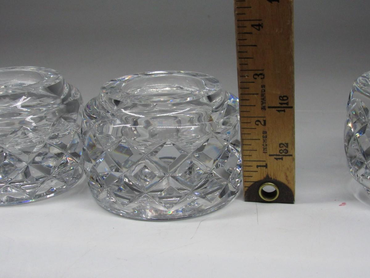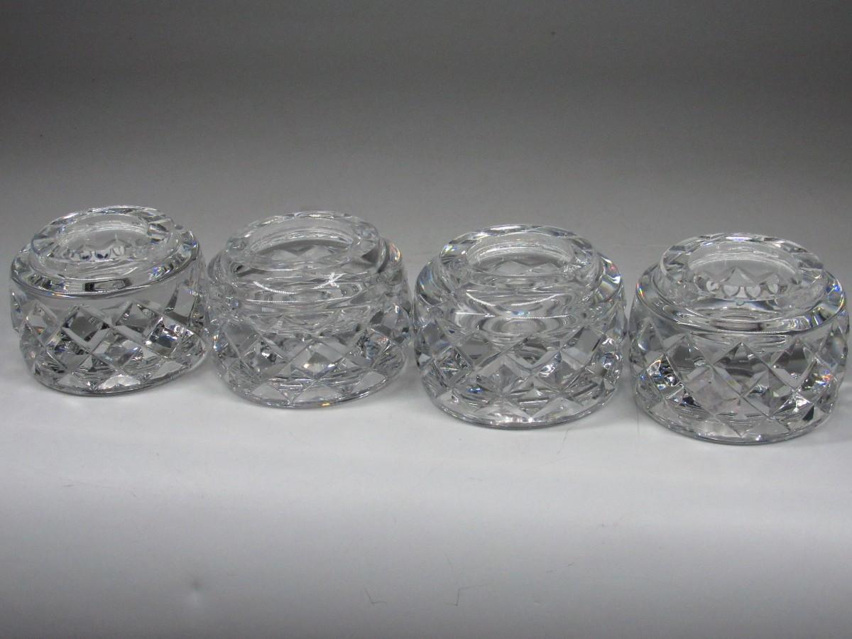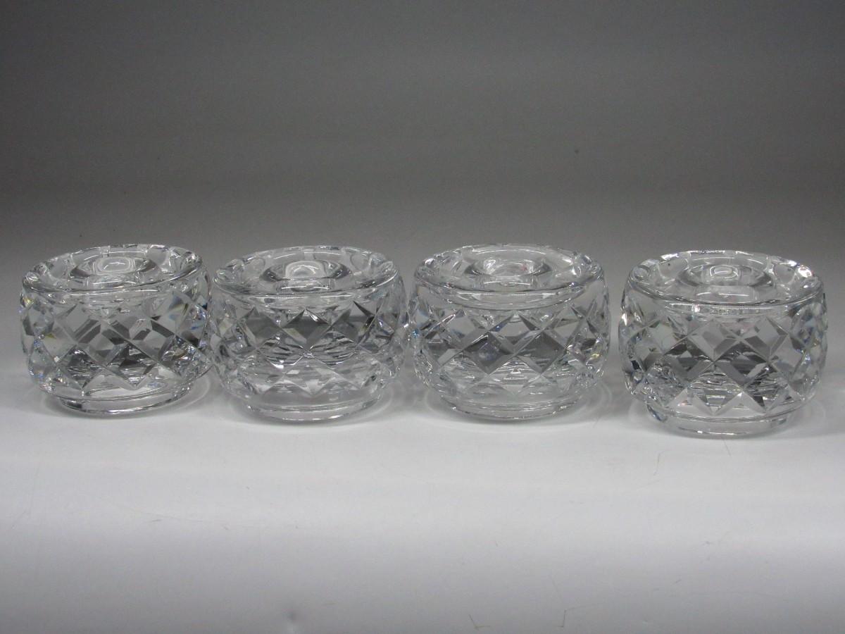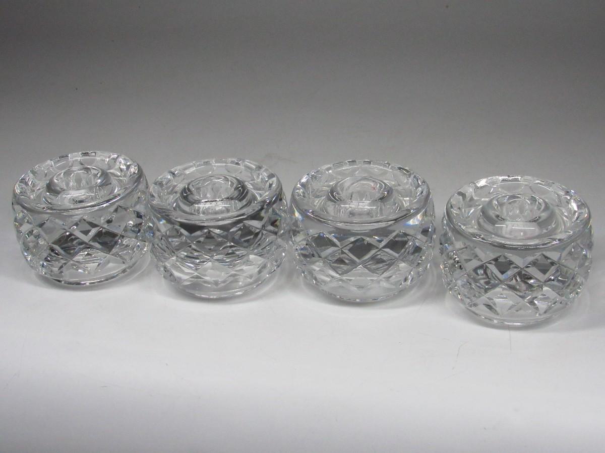 Set of Four Heavy Cut Crystal Candlestick Holders. In good condition. About 3" size. Marked Waterford along bottom edge.