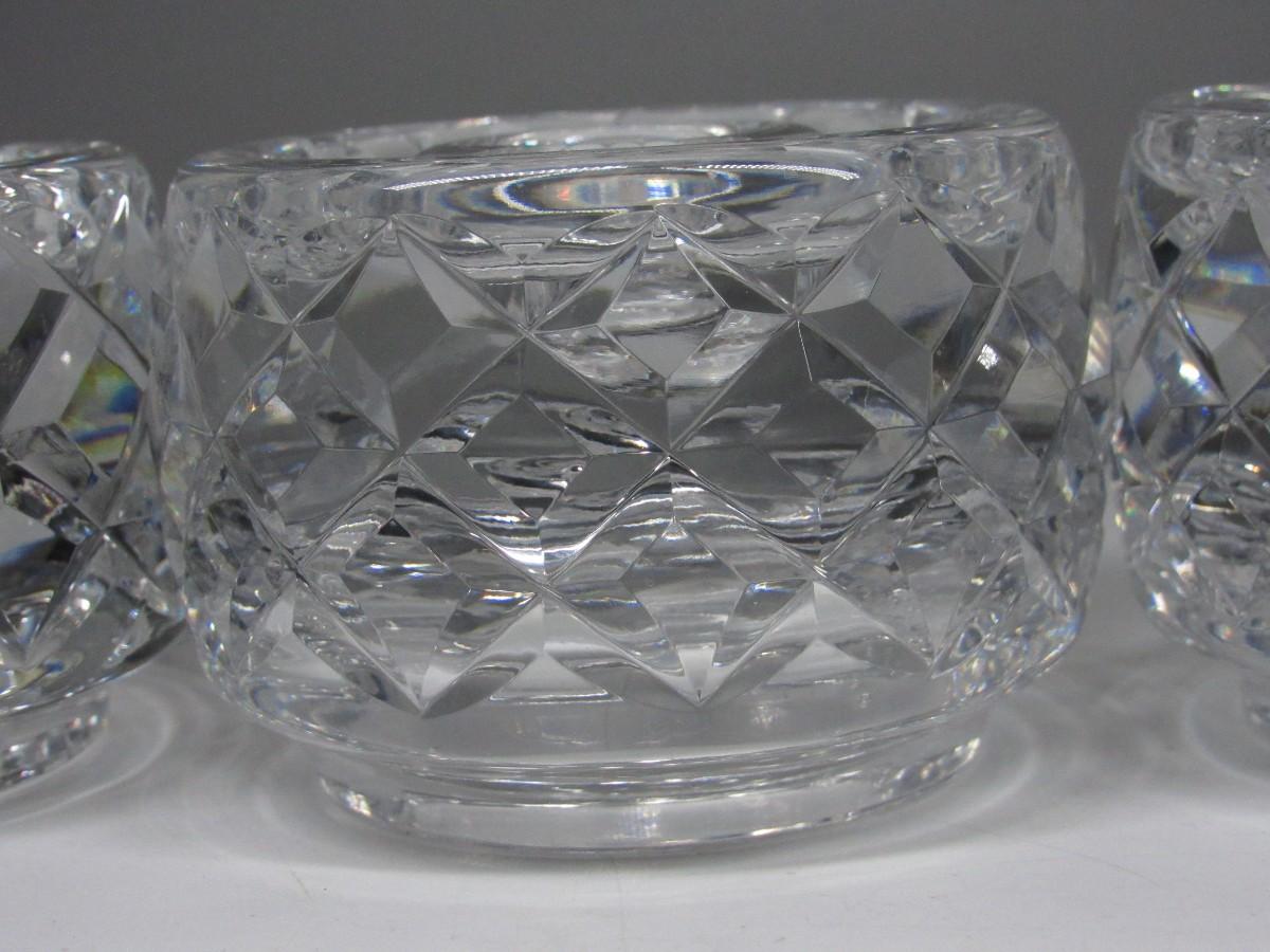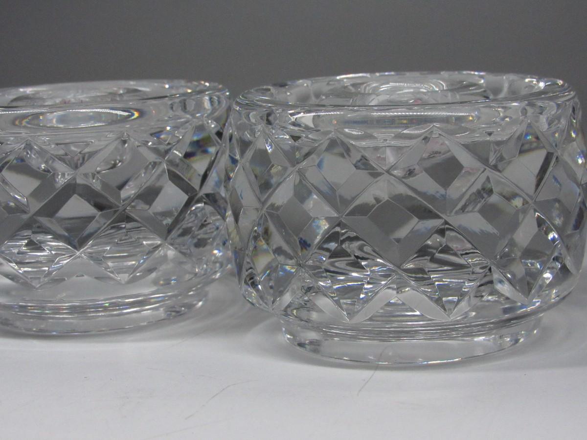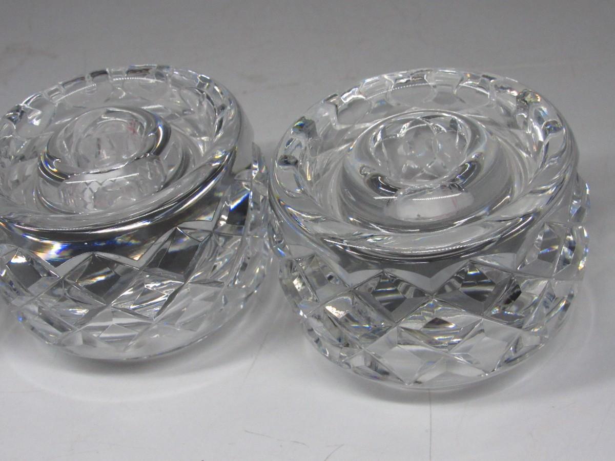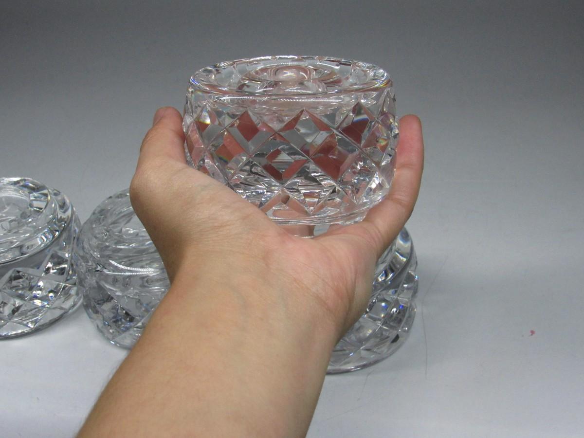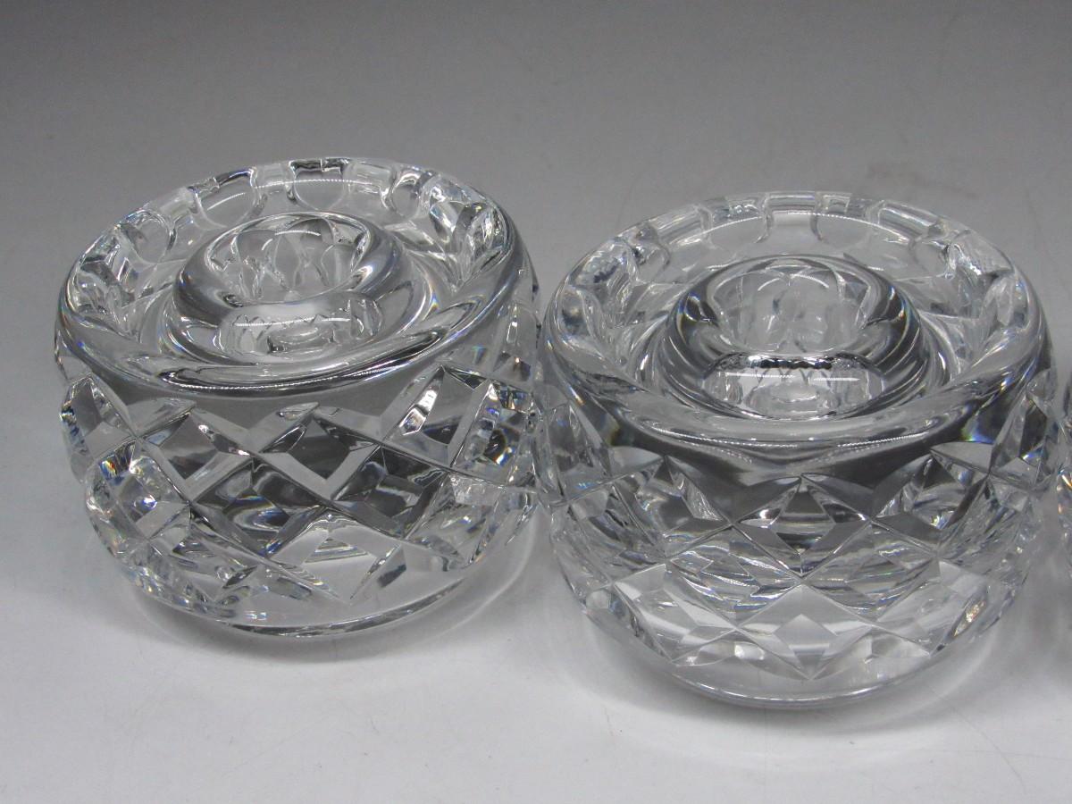 Set of Four Heavy Cut Crystal Candlestick Holders. In good condition. About 3" size. Marked Waterford along bottom edge.