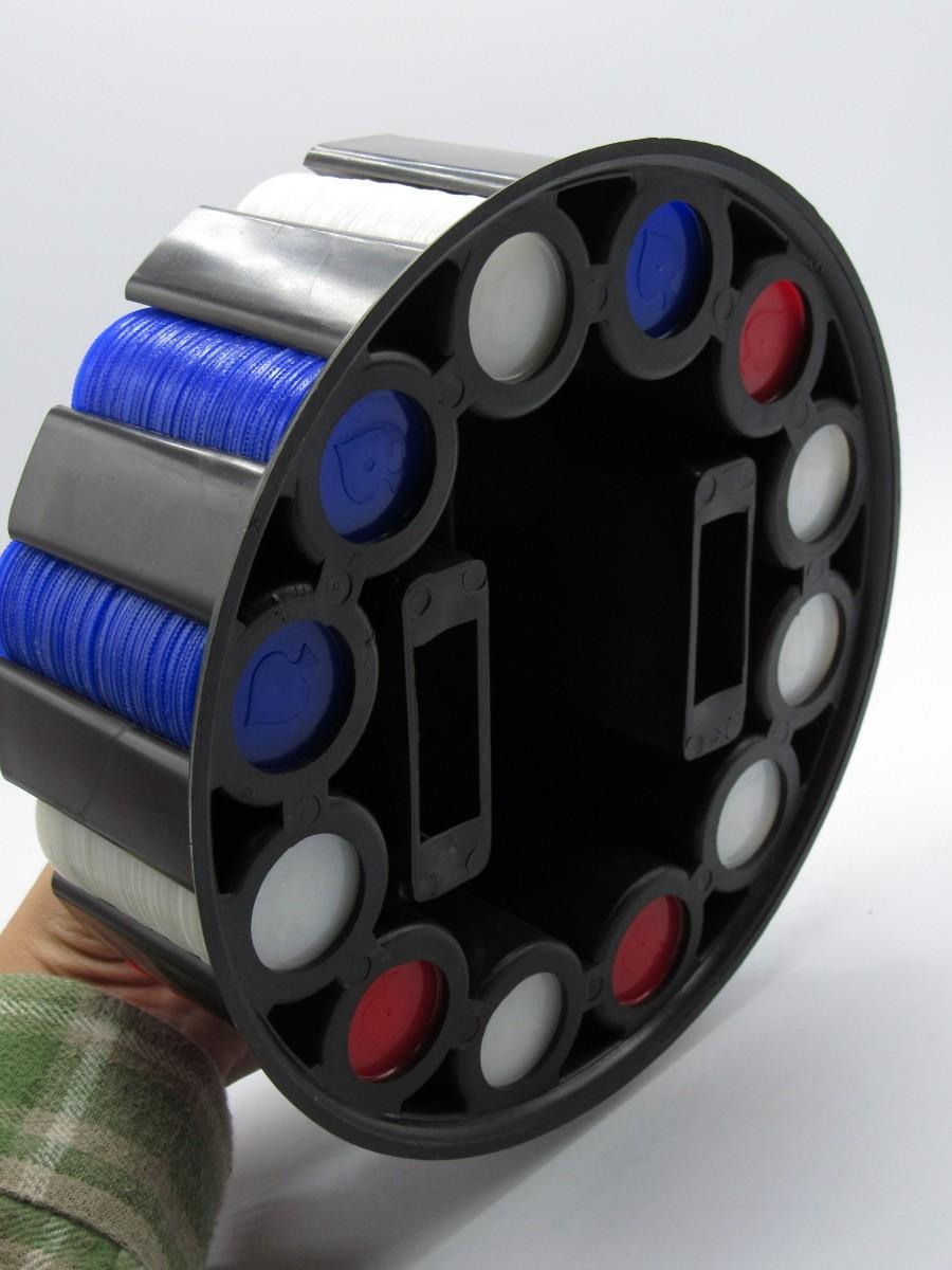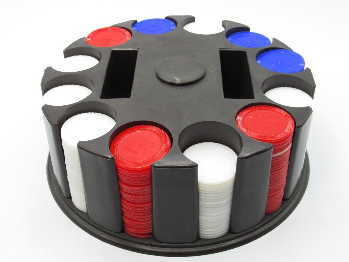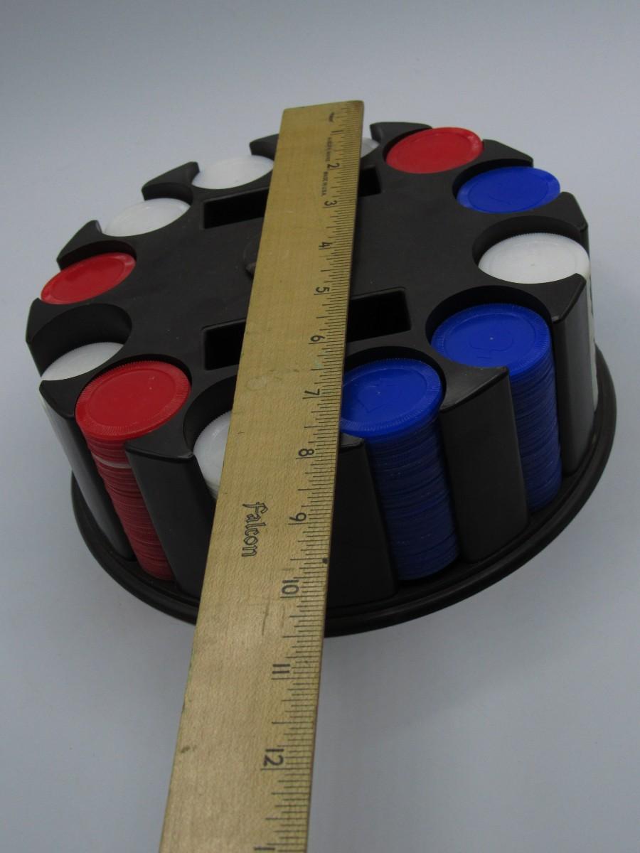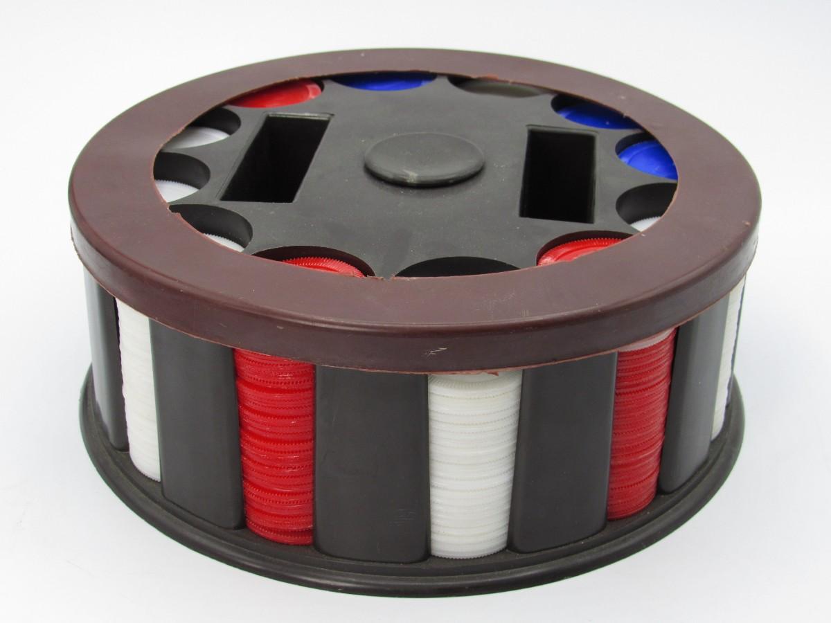 Comes with a plastic top that holds the chips in place. There are some chips that are missing from their slots, but the majority of the chips are there. Check pictures for details.