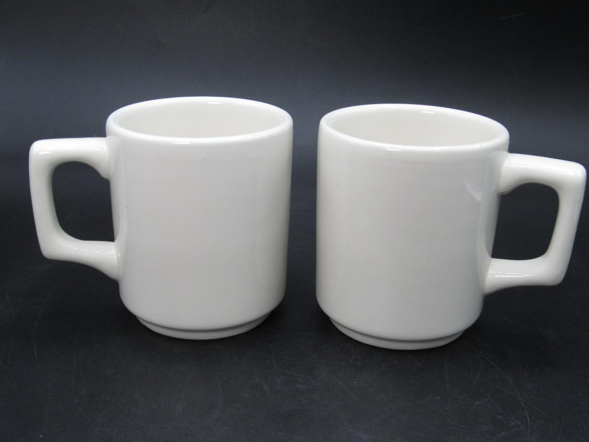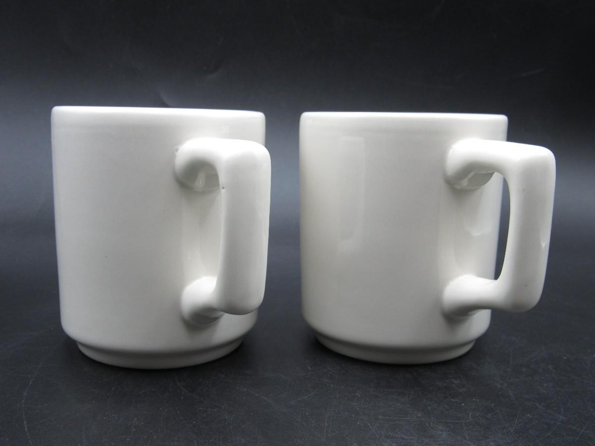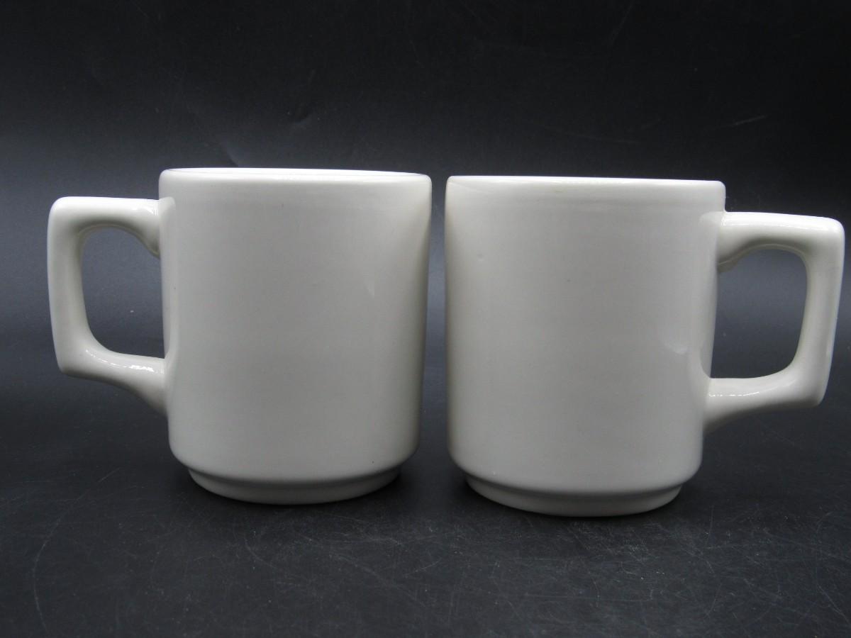 Pair of Retro Buffalo China Restaurant Ware White Ceramic Classic MCM Coffee Mug Cups Squared Handles