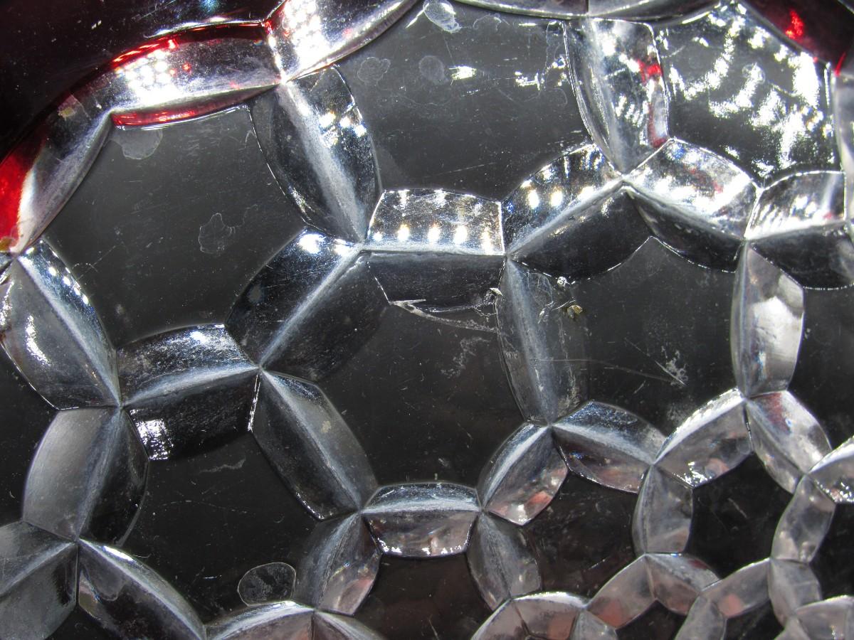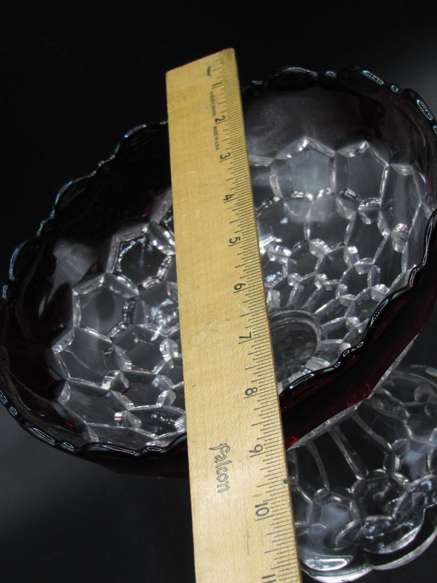Vintage Ruby Red Edged Footed Pedestal Compote Candy Dish Bowl. In good condition. Deep ruby red on clear glass. Hexagon patterned glass bowl and foot. About 7" size.
