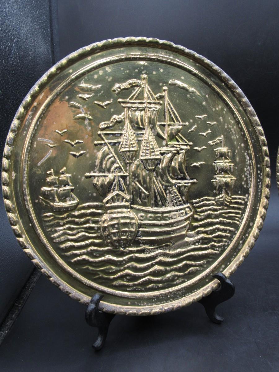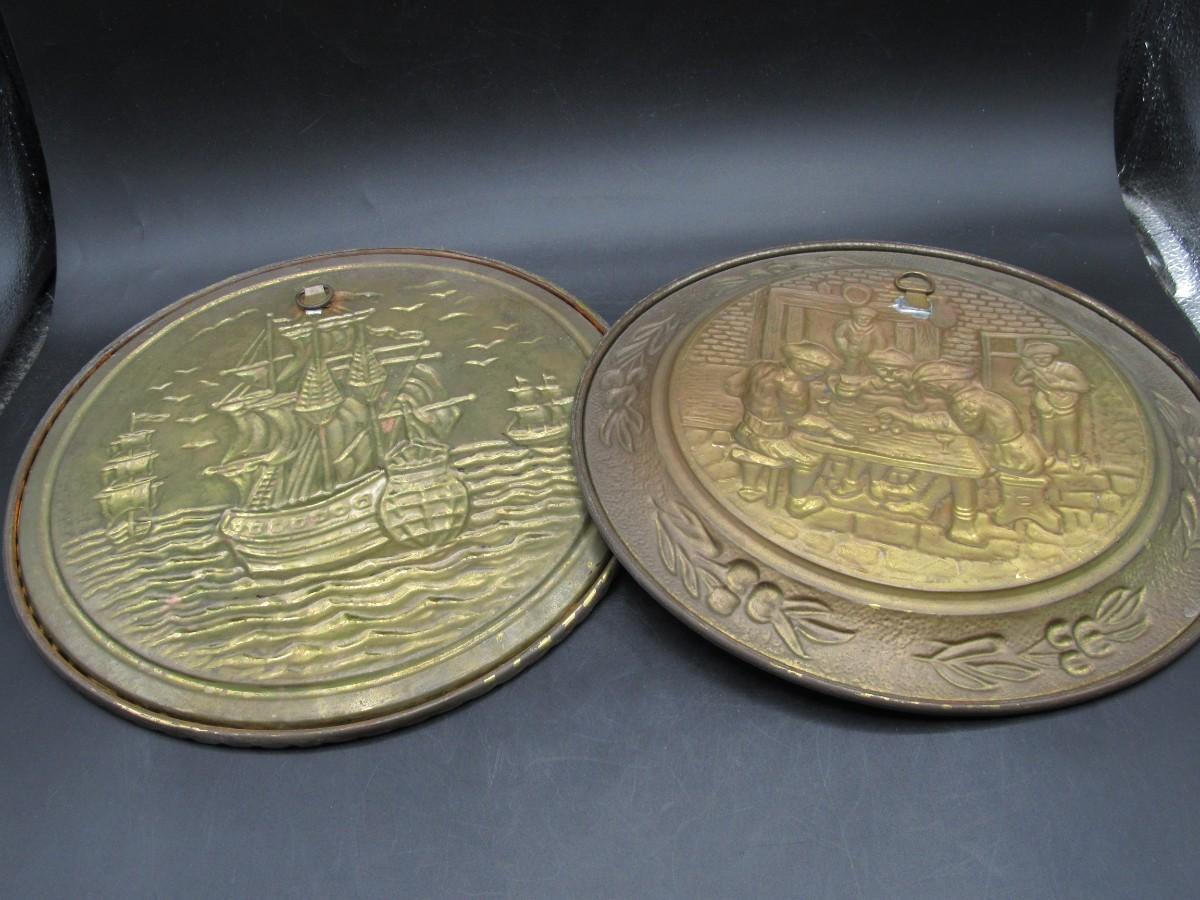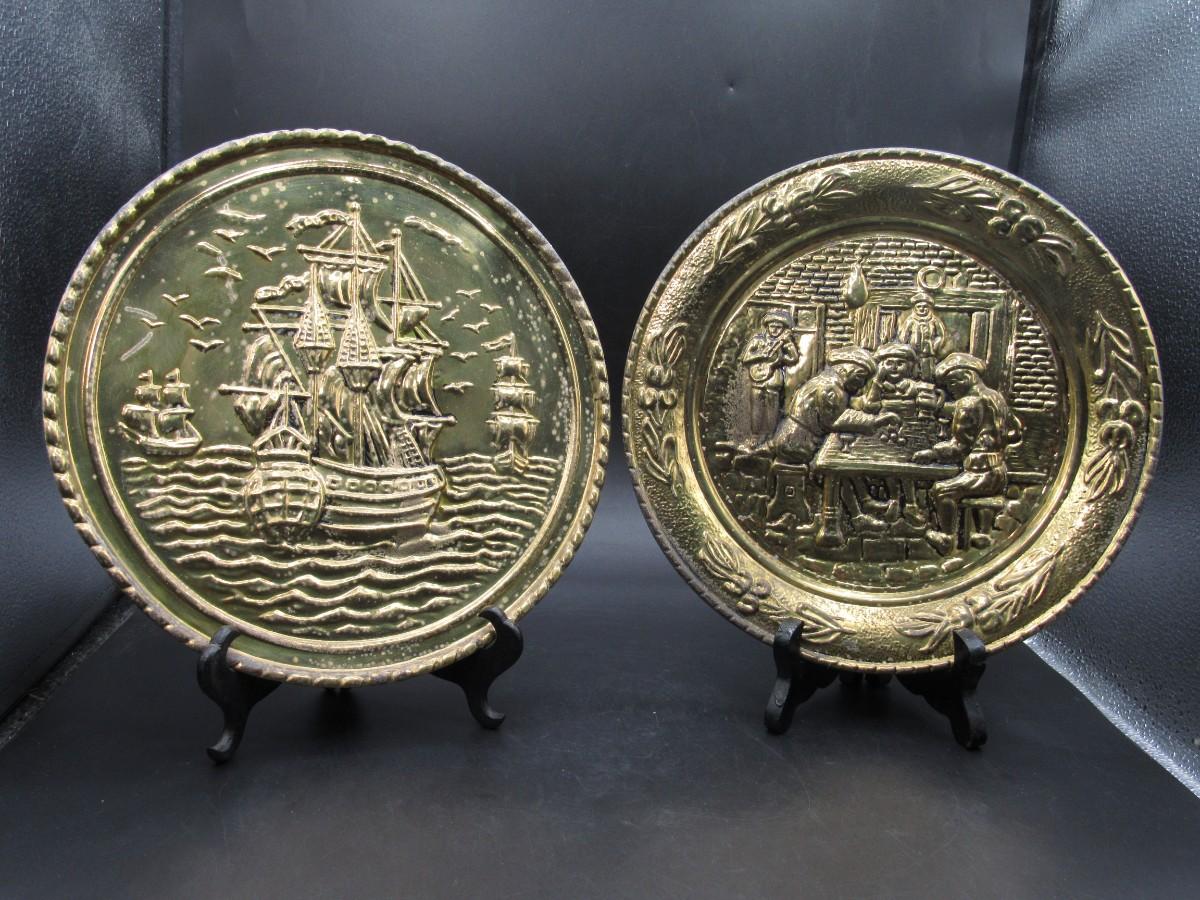 Pair of Vintage Embossed Hammered Brass Art Wall Medallions Sailing Ships and Pub Scene