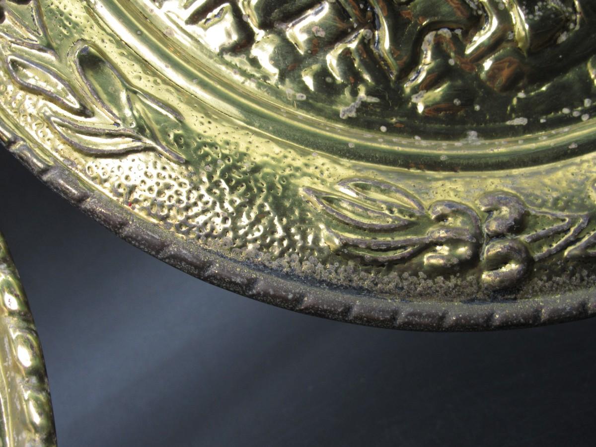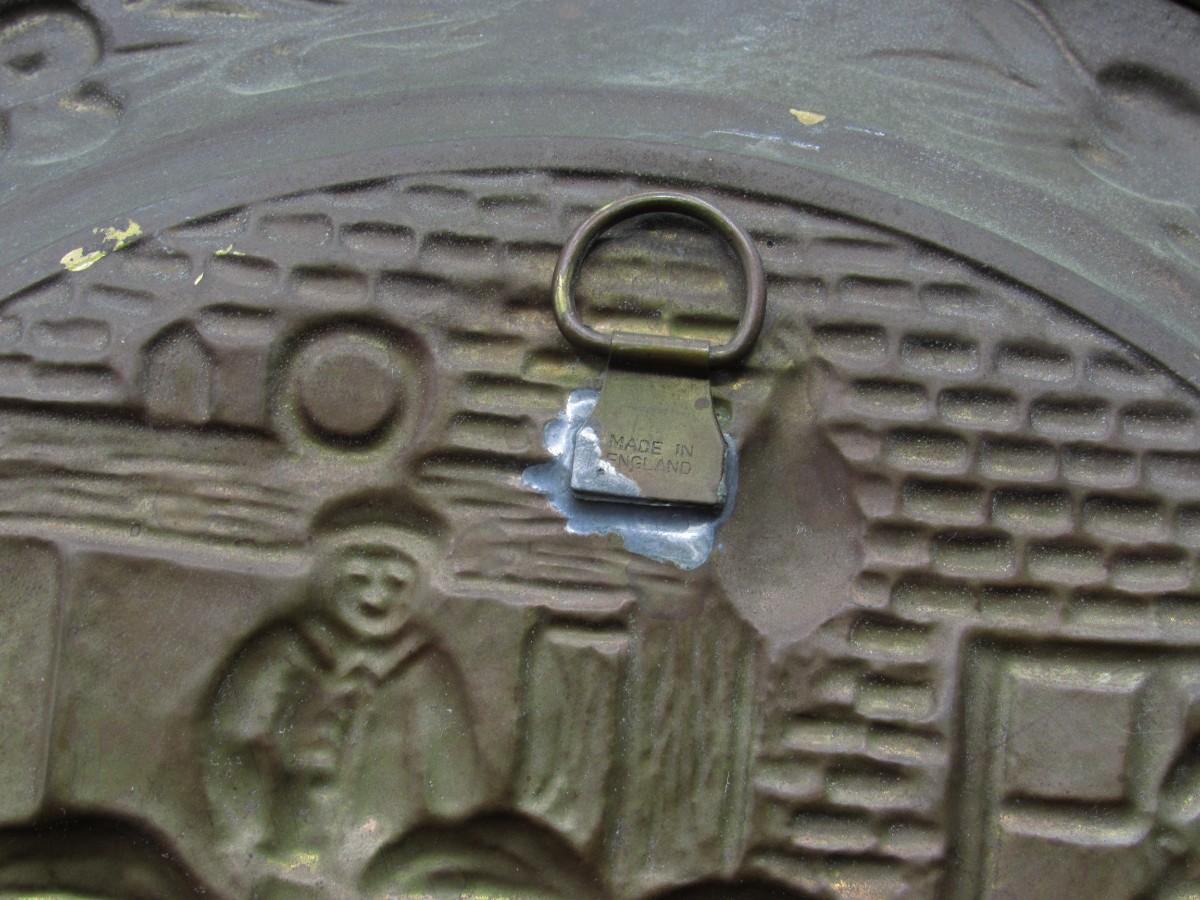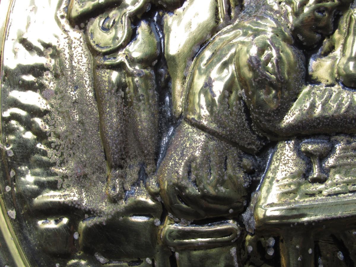 Pair of Vintage Embossed Hammered Brass Art Wall Medallions Sailing Ships and Pub Scene