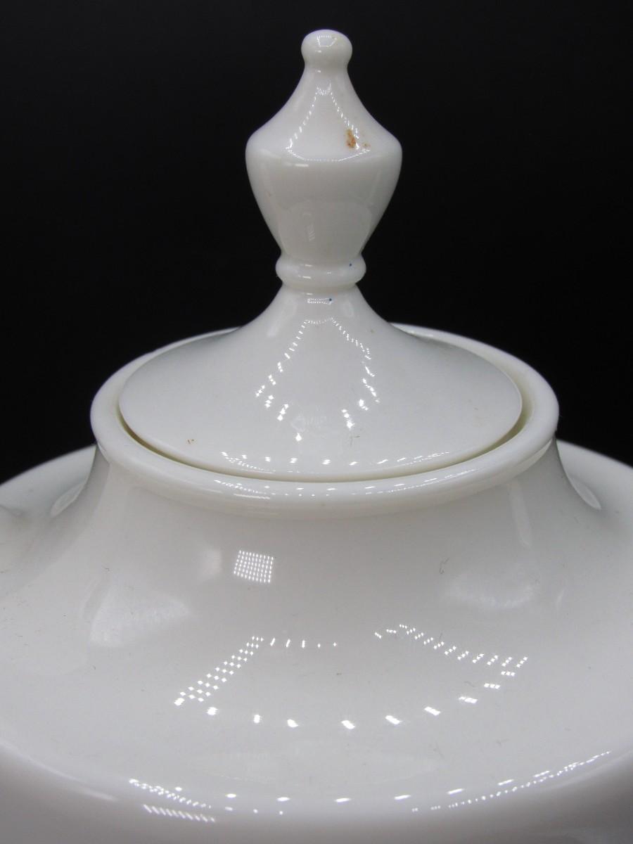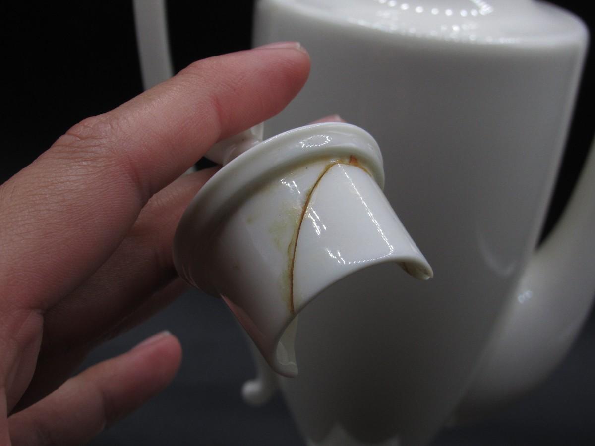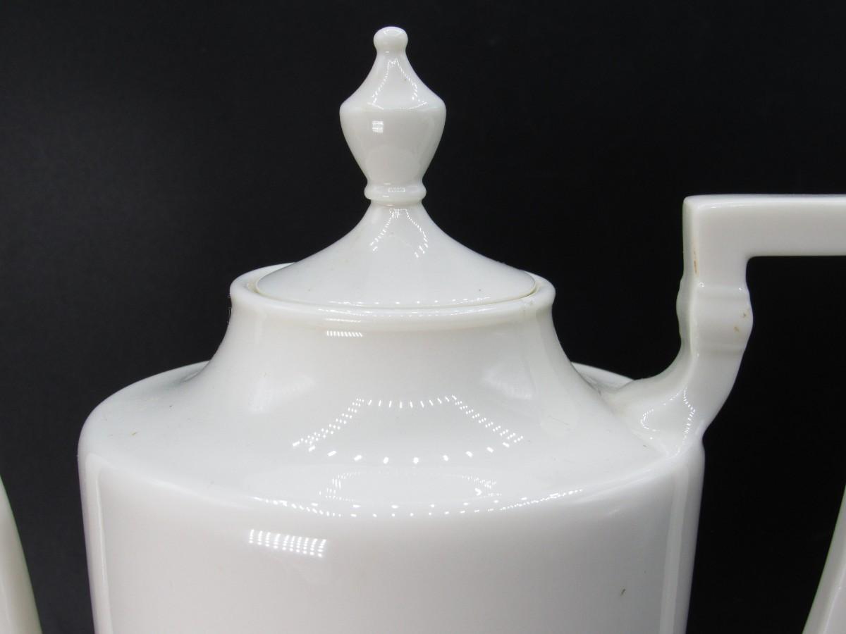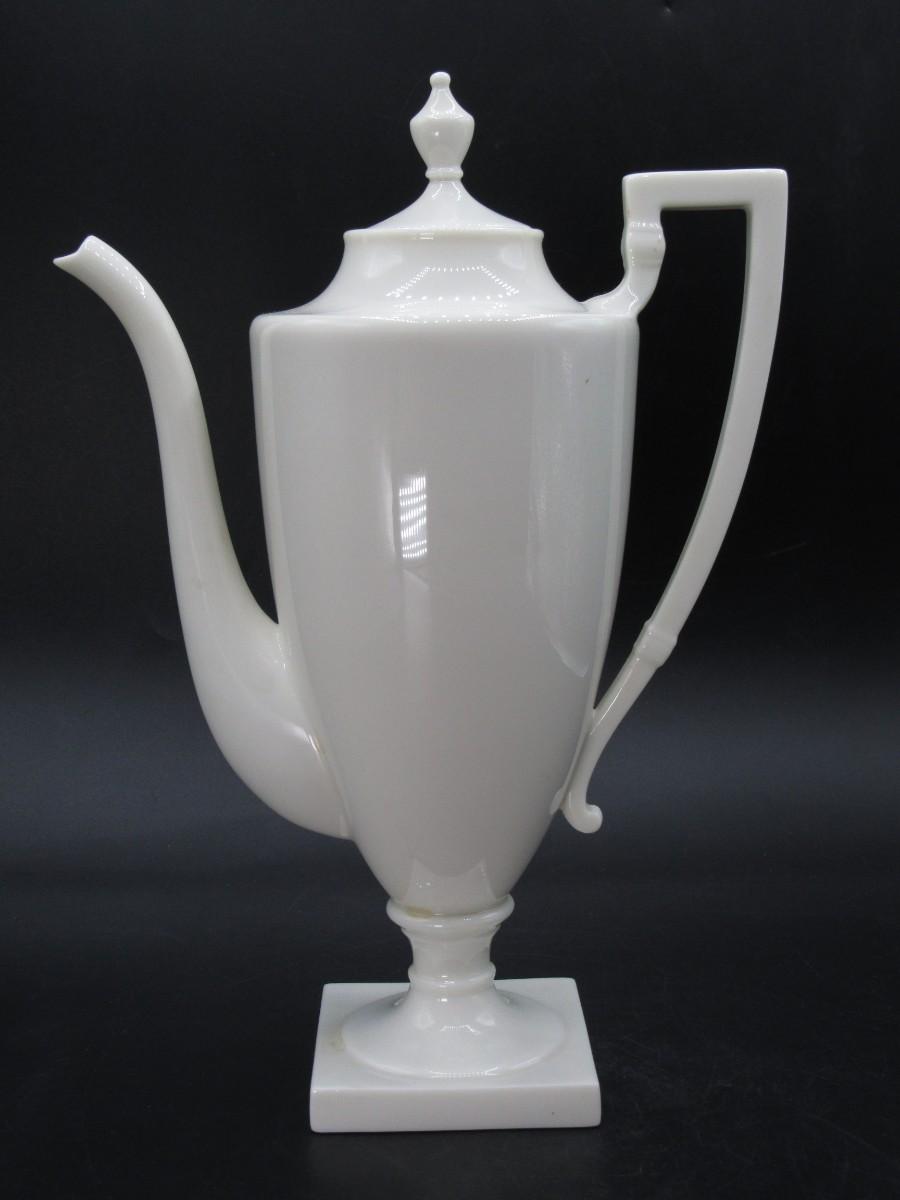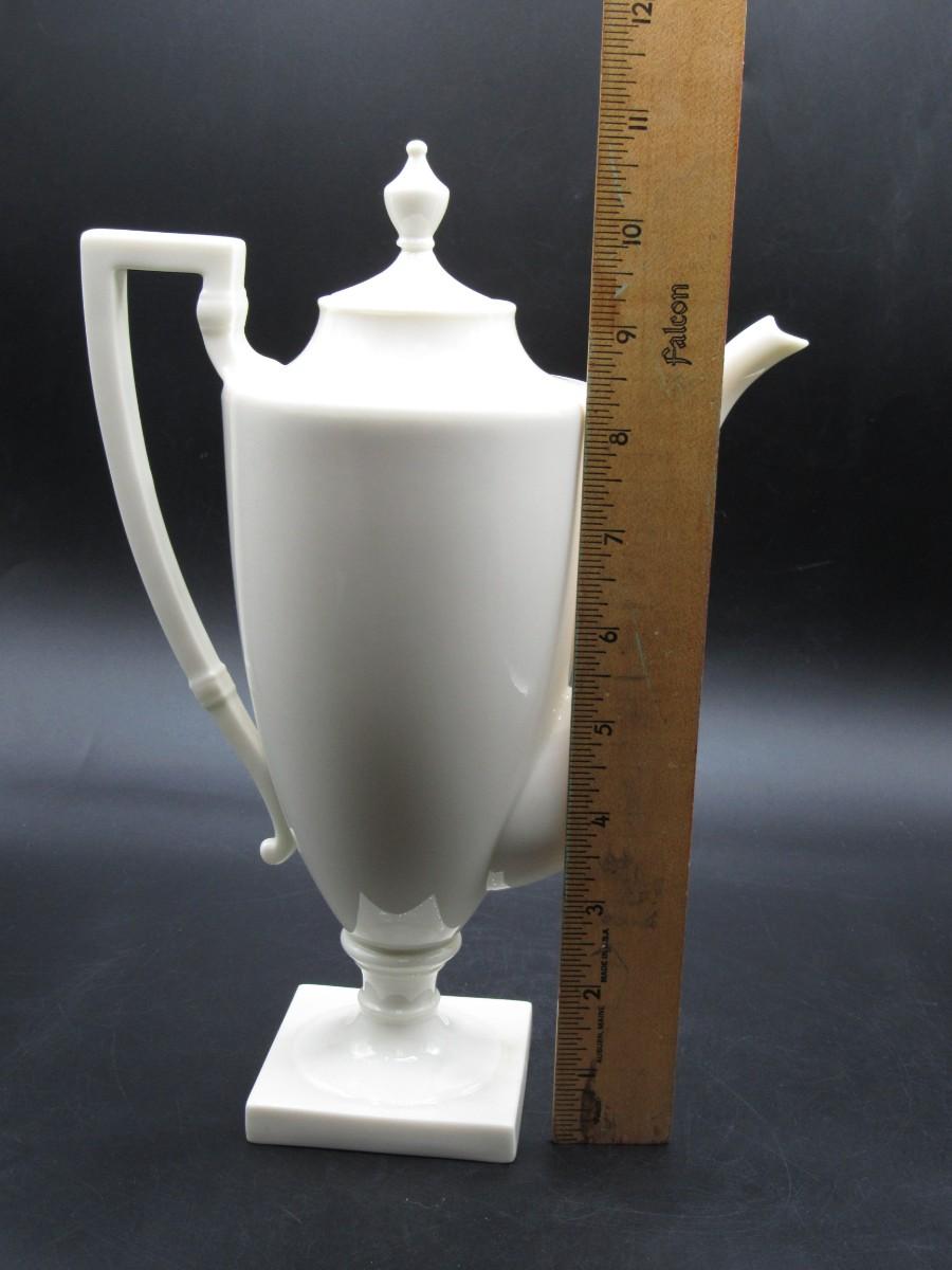 Vintage White Lenox China Footed Teapot Coffee Pot. In used condition. There is damage inside the lid, not seen when on the teapot. About 10" tall. Displays nicely. Has a green Lenox stamp on the bottom.