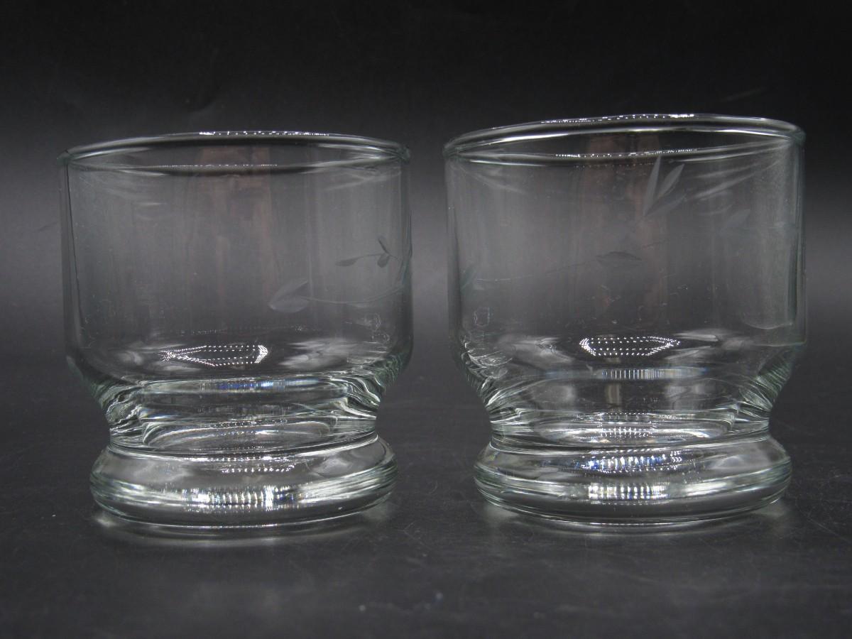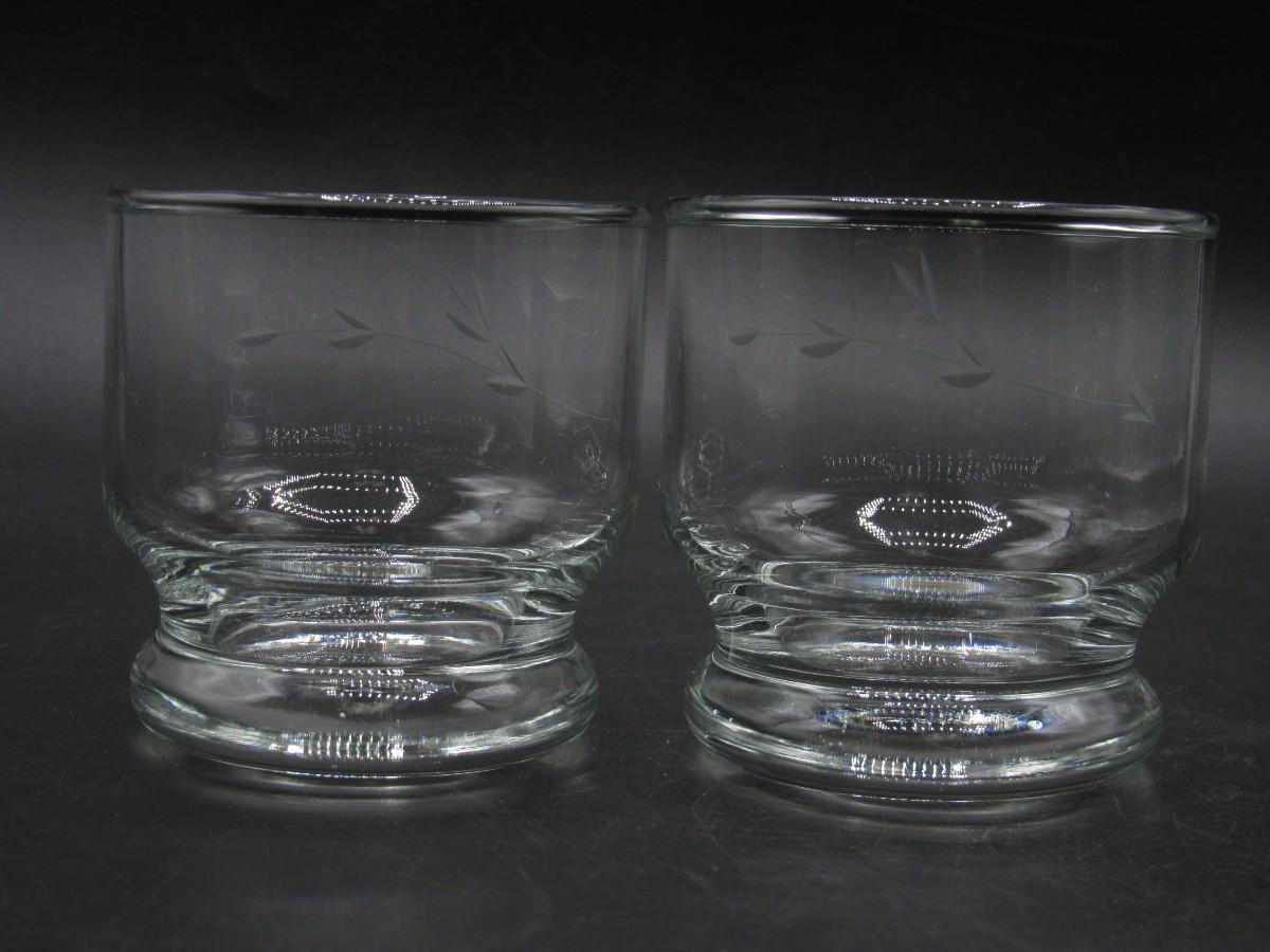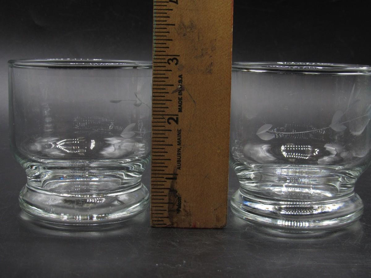 Pair of Vintage Flower Vine Etched Rocks Lowball Juice Glasses. In good condition. 3" size.