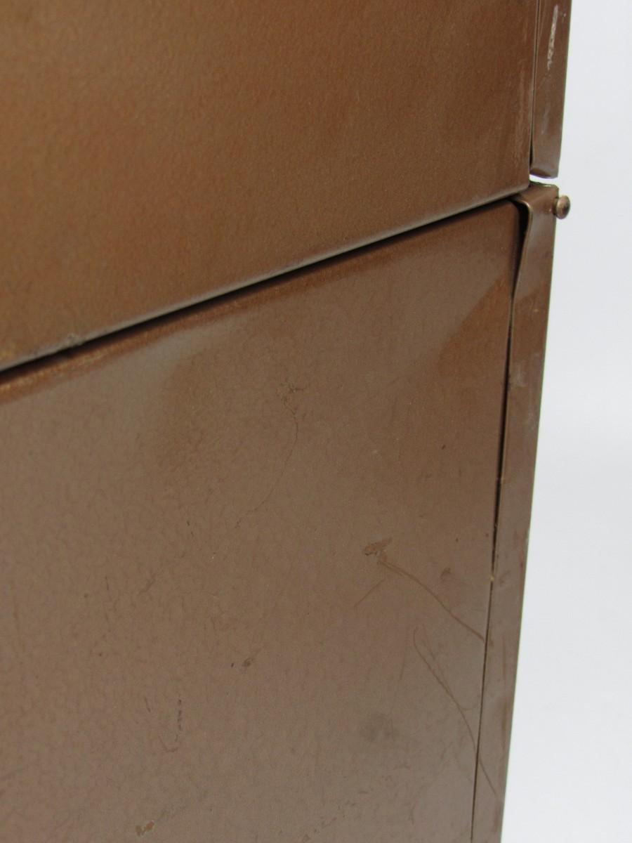 There is noticeable wear and bending to the box, but there is no significant damage and in overall fair condition. There is no key for the lock.
