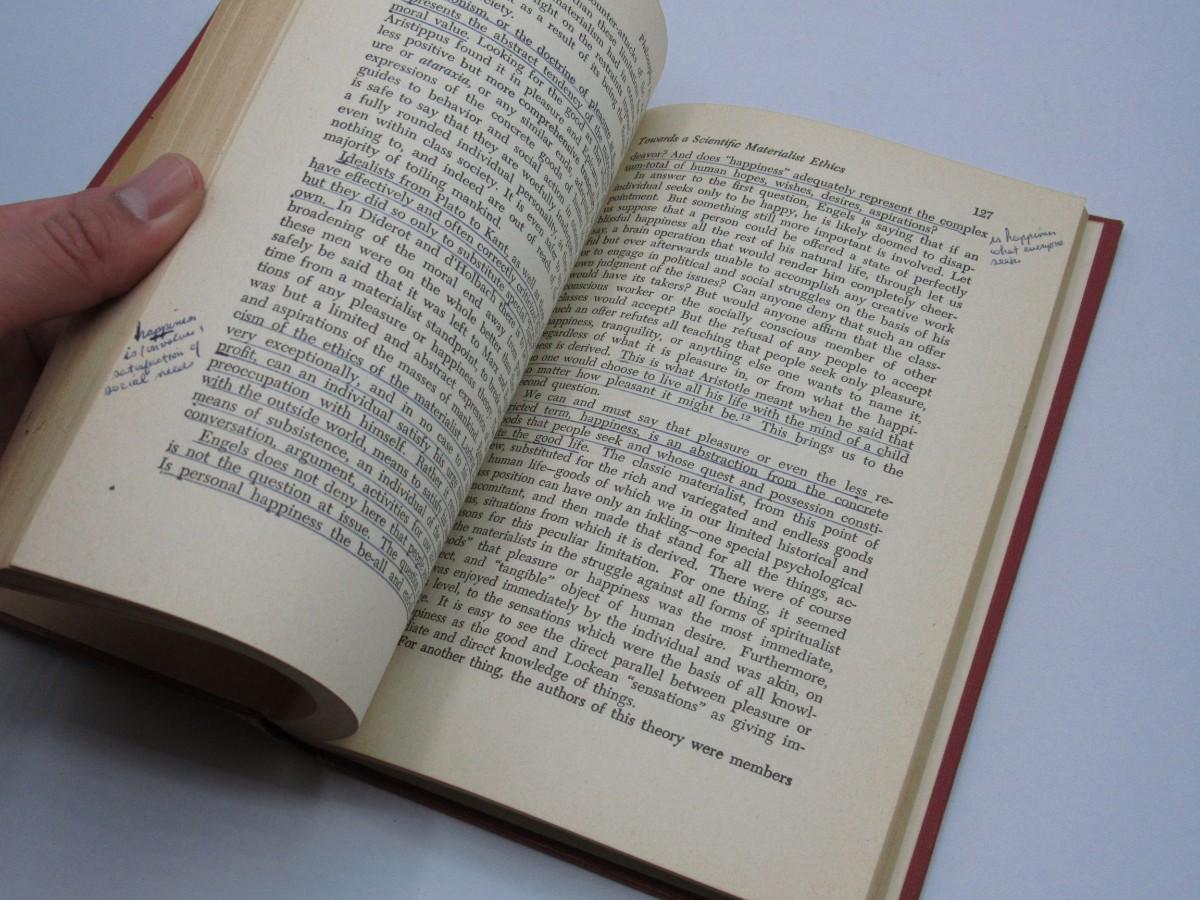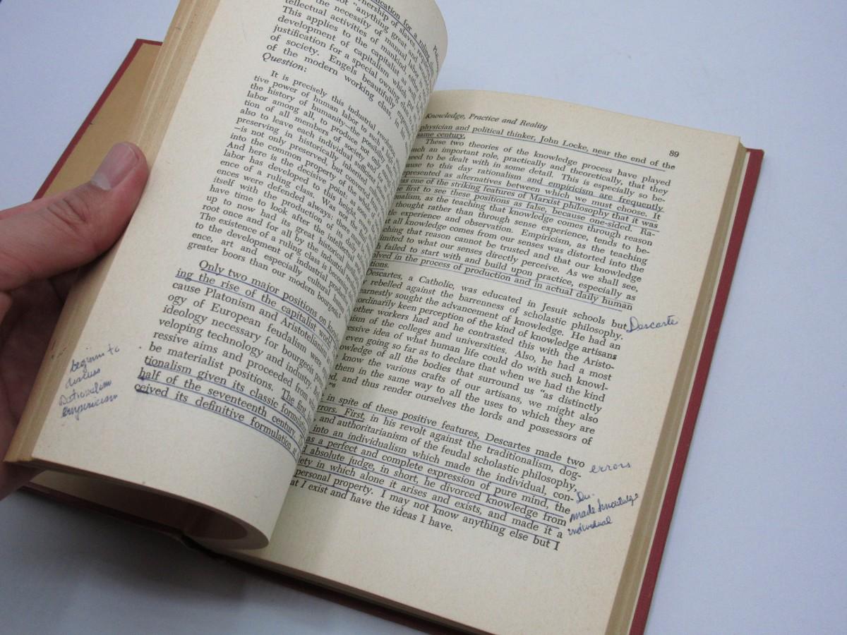 There is some wear to the front and back cover of the book, there is also underlining and handwritten notes on most of the pages. In overall fair condition.