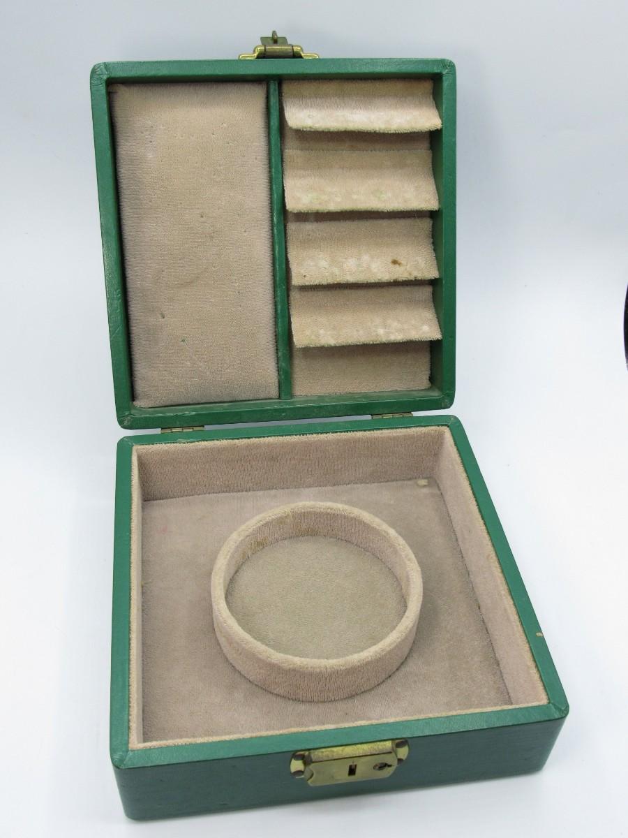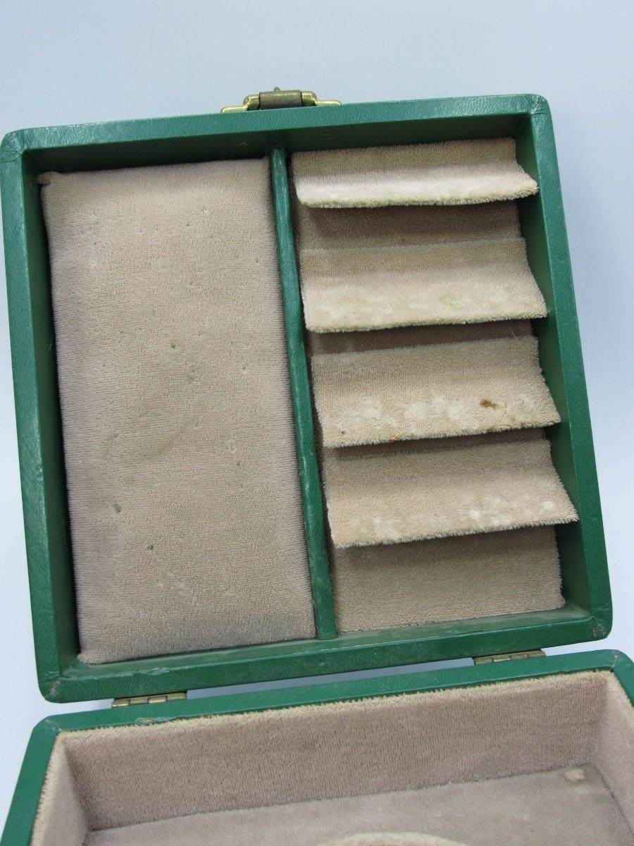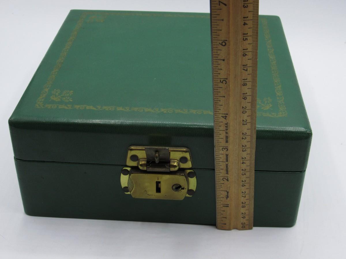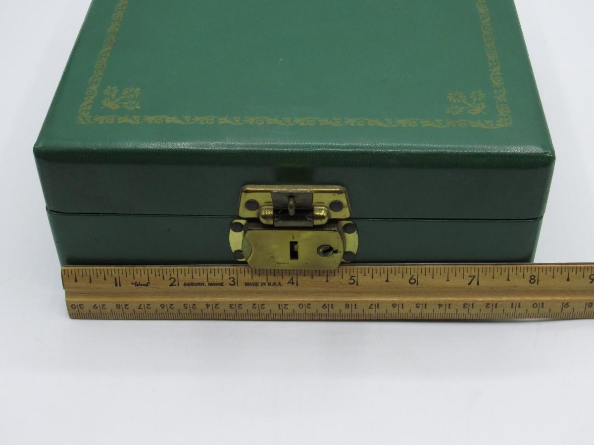 There are signs of wear and use to the jewelry box, but there is no significant damage and is in good collectible or useable condition. Does not come with the key.