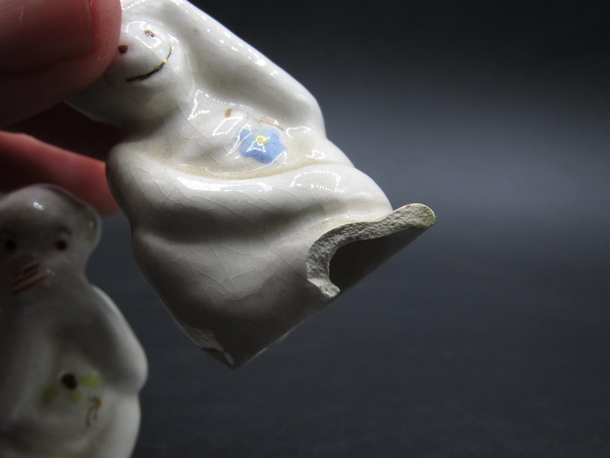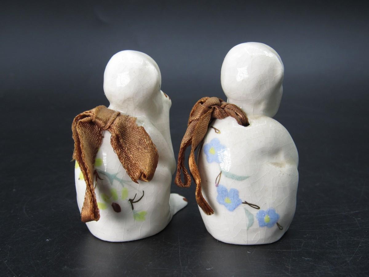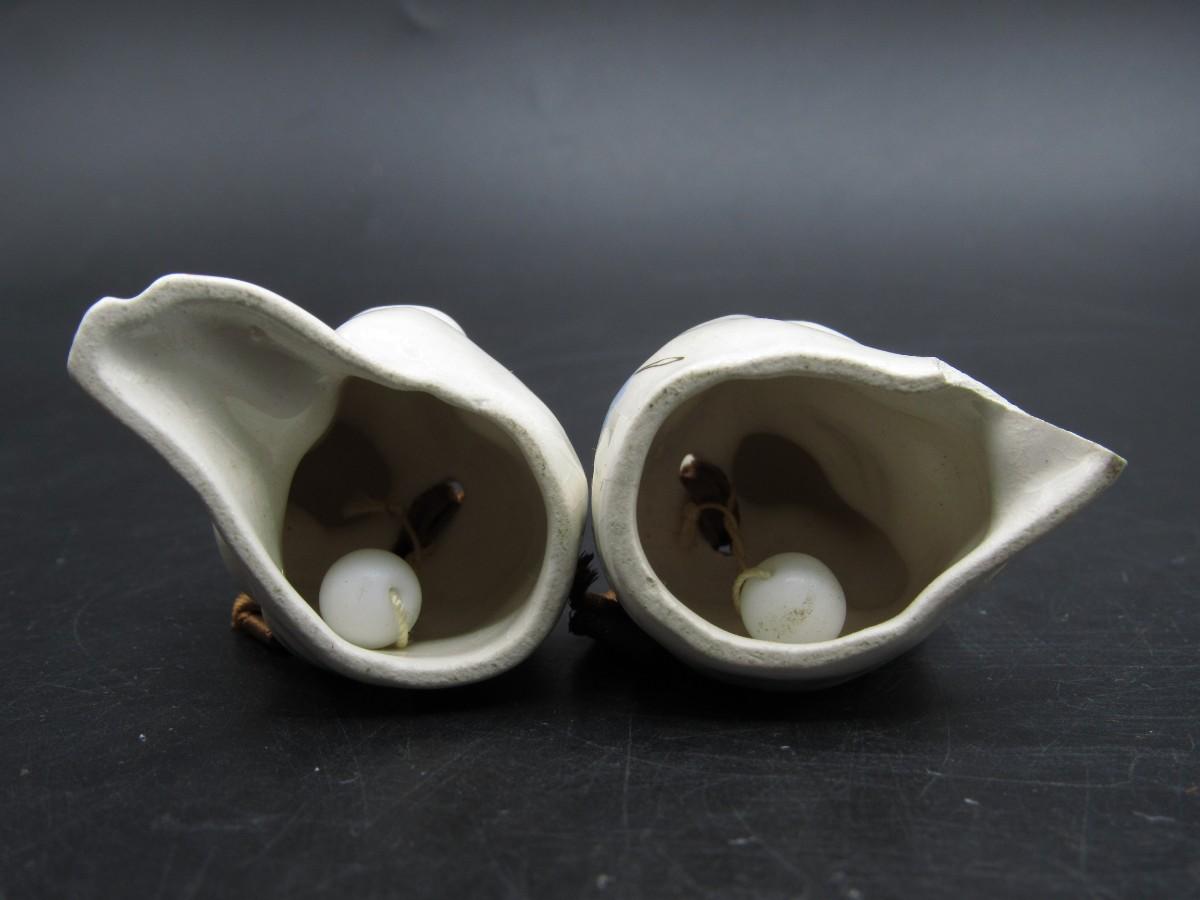 Ceramic with marble clappers inside the body. One has a damaged foot, see photos. Approx. 2" tall.