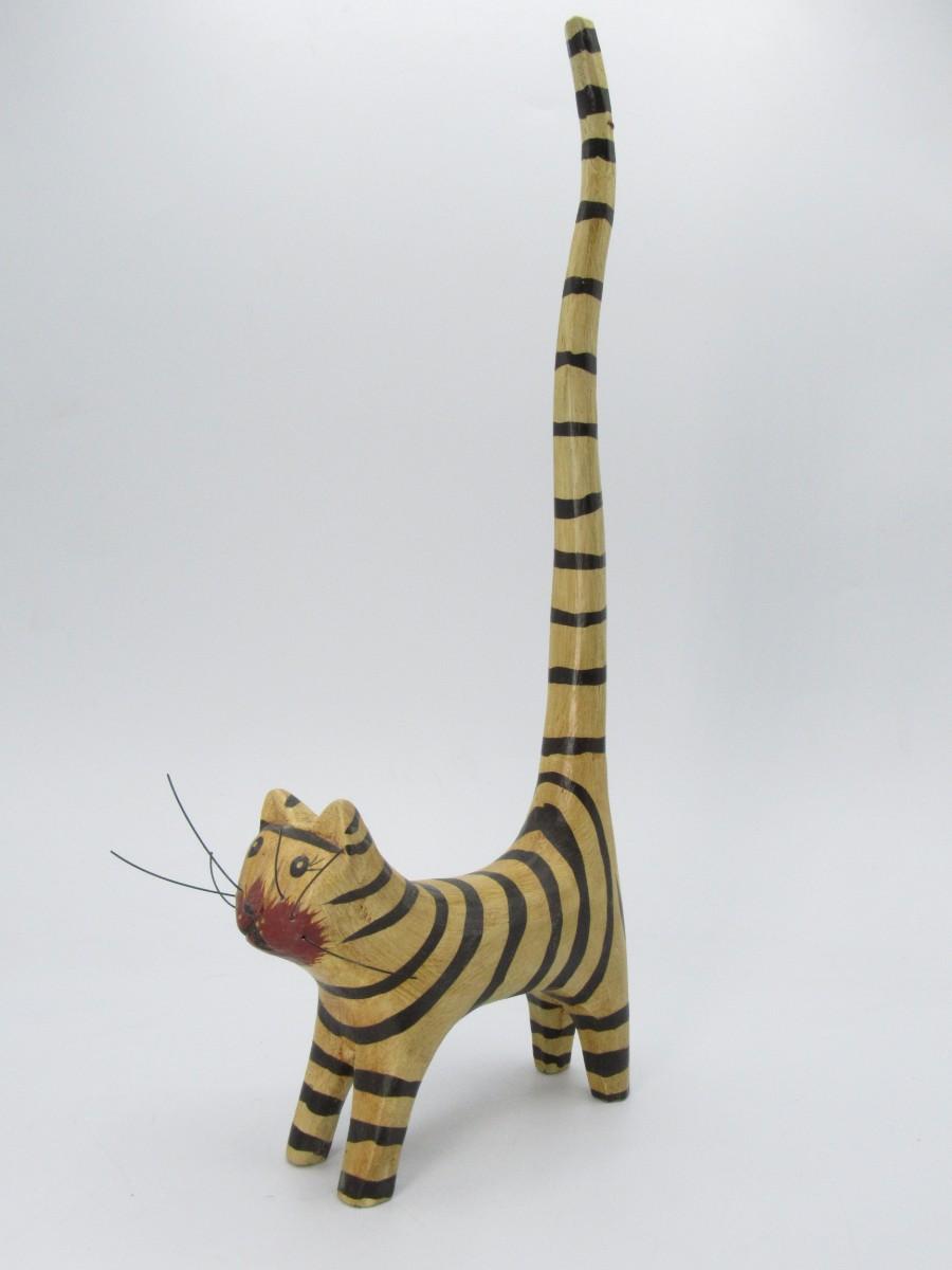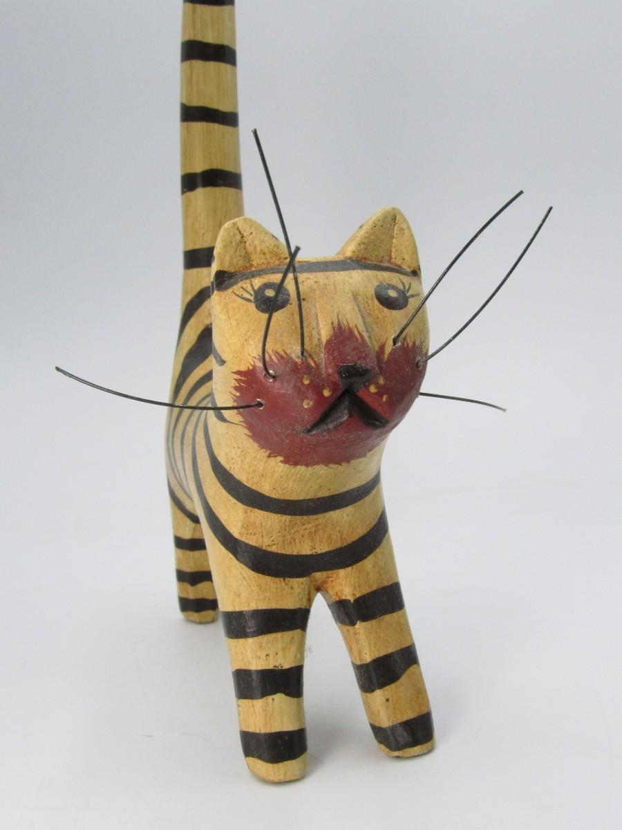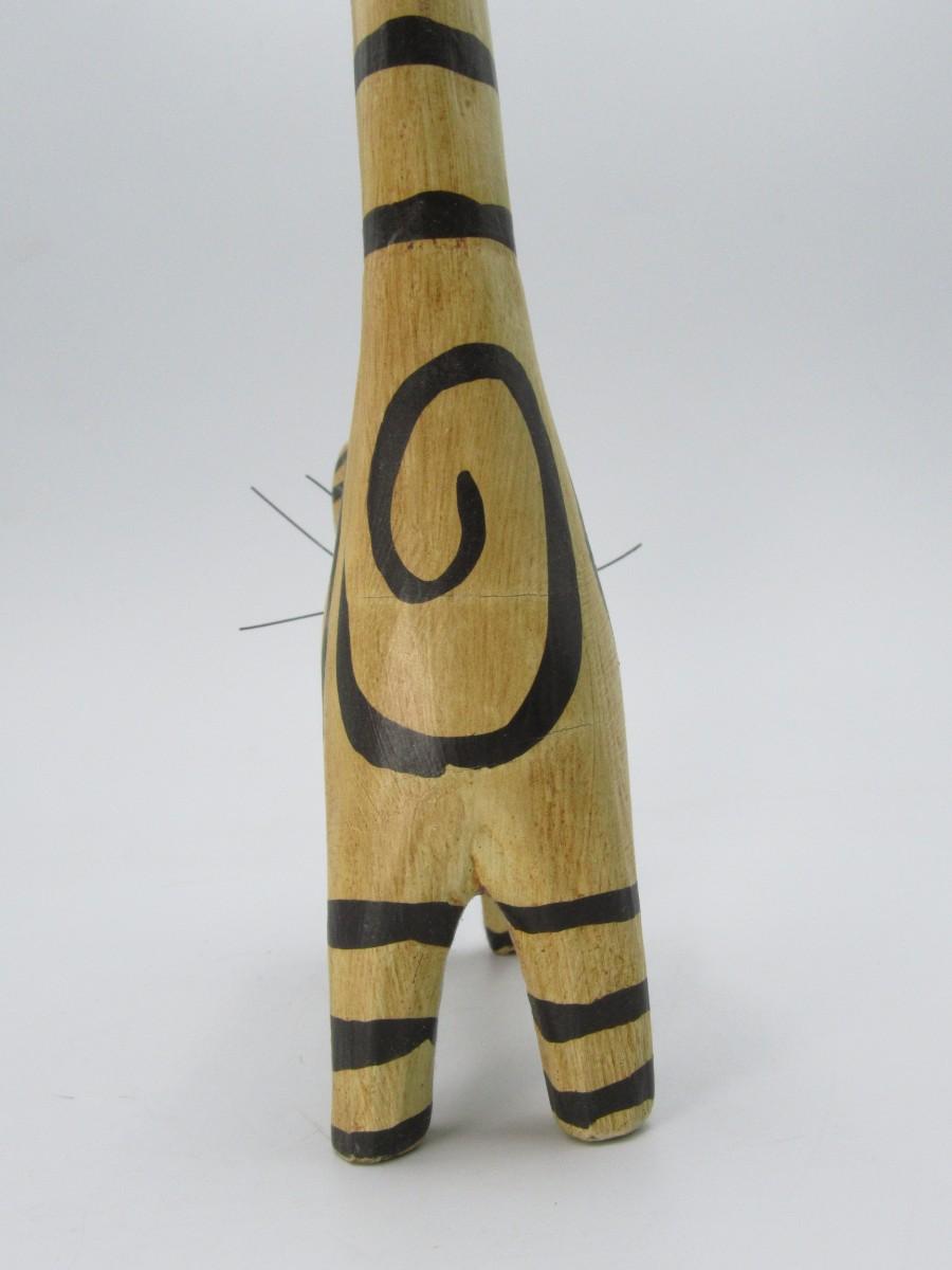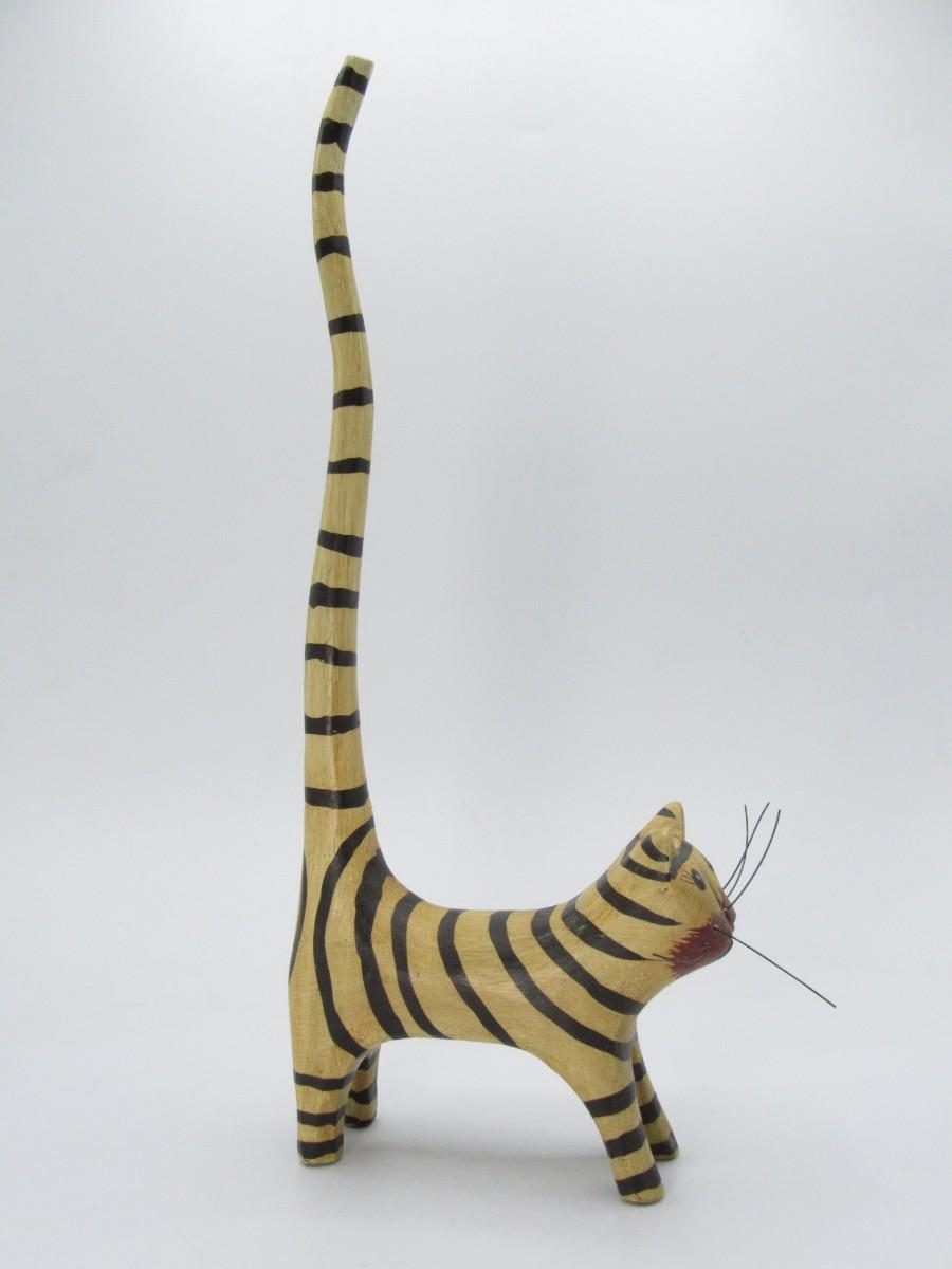 Wooden Carved Swirl Design Ring Holder Long Tail Cat Figurine