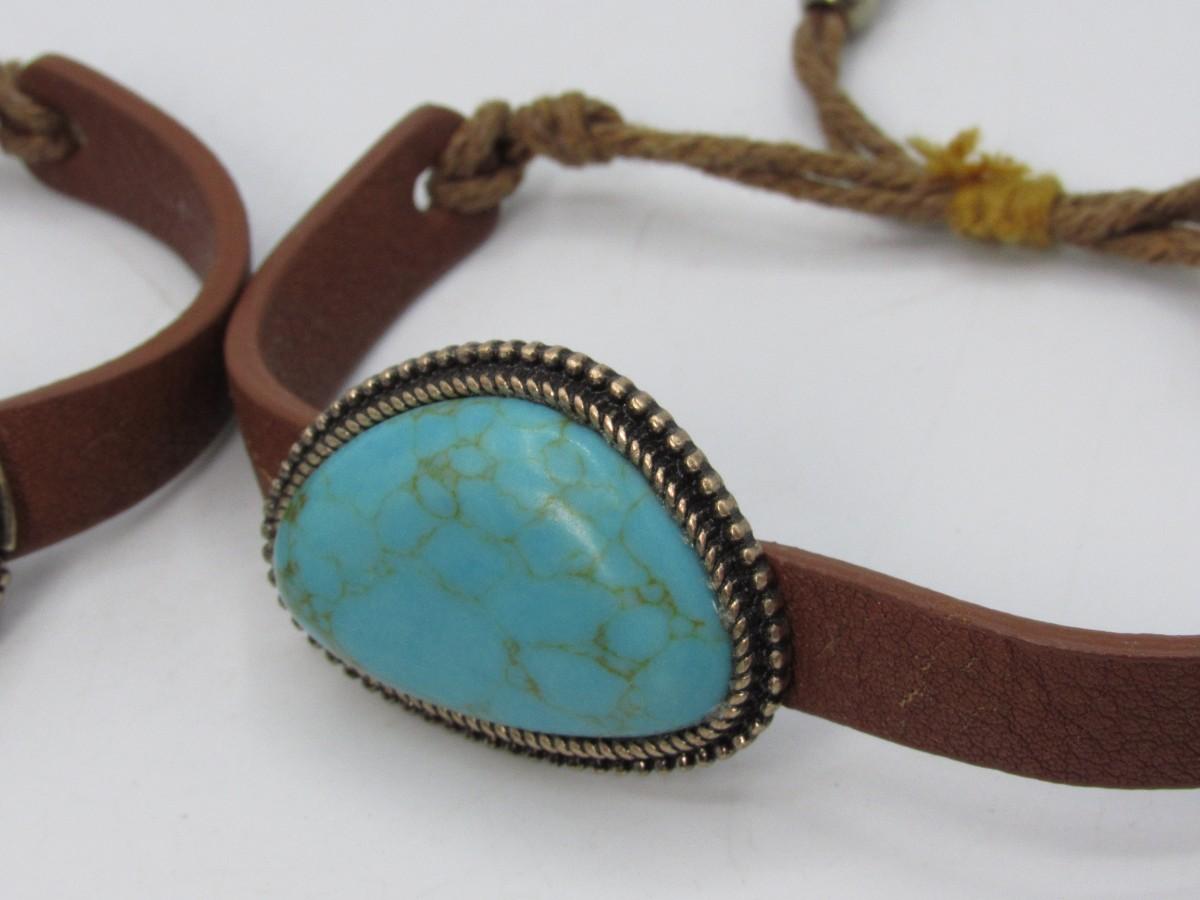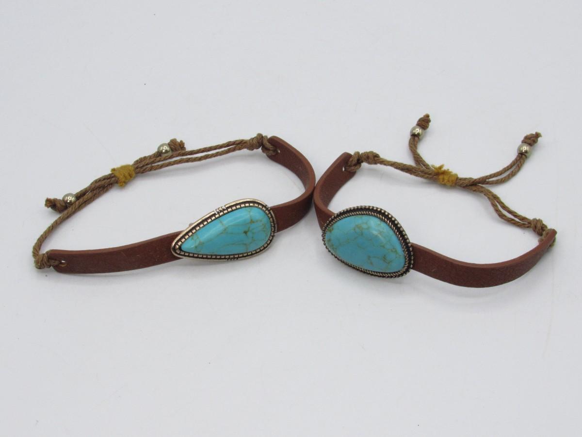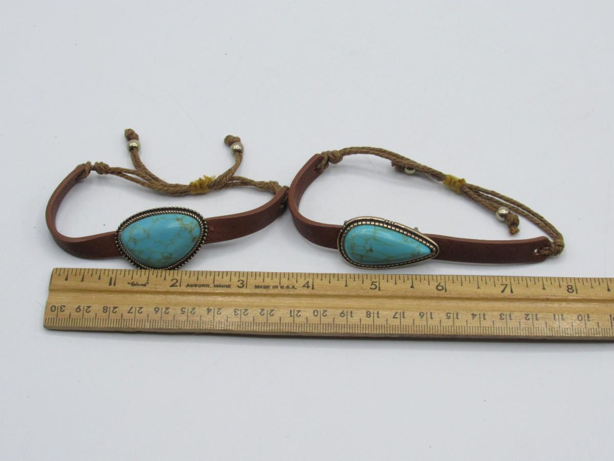 Pair of Leather & Turquoise Southwestern Style Adjustable Bands Bracelets