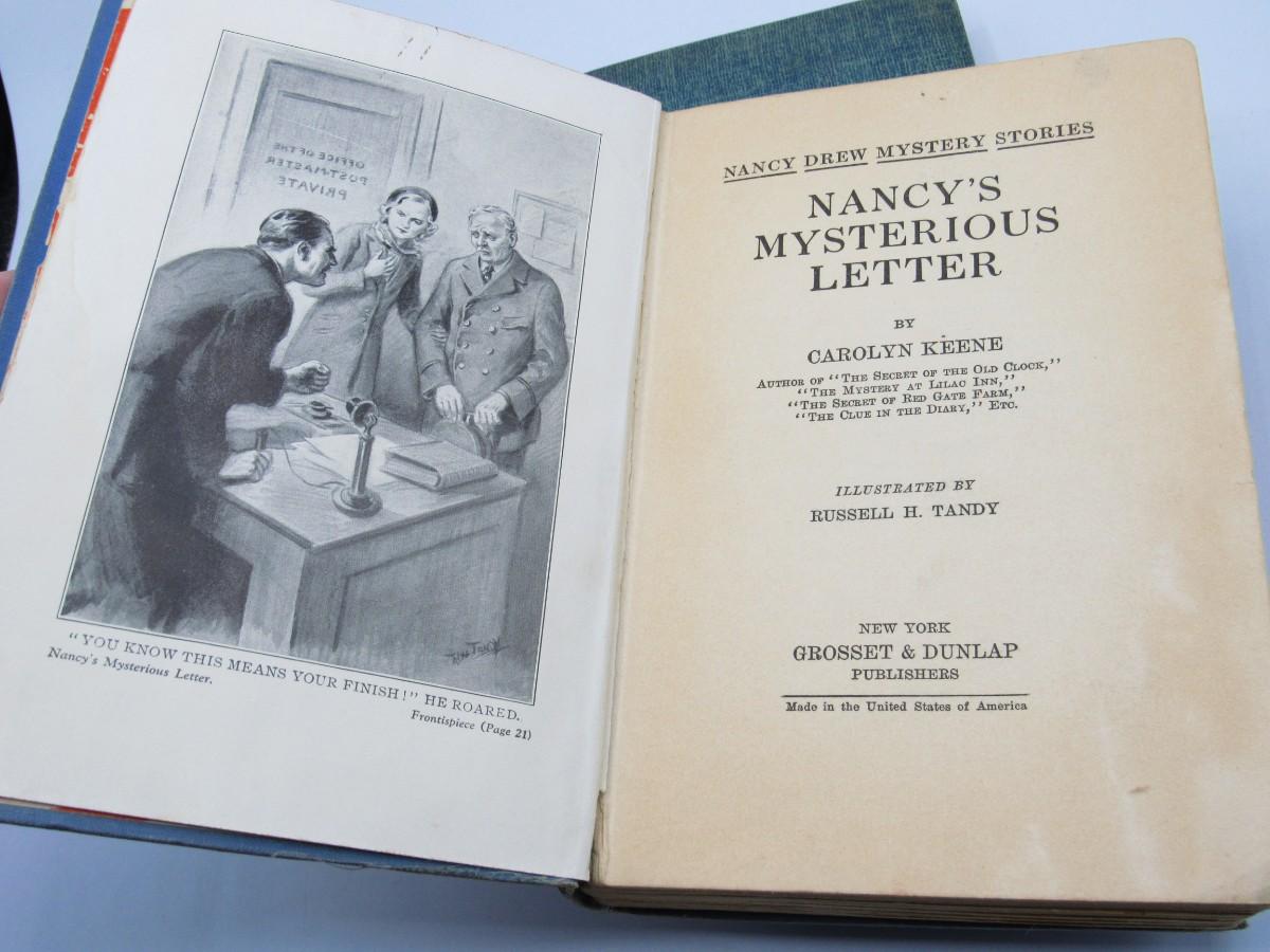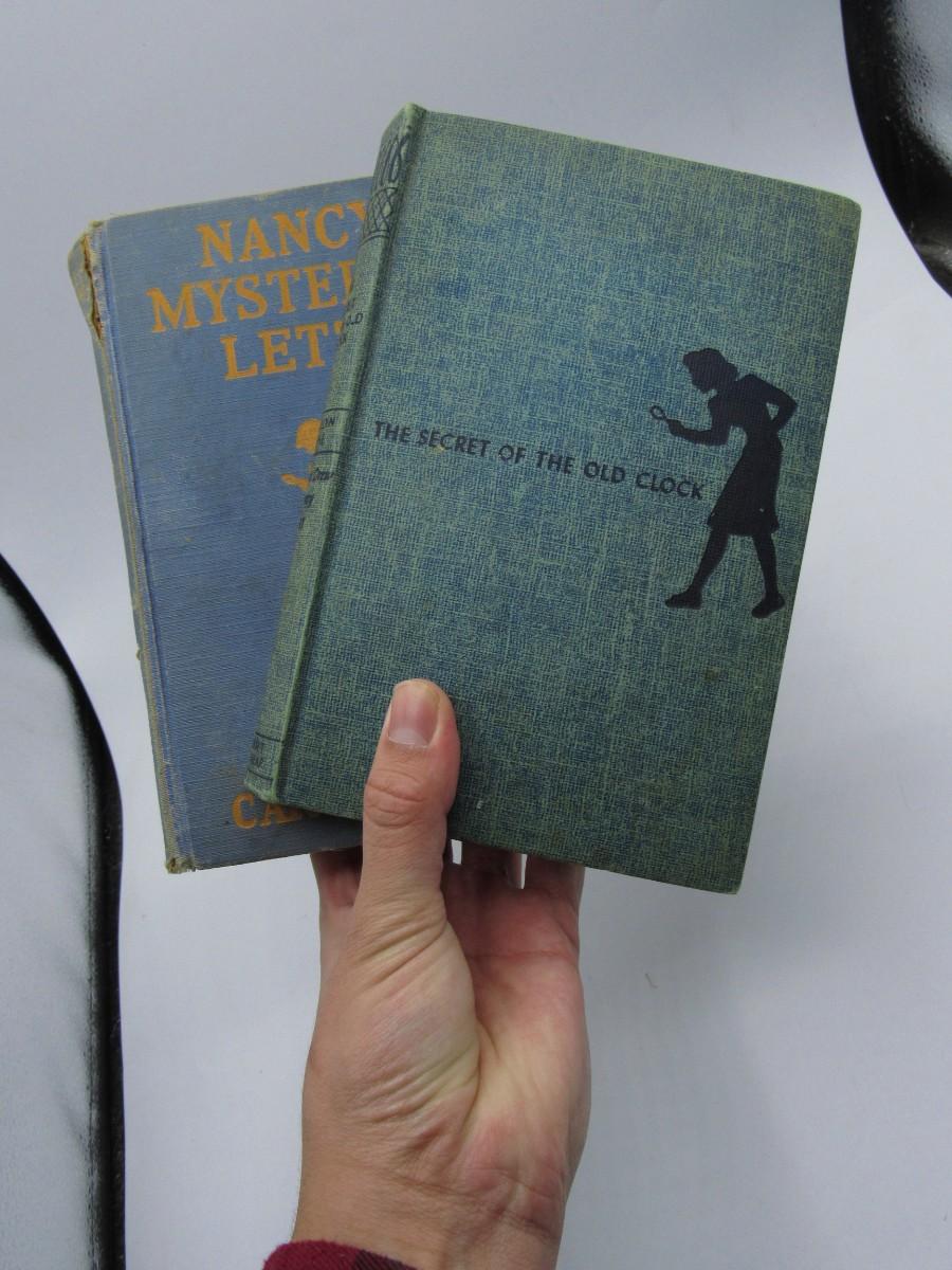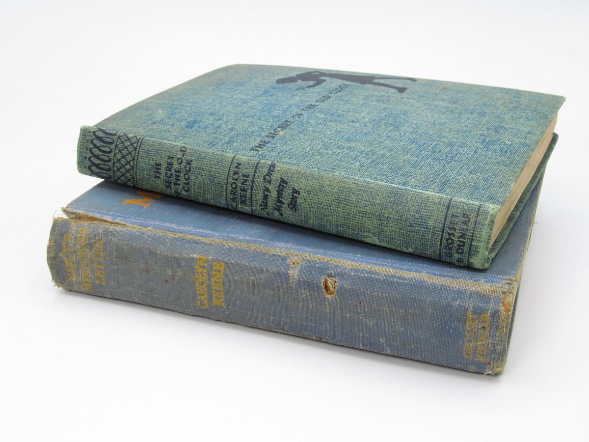 Nancy's Mysterious Letter (1932) and The Secret of the Old Clock (1930), both written by Carolyn Keene. Some yellowing of the printed pages and slight damage to the binding of Nancy's Mysterious Letter. The Secret of the Old Clock is in better condition.