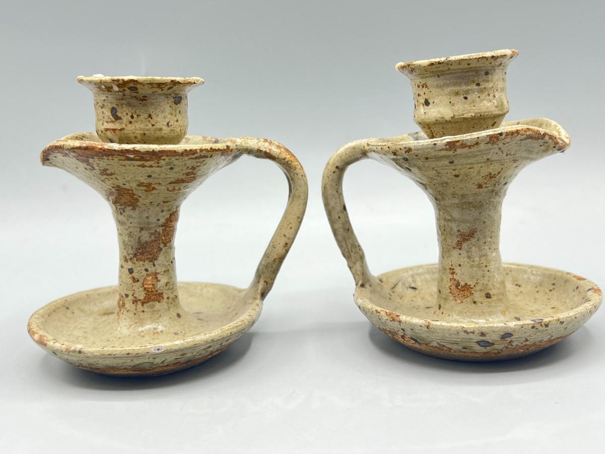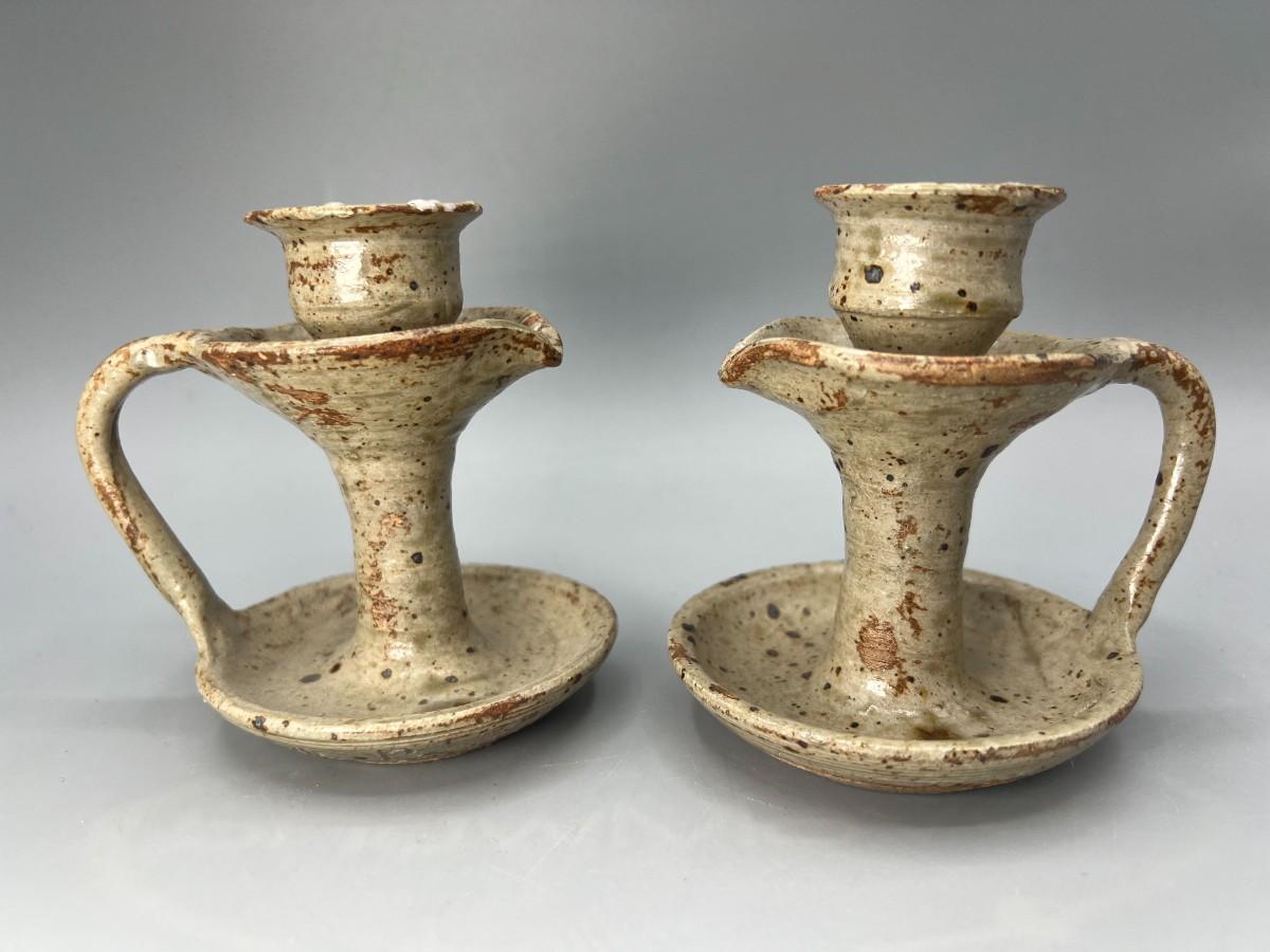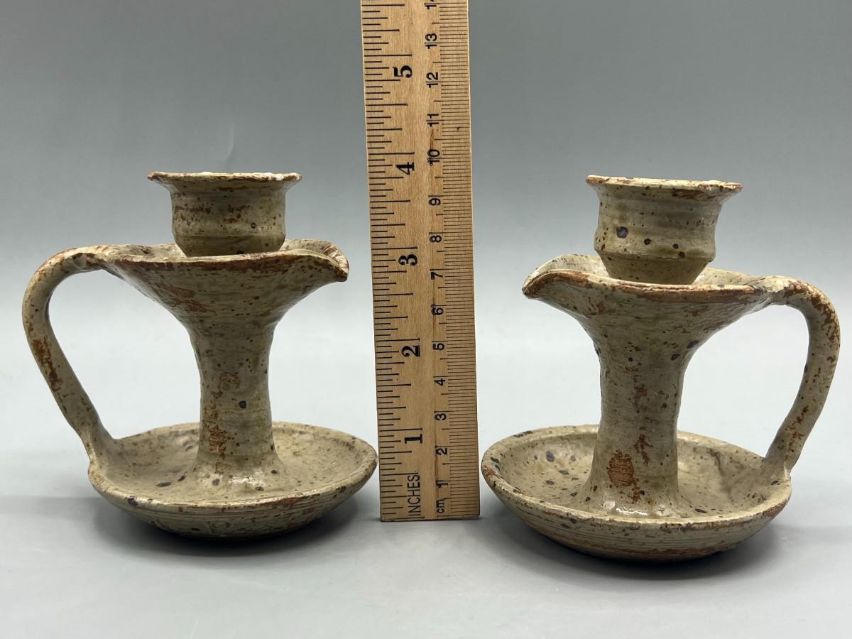 Vintage Pair of Rustic Handmade Signed Pottery Stoneware Speckled Candlestick Holders