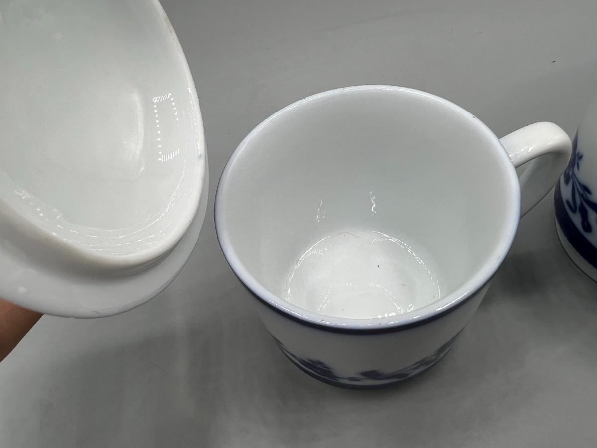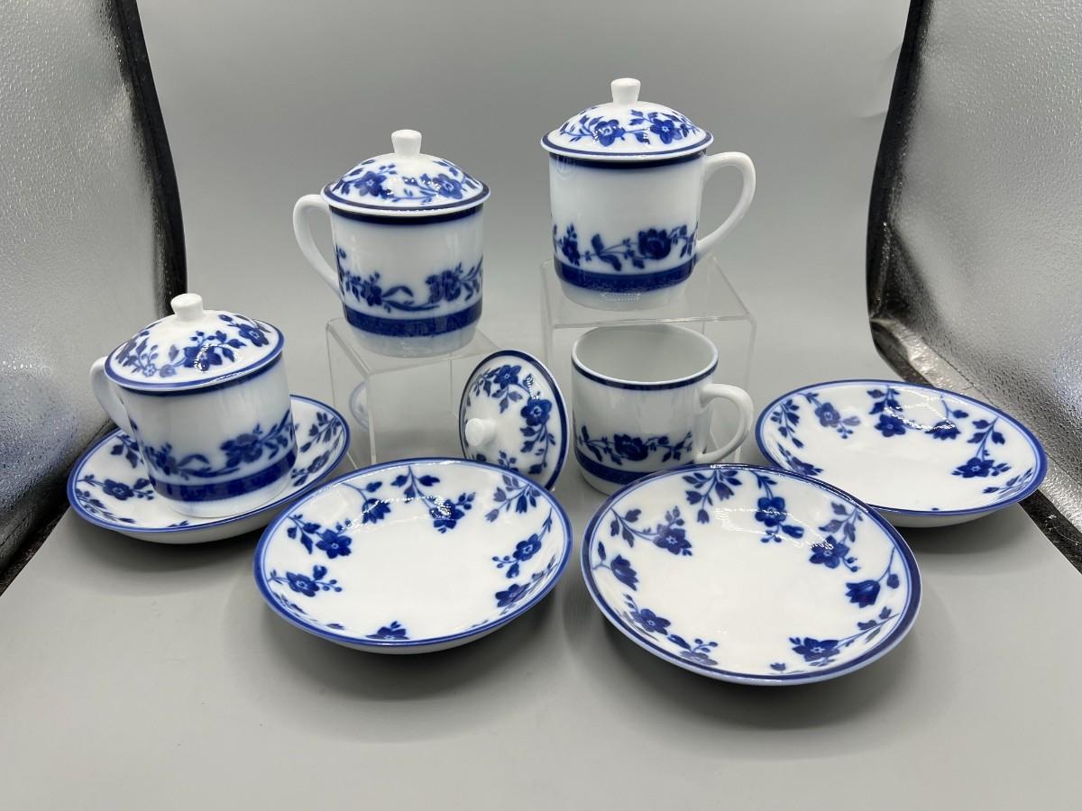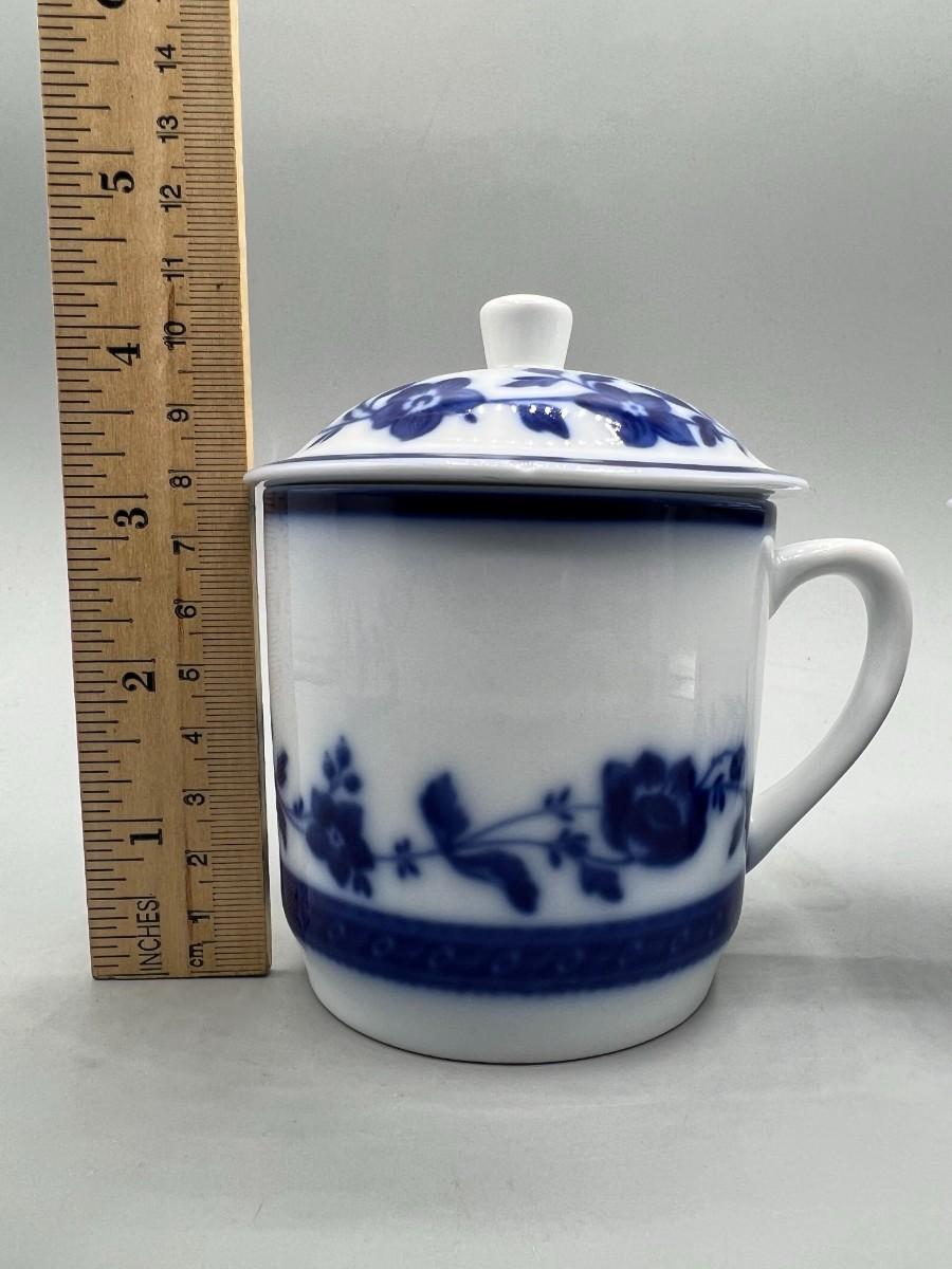 Set of Williams Sonoma Blue Transferware Floral Pattern Cup with Lid & Saucer