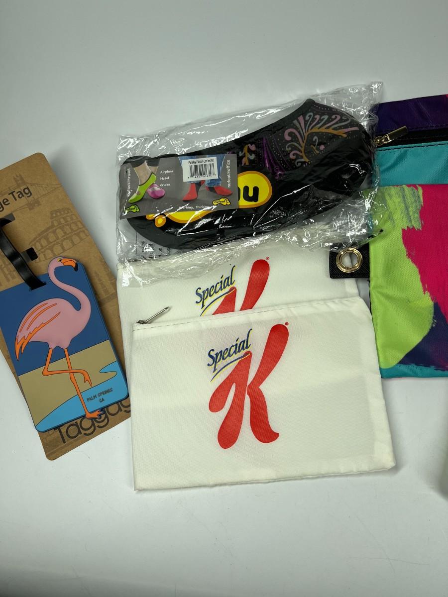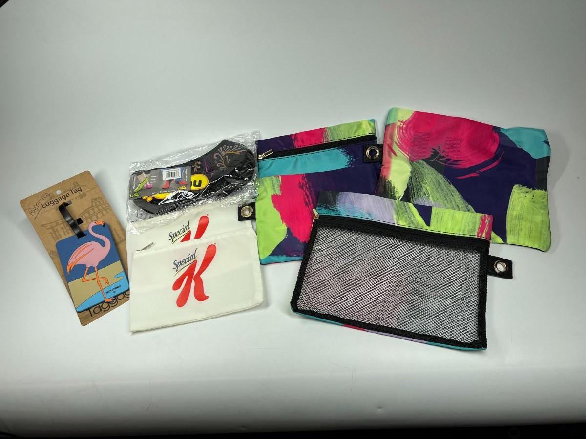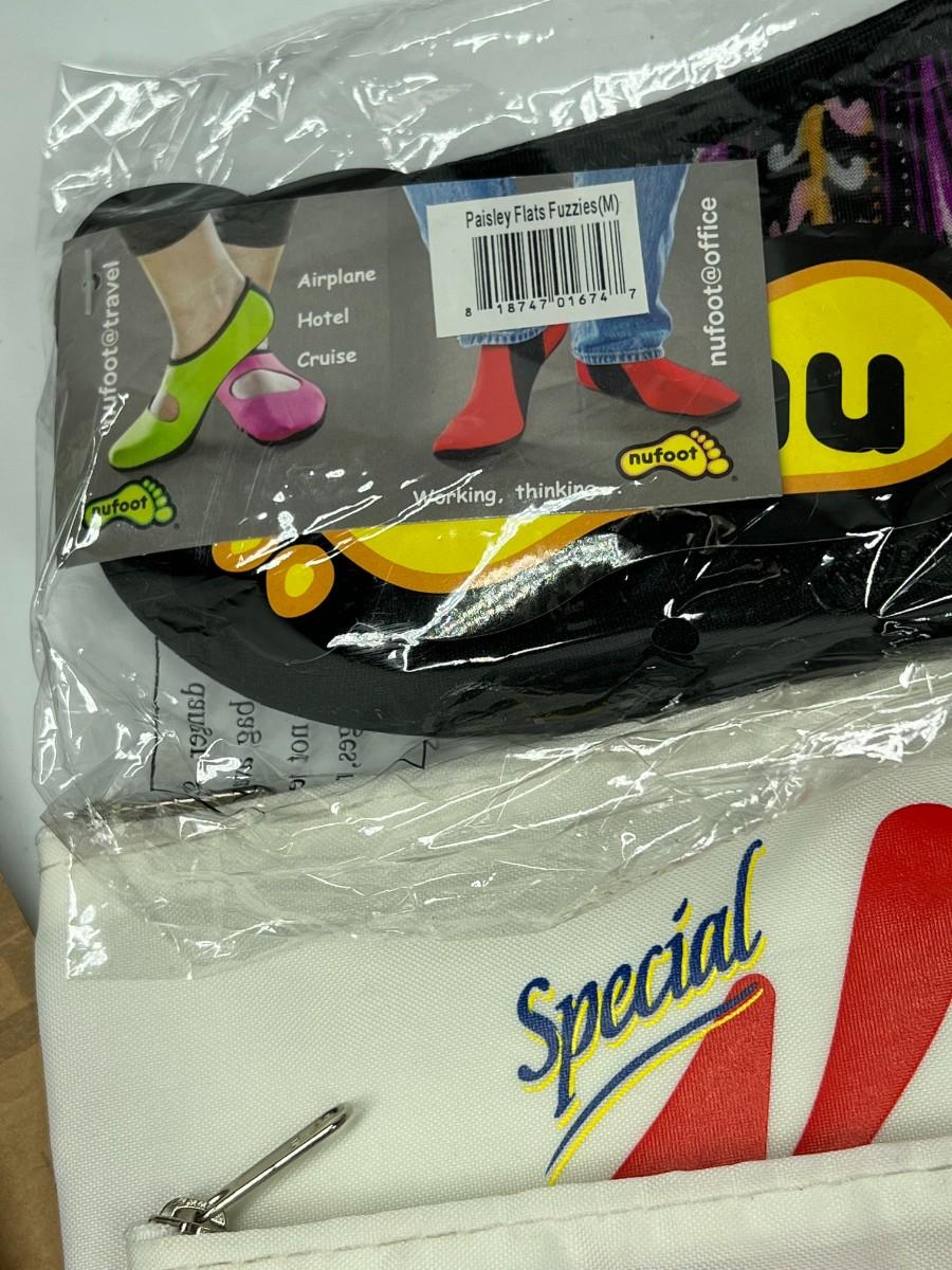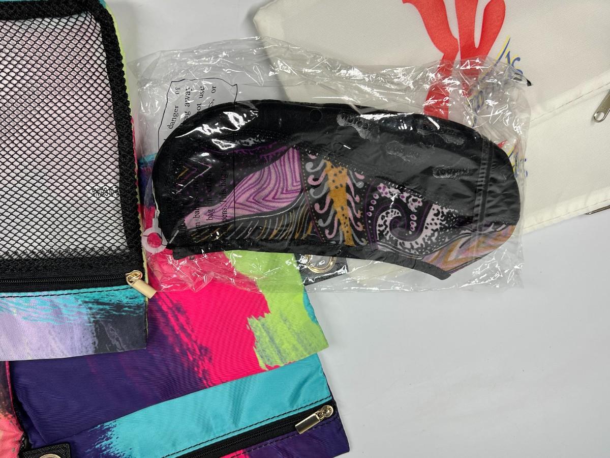 Lot of Miscellaneous Travel Luggage Zip Up Bags, Nufoot Slip On Booties, Luggage Tag, & More