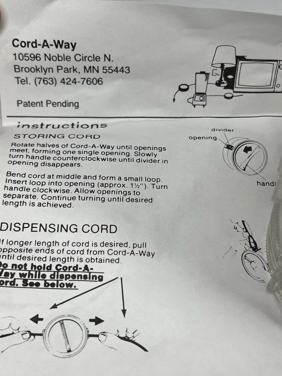Cord-a-Way Electrical Cord Storage Management. Comes with use instructions.