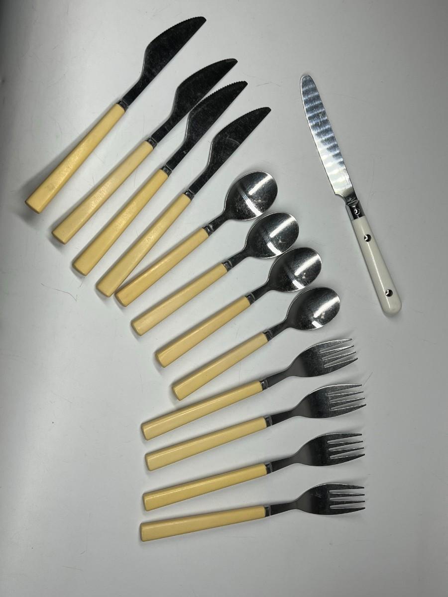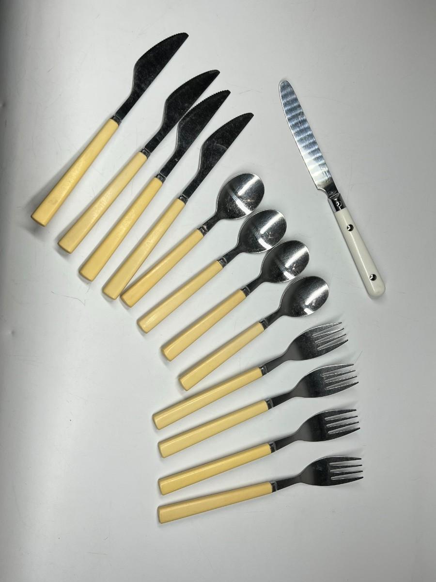 Vintage Retro Plastic Handle Cutlery Flatware Knives Forks Spoons. 13 pieces total, one extra knife does not match.