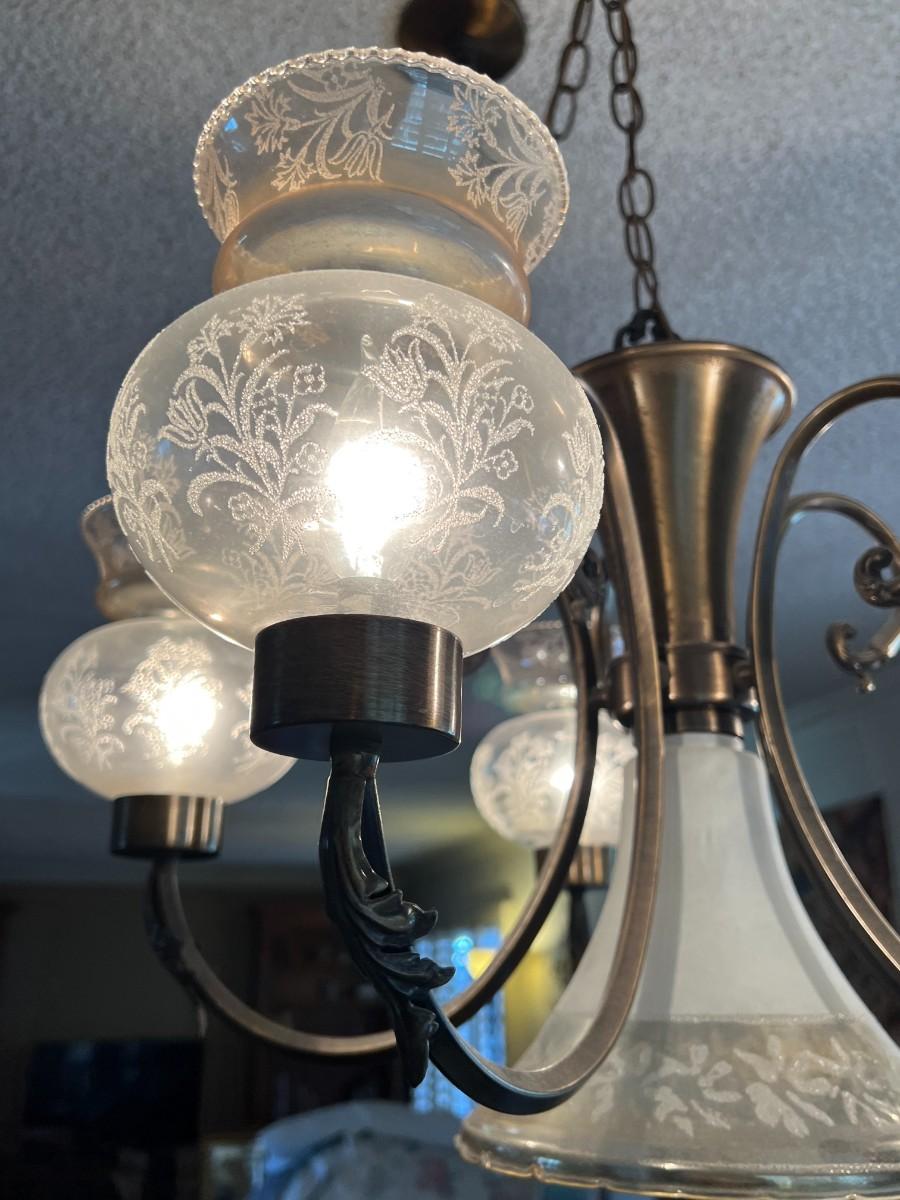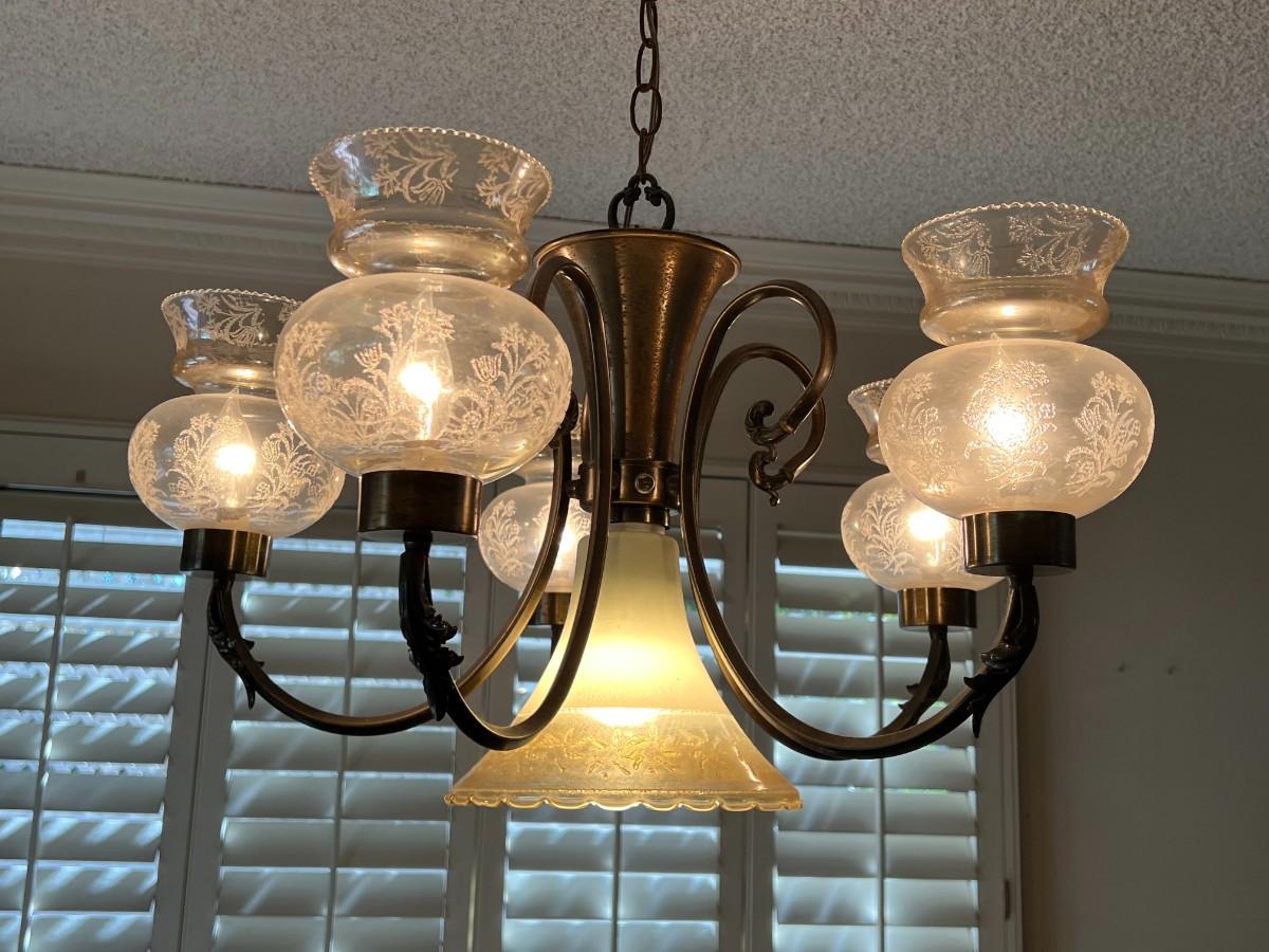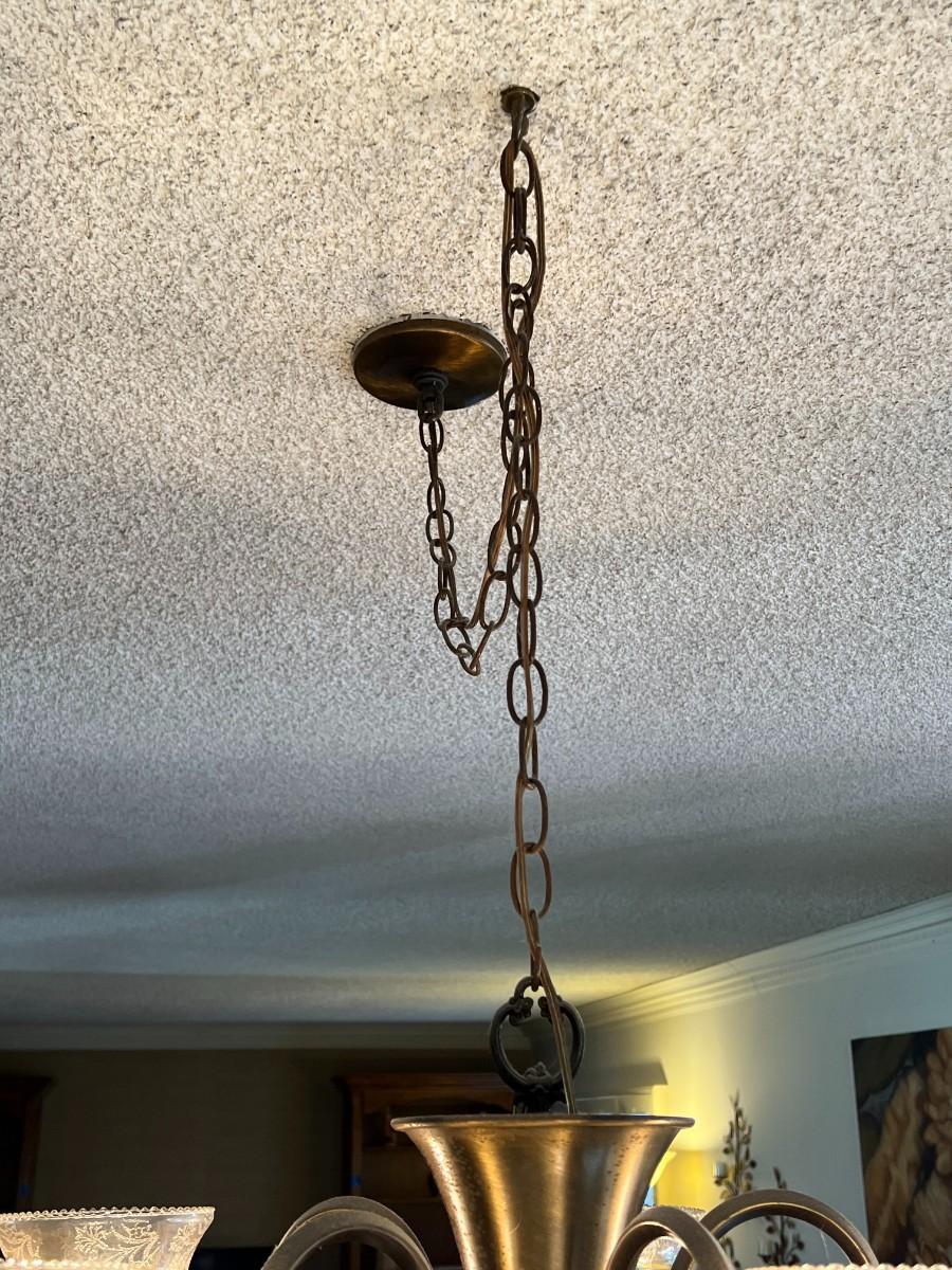 There is no significant damage to the lamp and is in overall good displayable and useable condition. Check pictures for more details. Everything on the lamp works, but needs to removed from the ceiling.