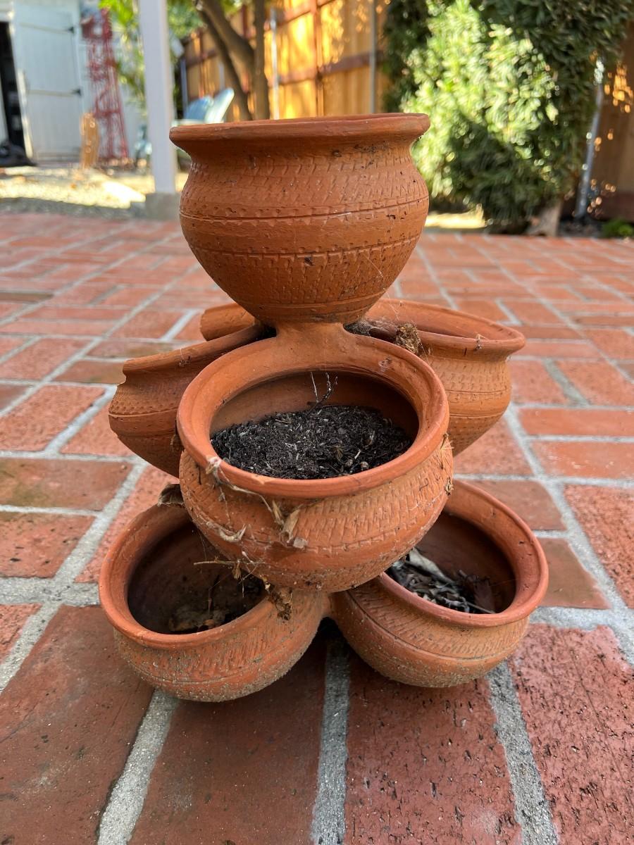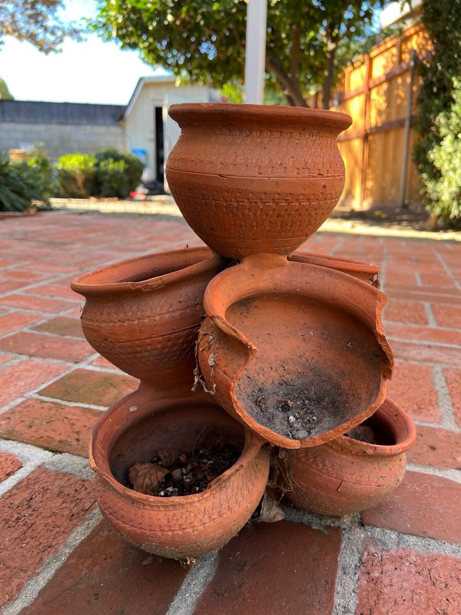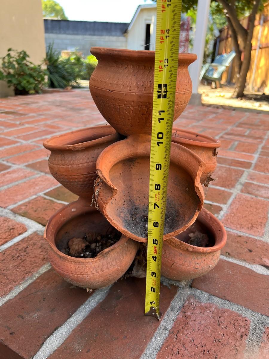 There is a cracked pot and a chipped piece on the back of the planter, but there is no other significant damage and is in good displayable condition. Check pictures for more details and for sizing.