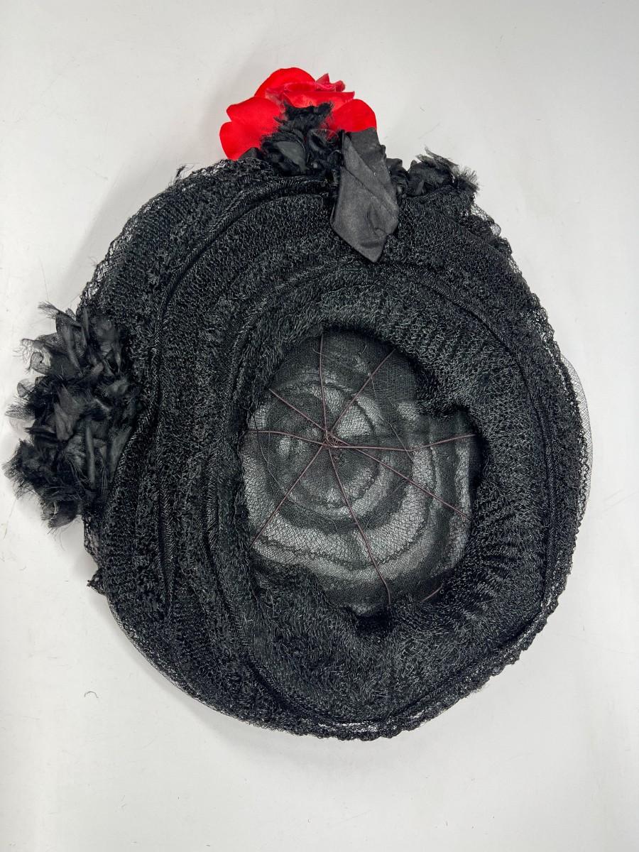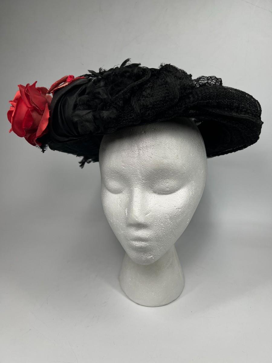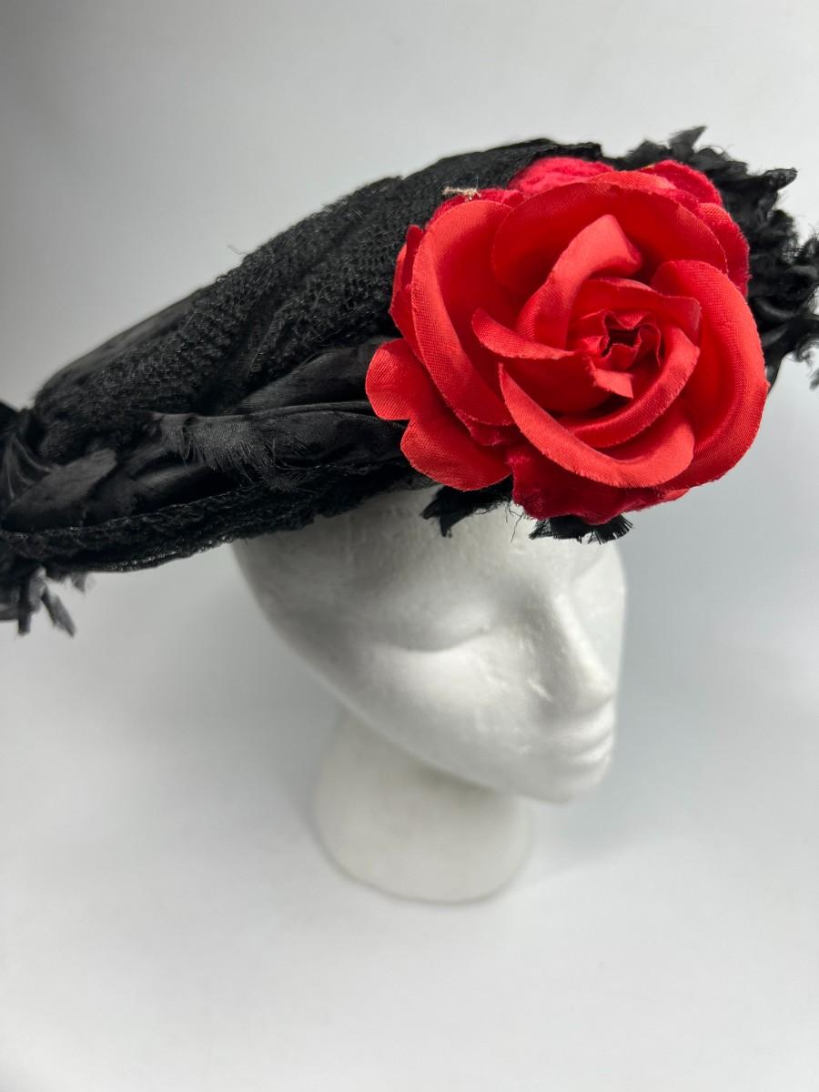 Vintage Hollywood Regency Flapper Wide Brim Lace Black Cap with Faux Red Rose
