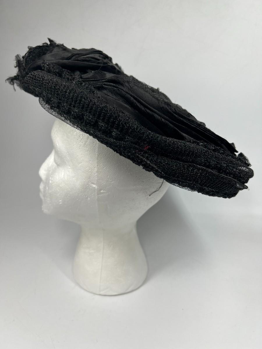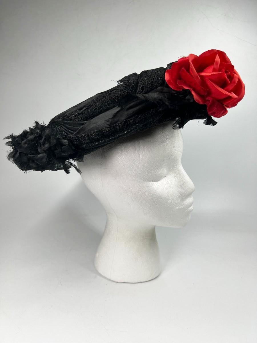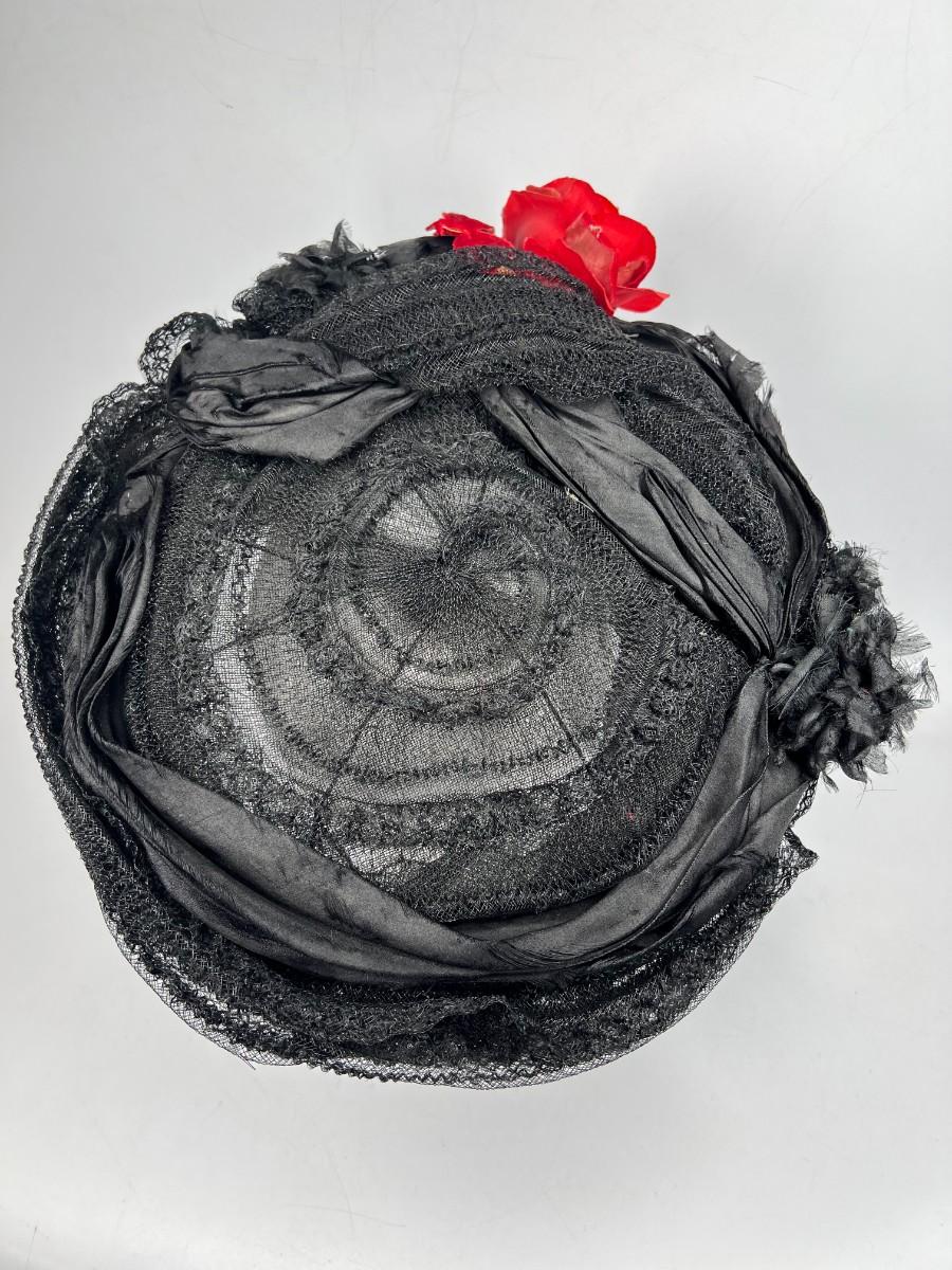 Vintage Hollywood Regency Flapper Wide Brim Lace Black Cap with Faux Red Rose