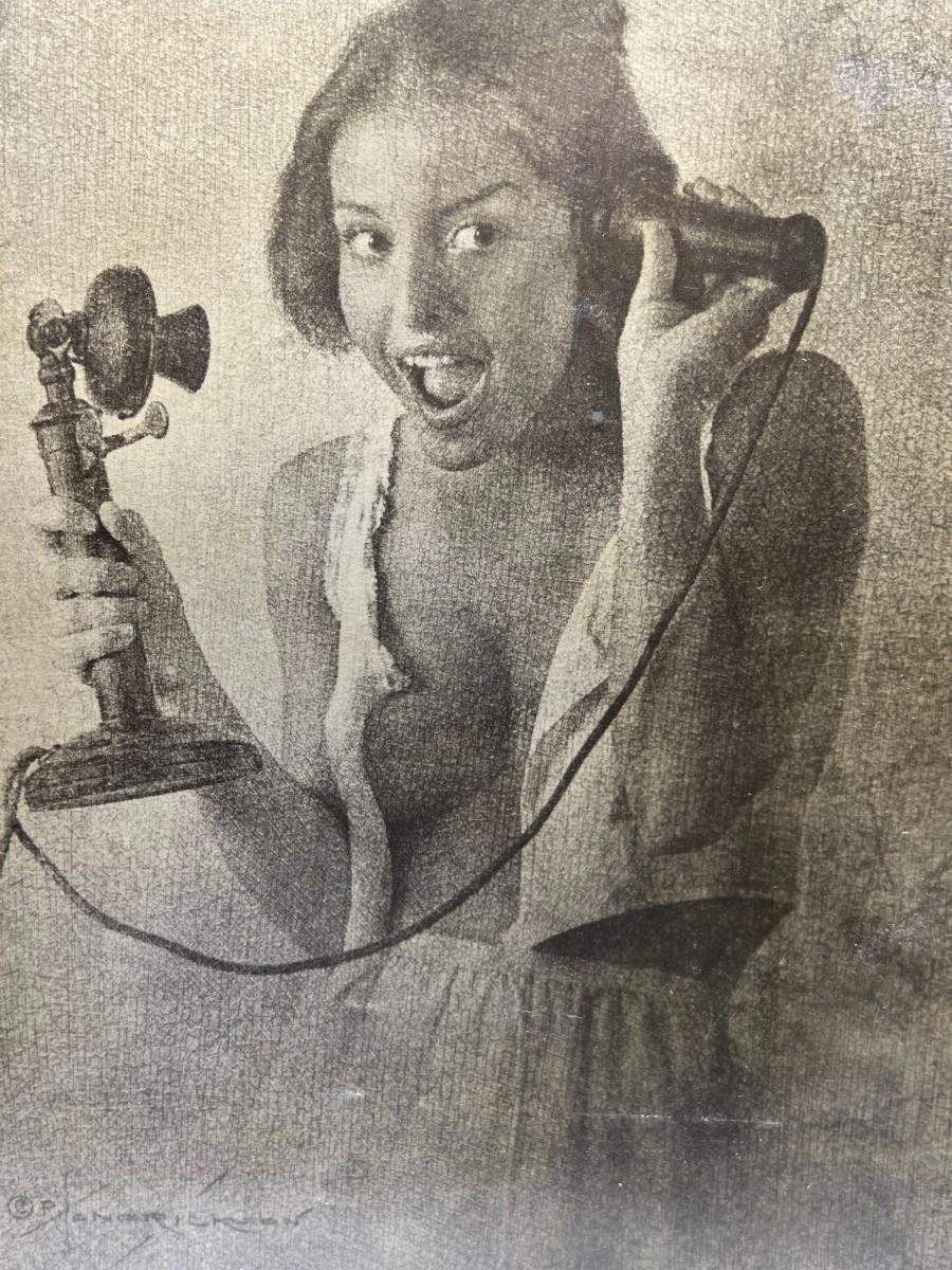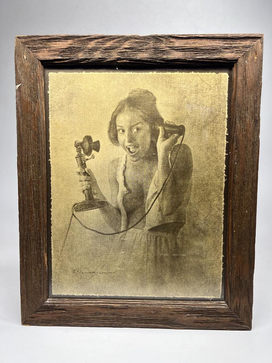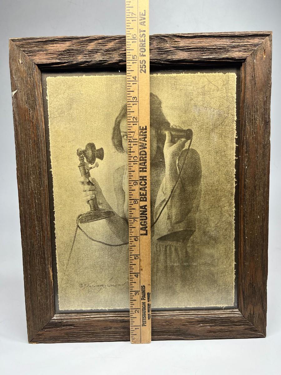 Retro Framed R. Hendrickson Sepia Print Vintage Rique Woman On Telephone
