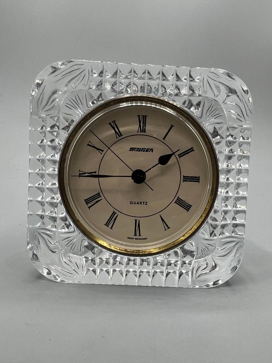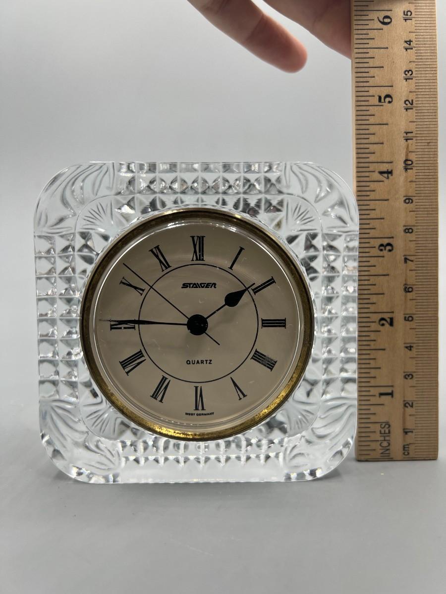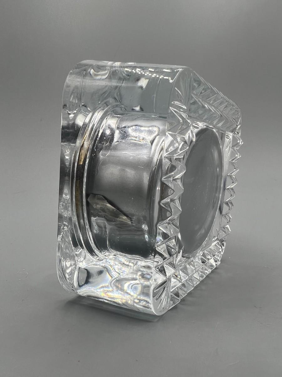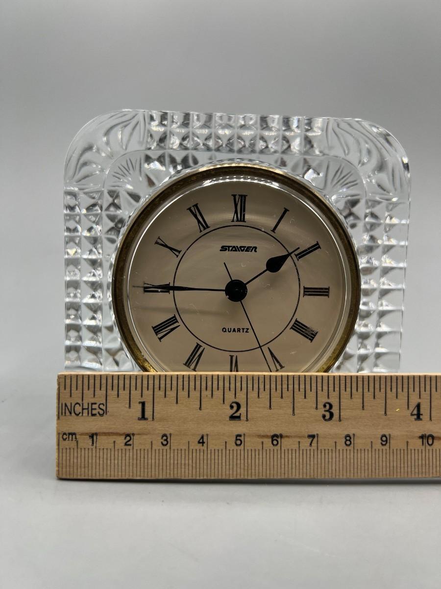 Small Shelf Sitting Crystal Clock Battery Operated. Good condition. Untested, not running, probably need to replace the batteries. About 4" size.