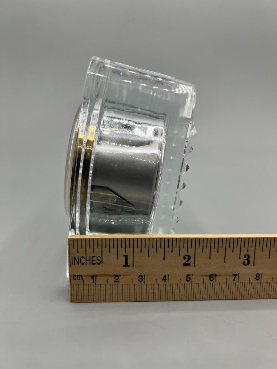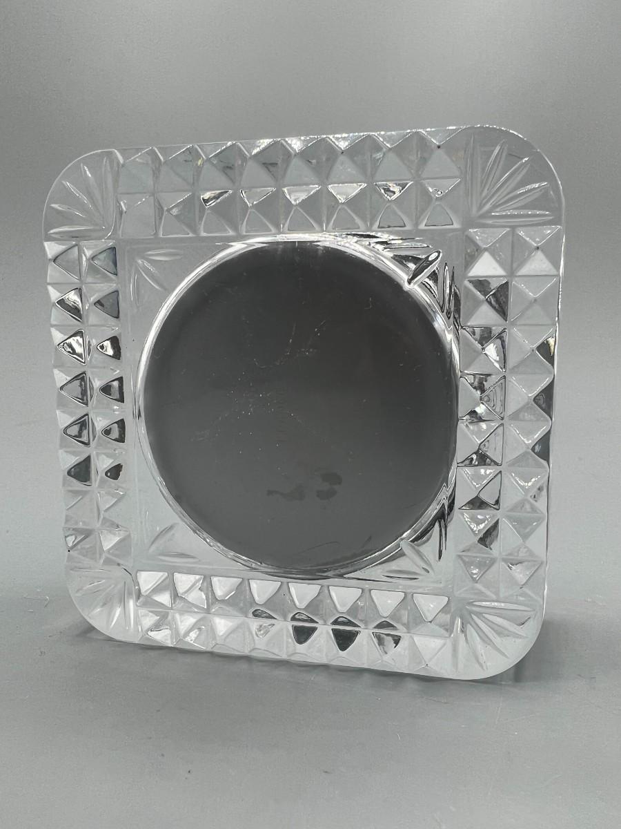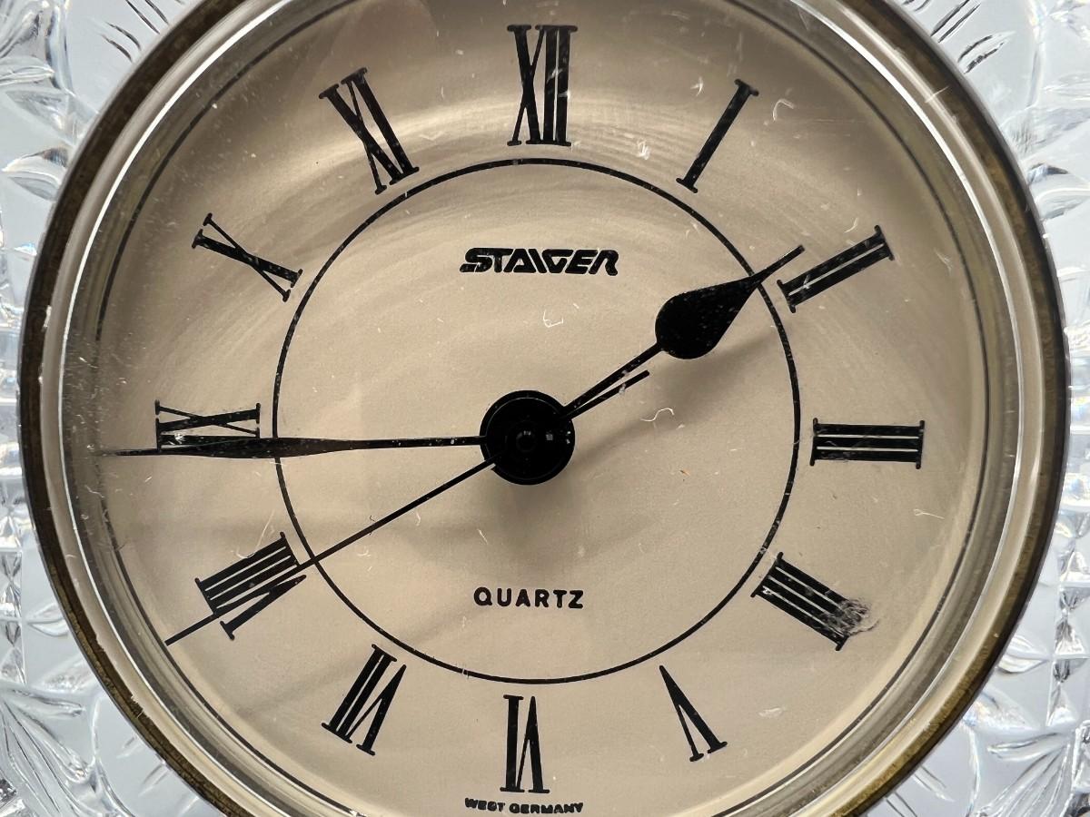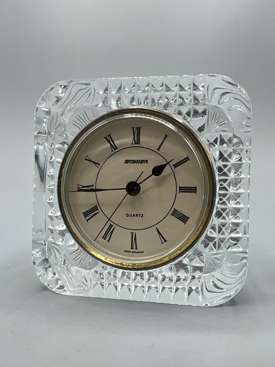 Small Shelf Sitting Crystal Clock Battery Operated. Good condition. Untested, not running, probably need to replace the batteries. About 4" size.