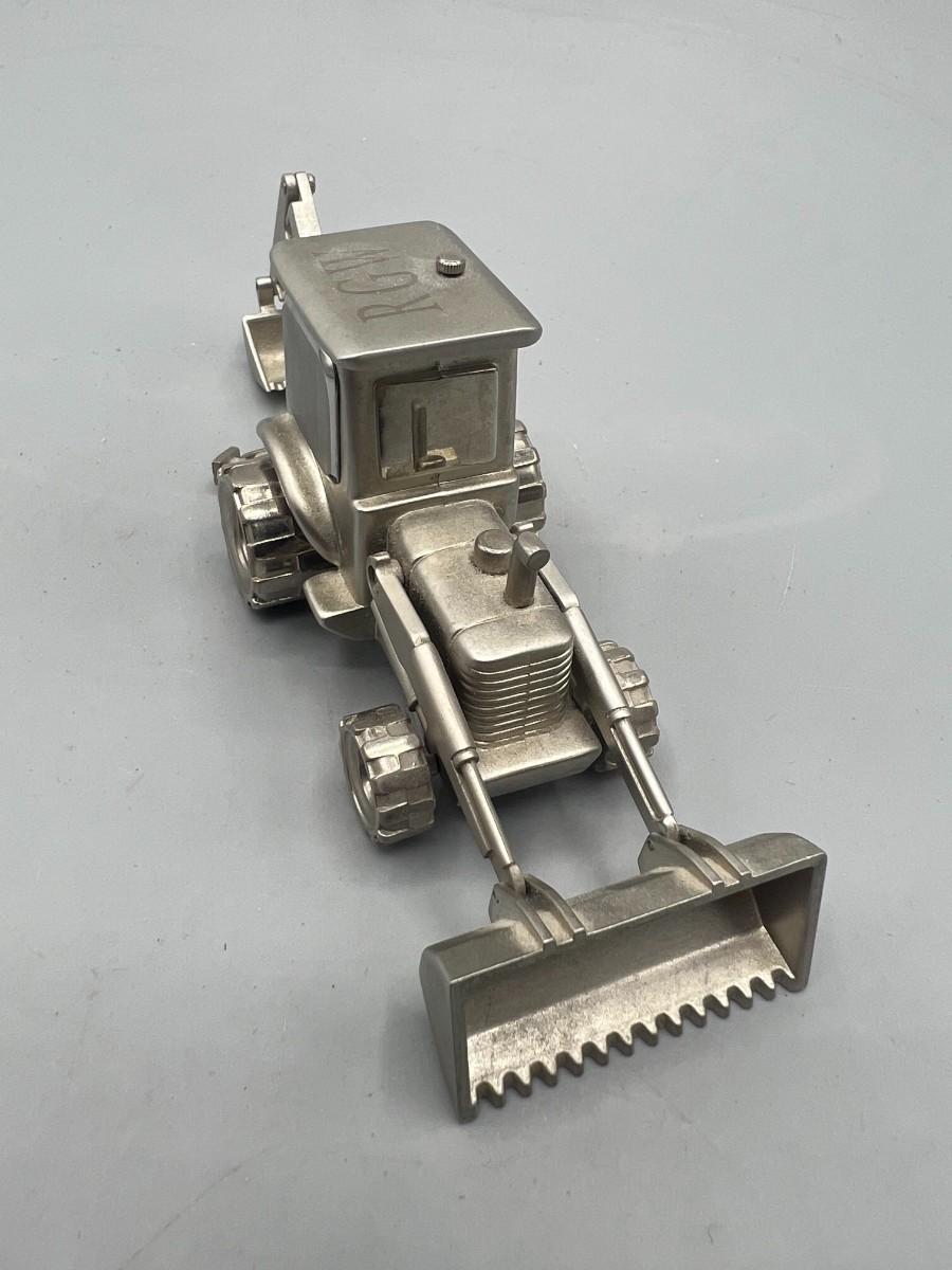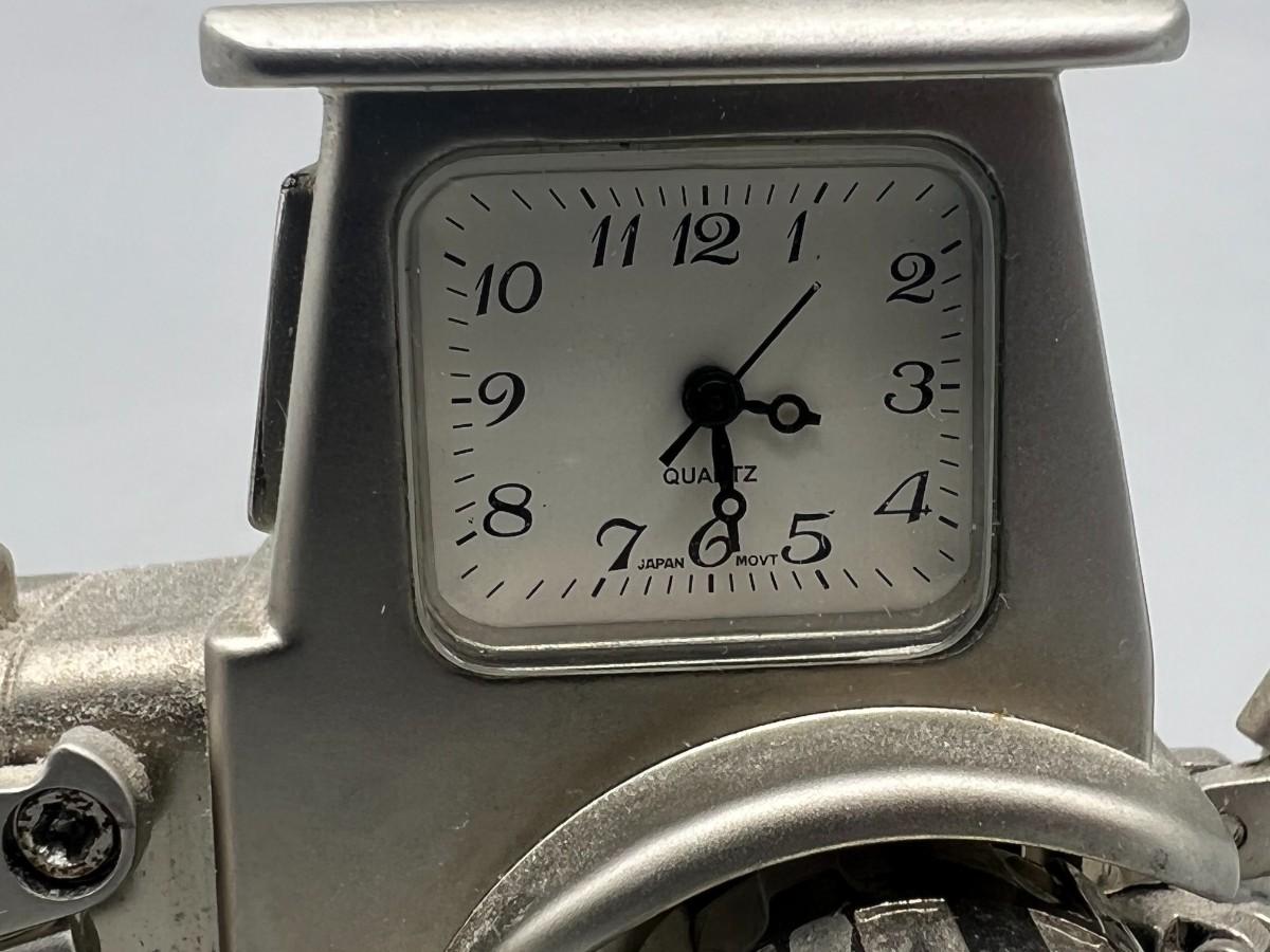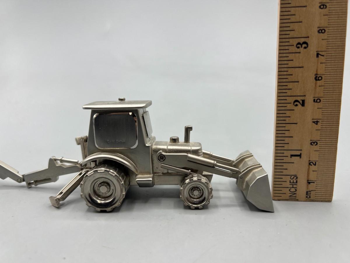 Miniature Backhoe Loader Clock Moveable Parts Engraved. In good condition. Not running. About 2" tall and 6" if stretched out completely.