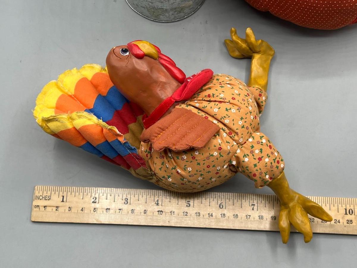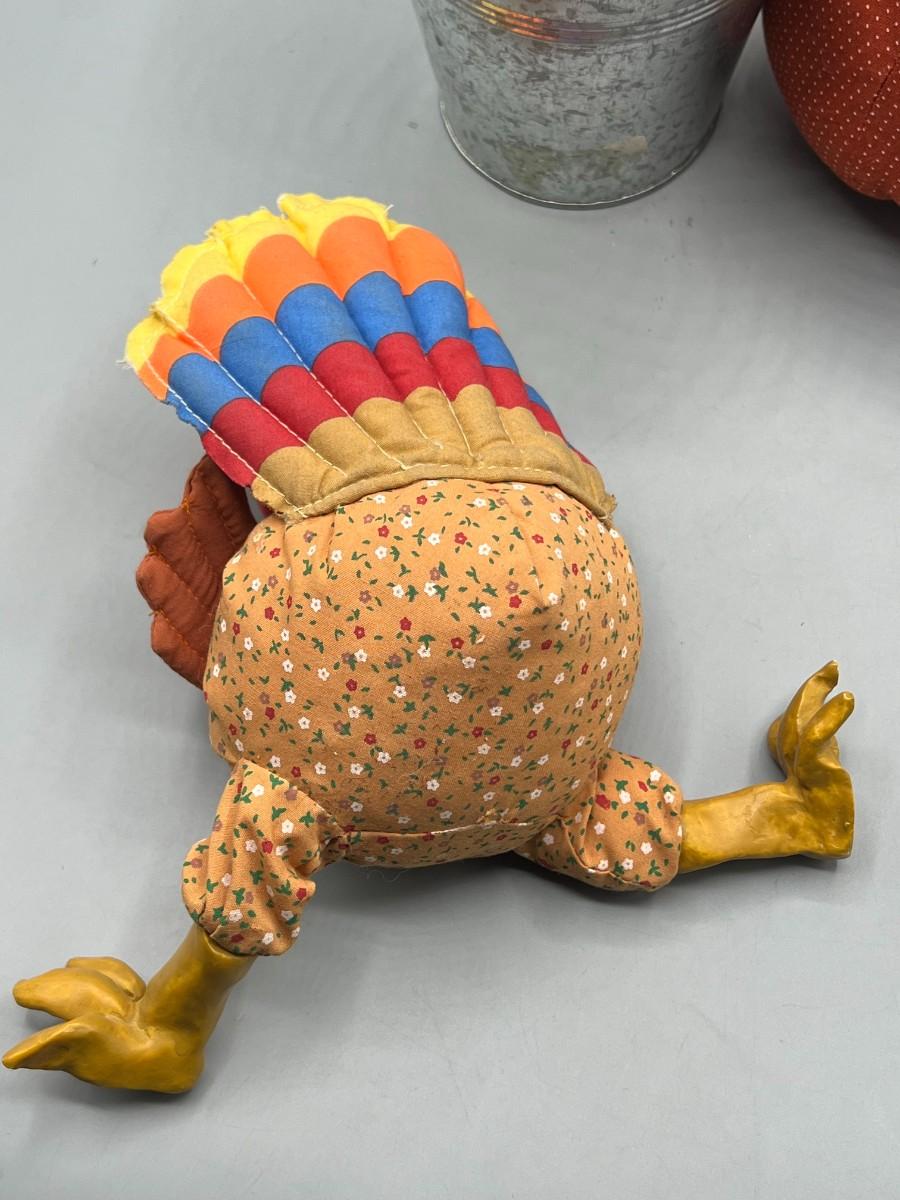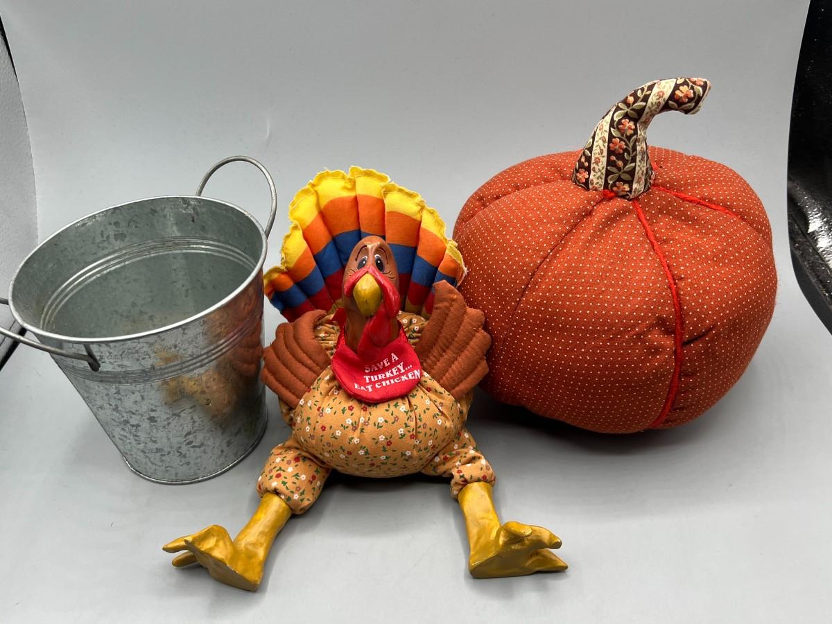Lot of Autumn Winter Seasonal Decor Turkey Shelf Sitter, Cloth Pumpkin, & Small Bucket