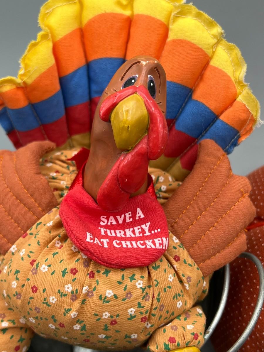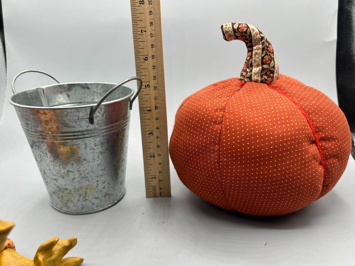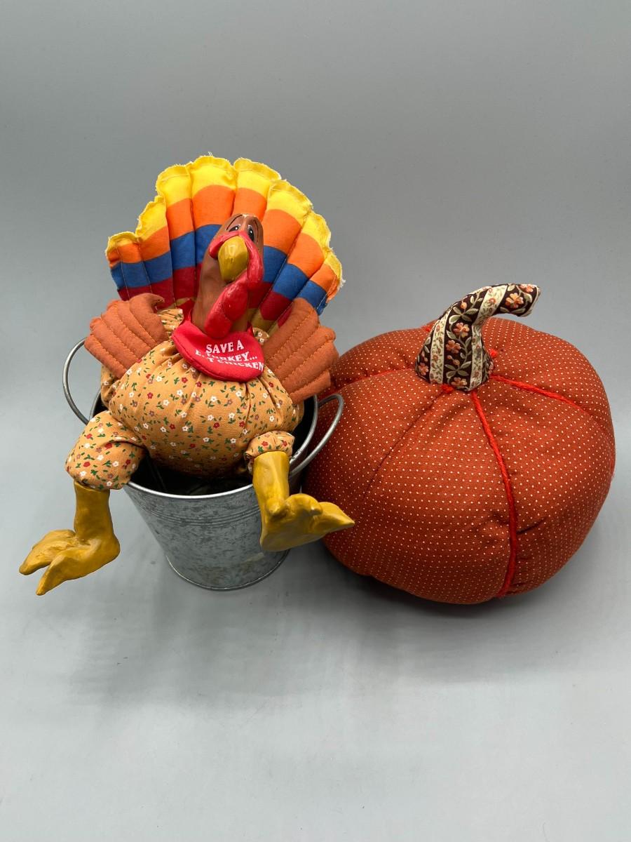 Lot of Autumn Winter Seasonal Decor Turkey Shelf Sitter, Cloth Pumpkin, & Small Bucket