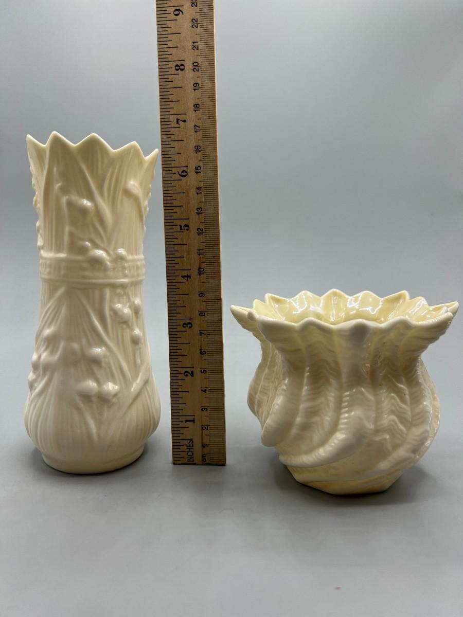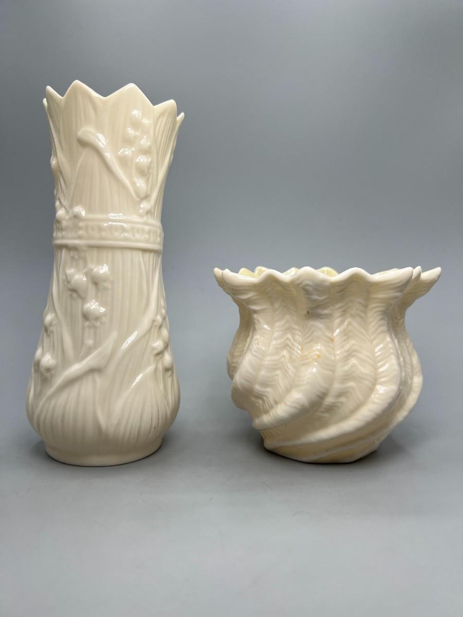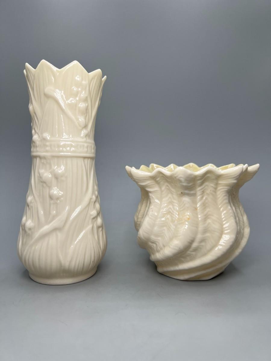 Vintage Irish Belleek Pottery Art Lily of the Valley Tall Vase & Classic Neptune Twisted Shell Flower Pot