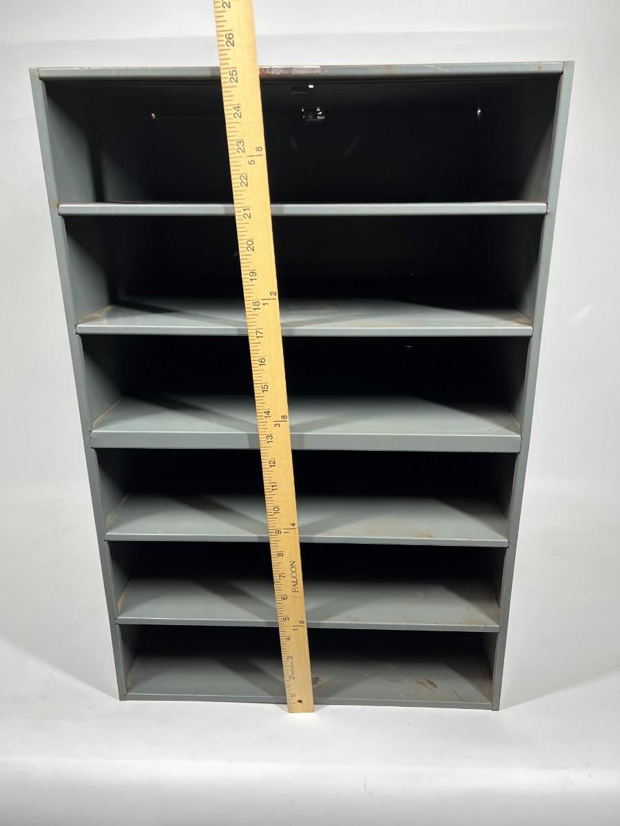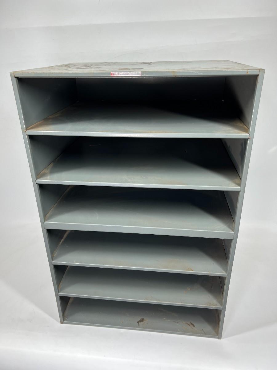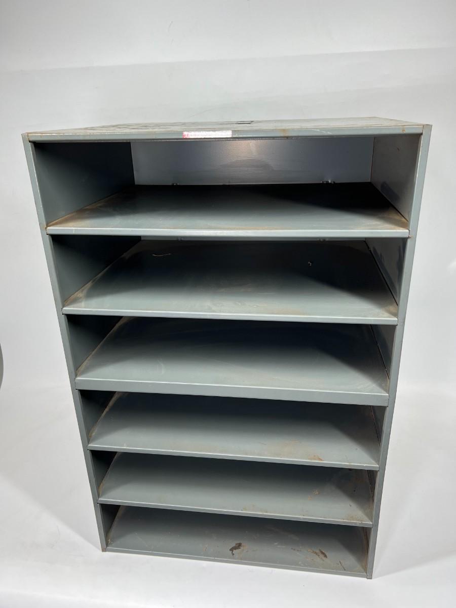 Vintage Metal Divided Paper Sorter Shelf Tab Products Co. In good vintage condition. 6 slot divided shelf. About 25" tall.