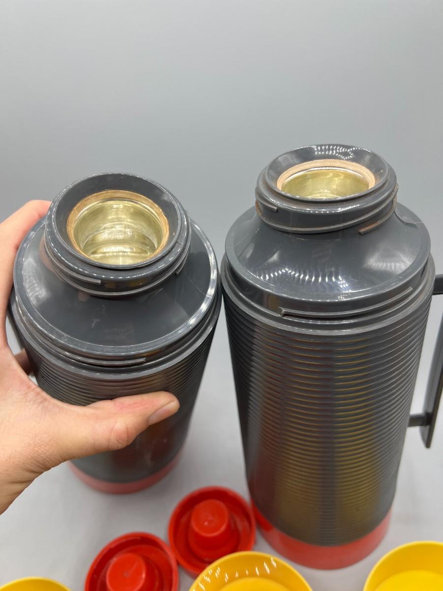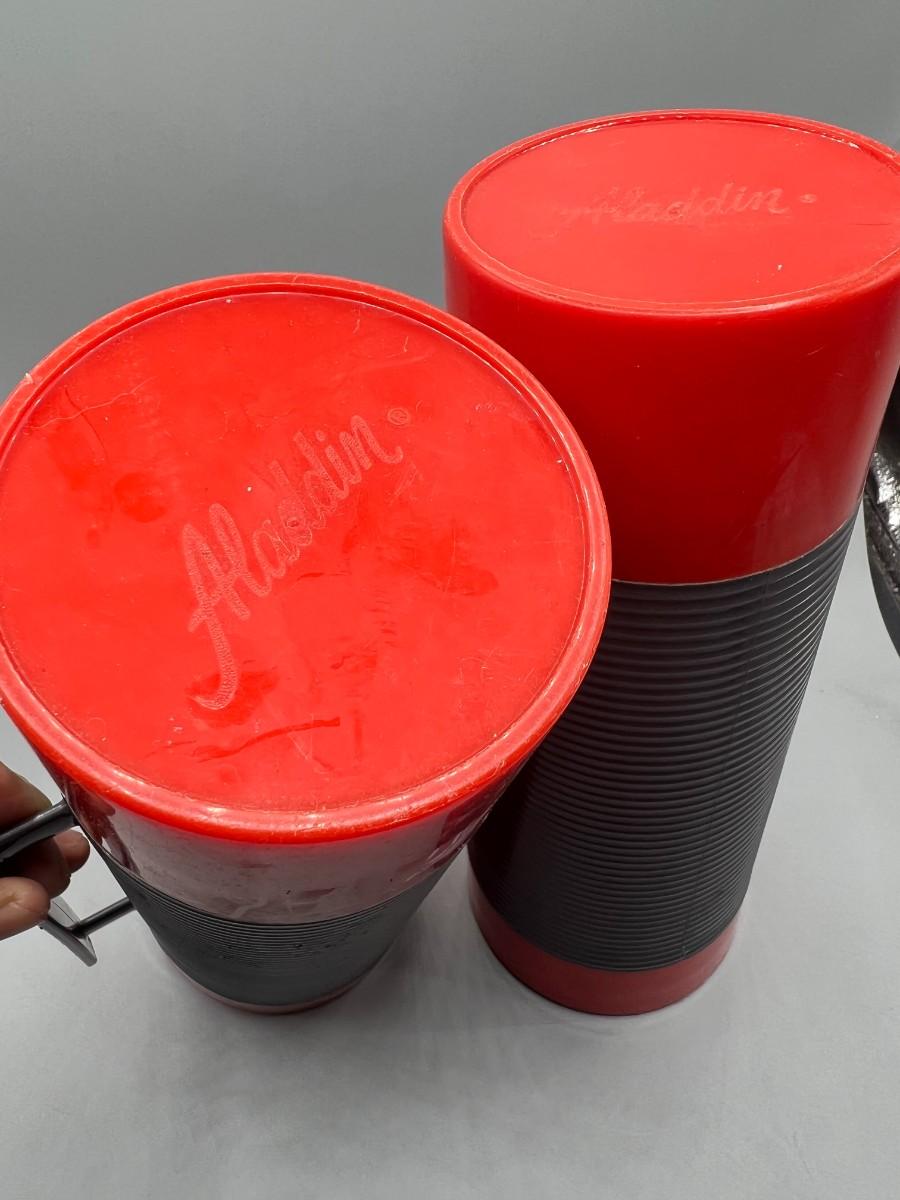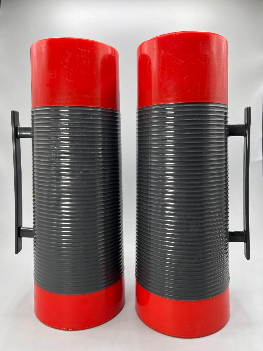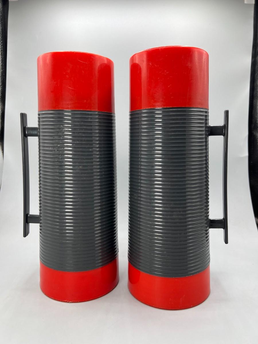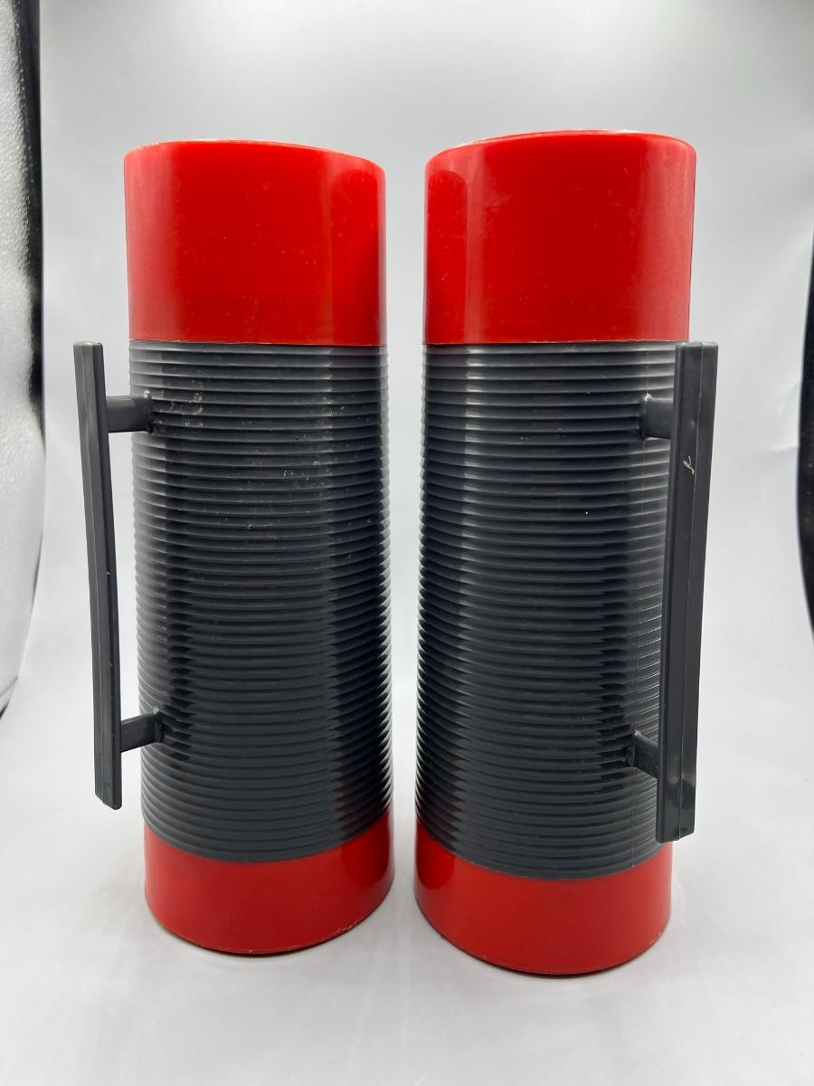 Pair of Vintage Aladdin Dura Clad Thermos Bottles Grey & Red Quart Size