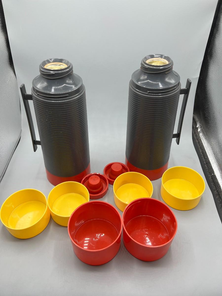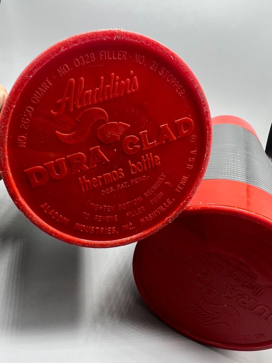 Pair of Vintage Aladdin Dura Clad Thermos Bottles Grey & Red Quart Size. In good vintage condition.