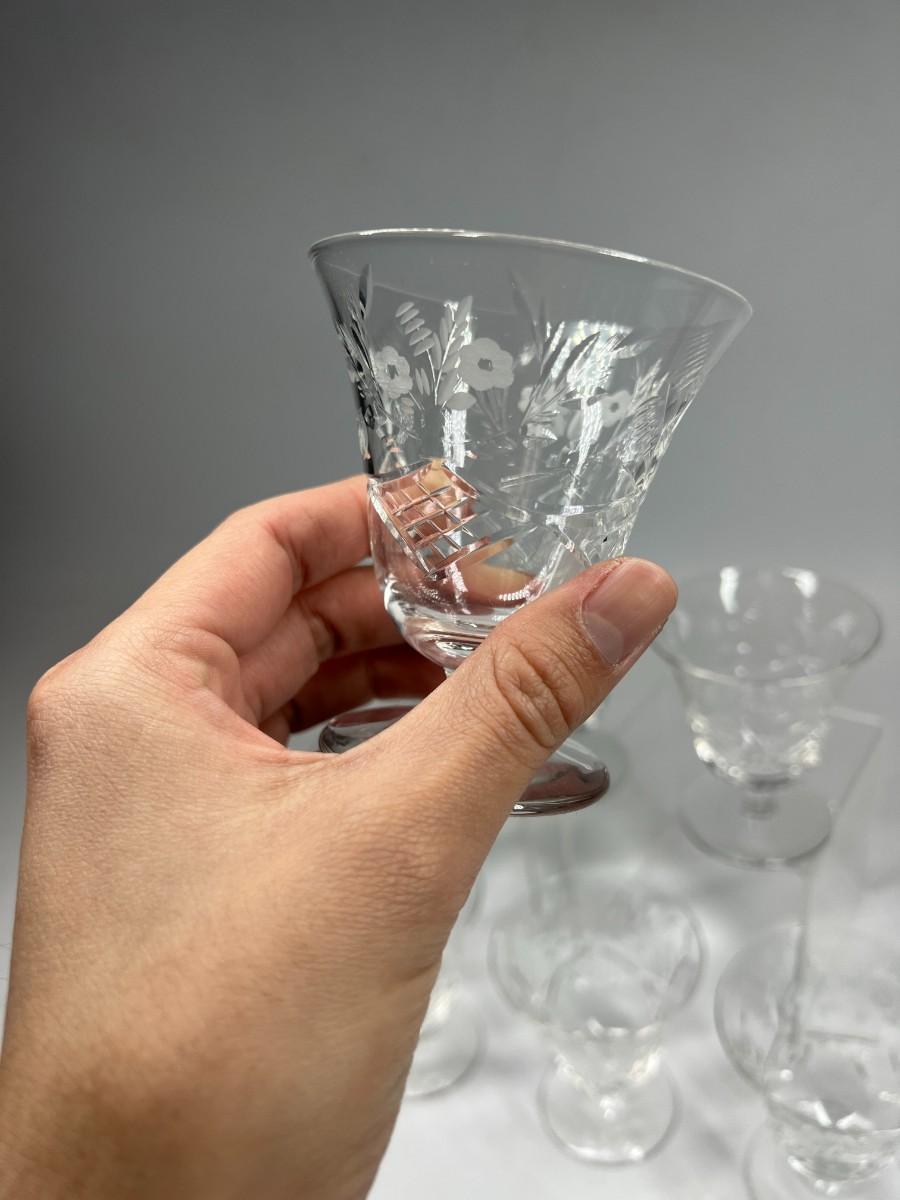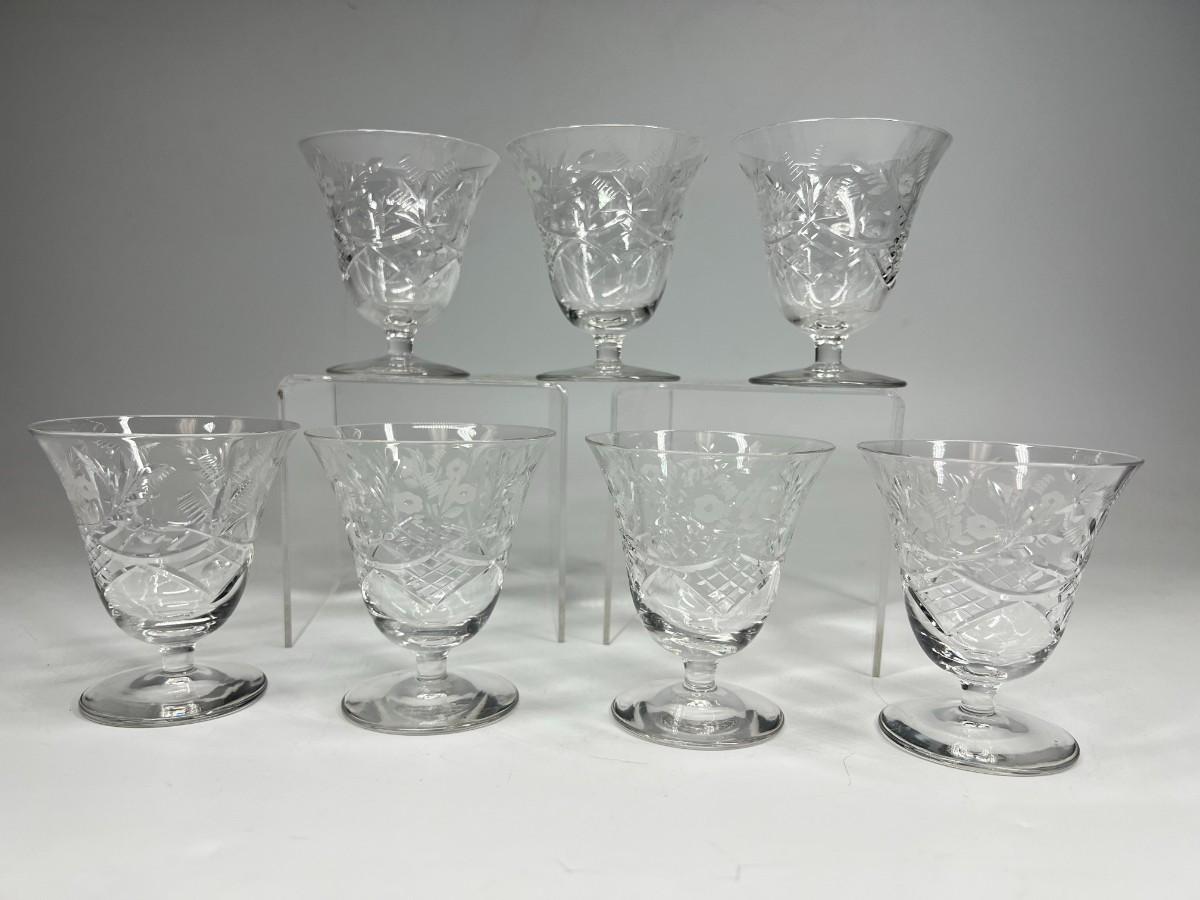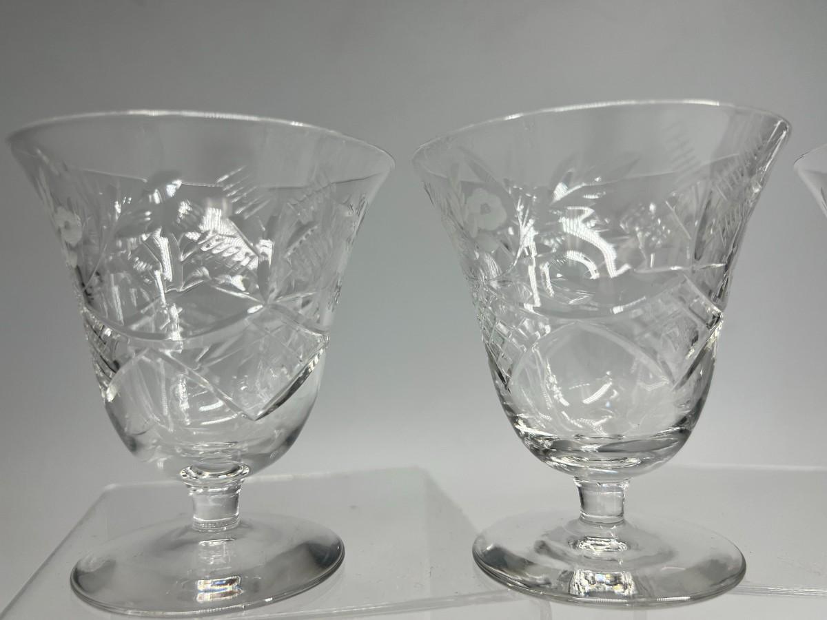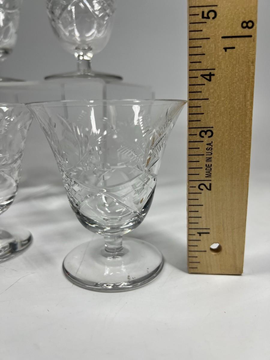 Vintage Set of Floral Etched Cut Crystal Cordial Cocktail Juice Dessert Glasses