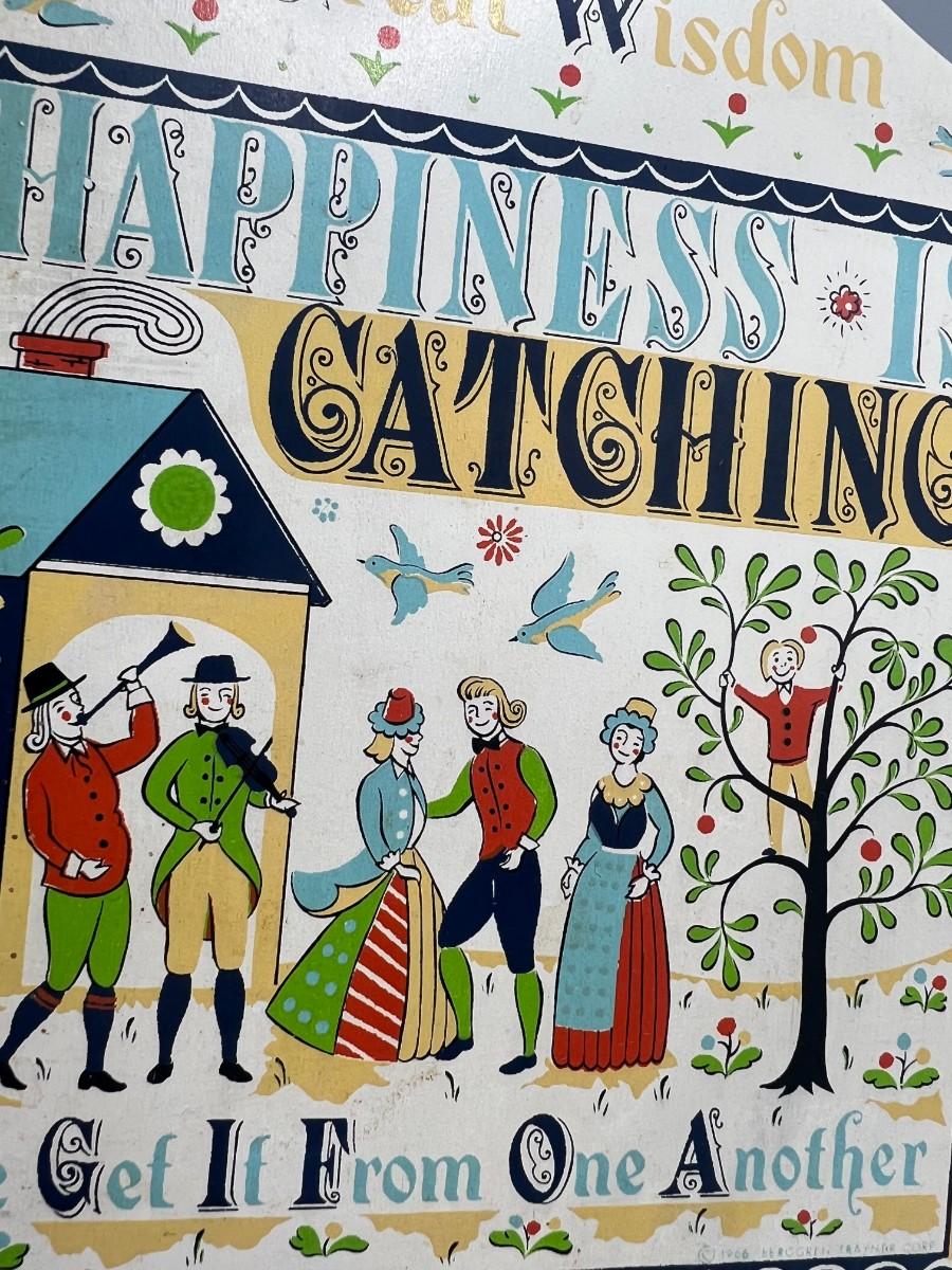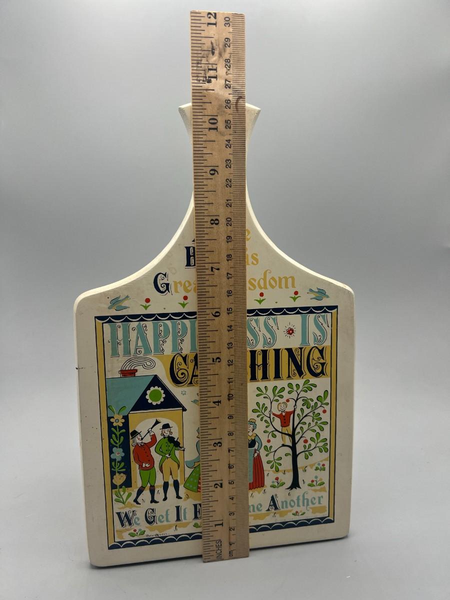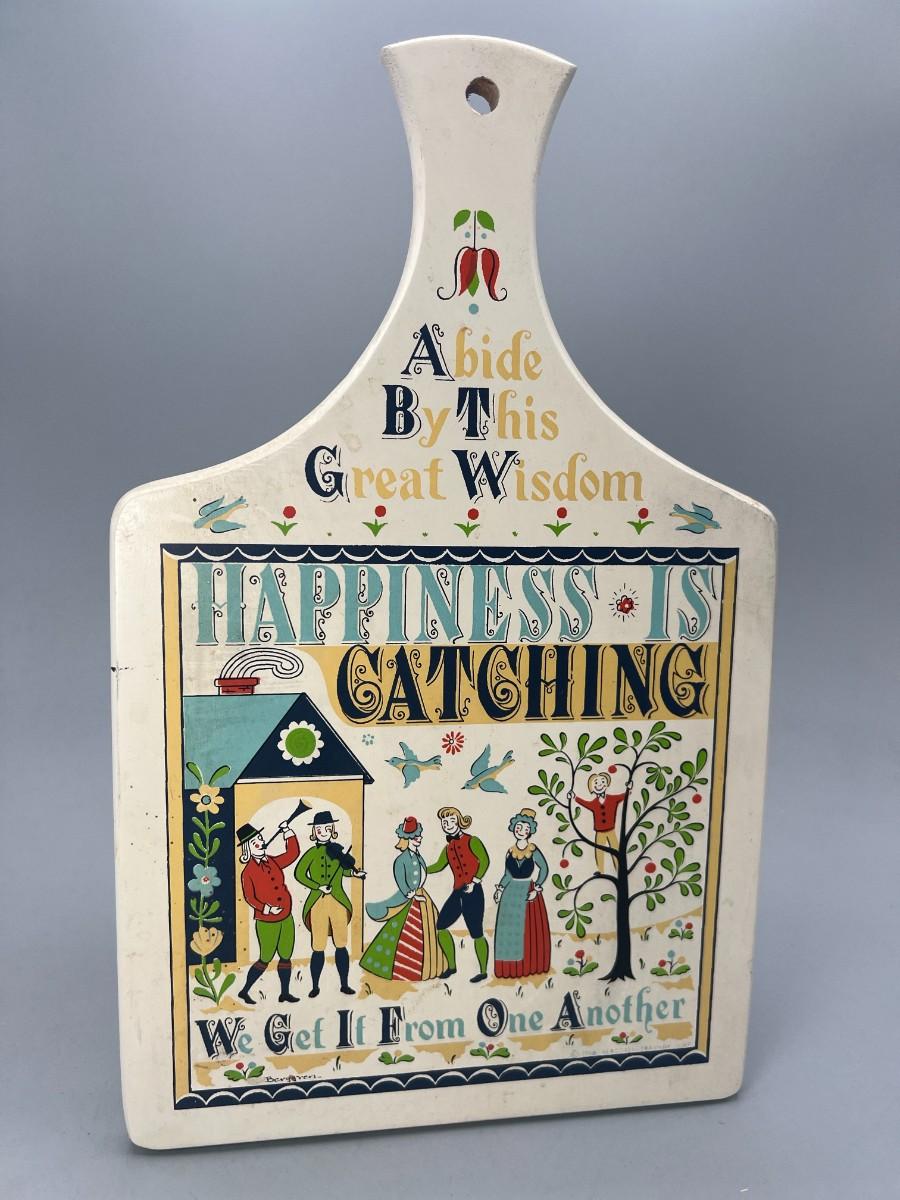 Vintage Folk Art Happiness is Catching Painted Wood Cutting Board Farmhouse Kitchen Decor. In good, displayed condition. May need a bit of cleaning from years of display, but image looks good.