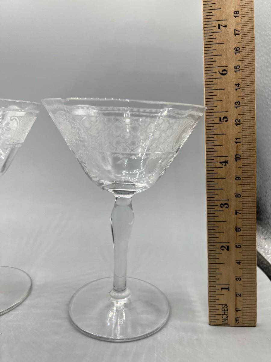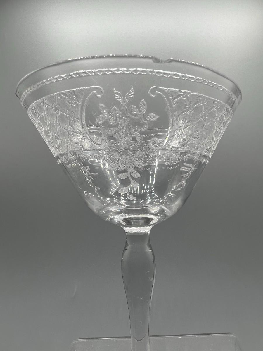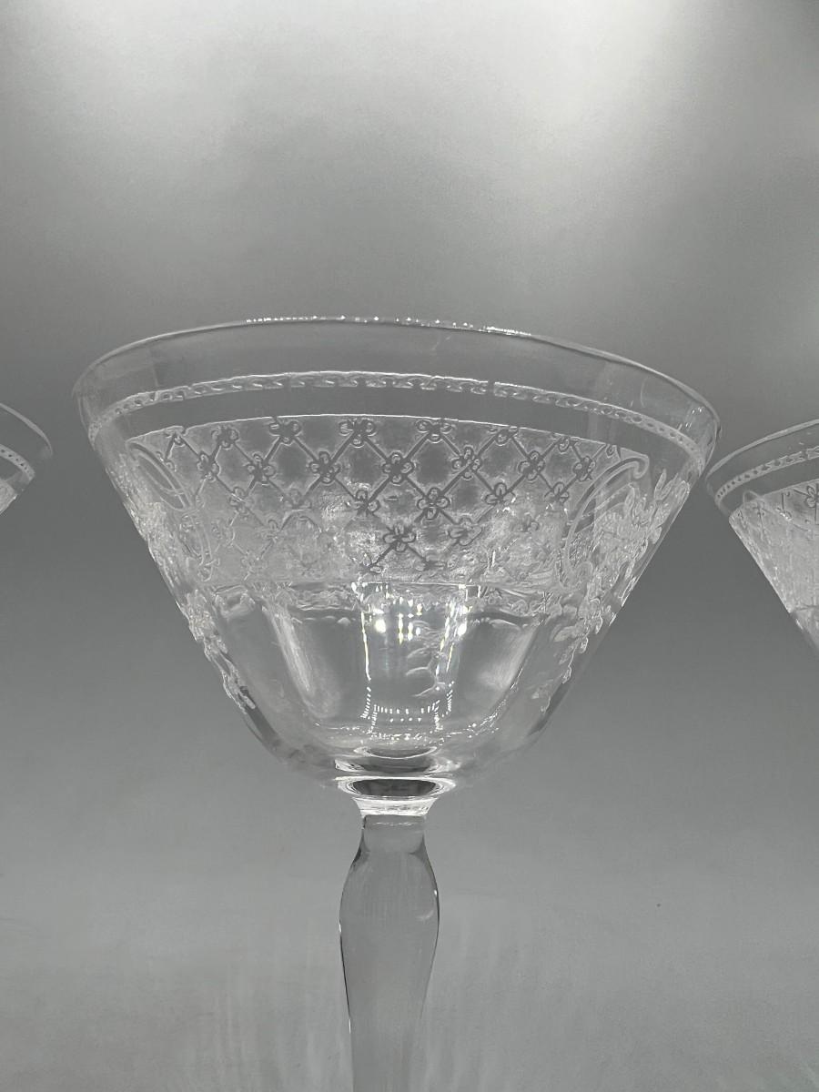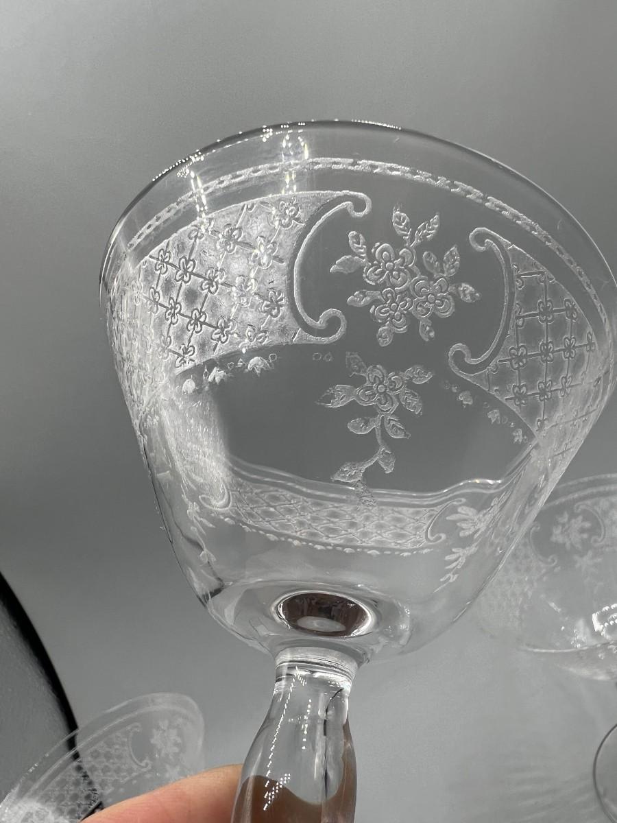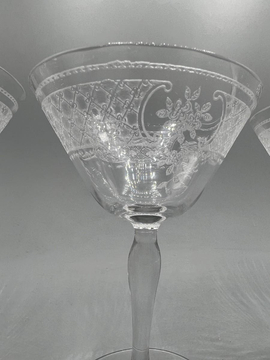 Set of 4 Vintage Etched Champagne Wine Glasses. Beautiful floral lattice design. In vintage condition, may have flea bite chips. About 5" size.