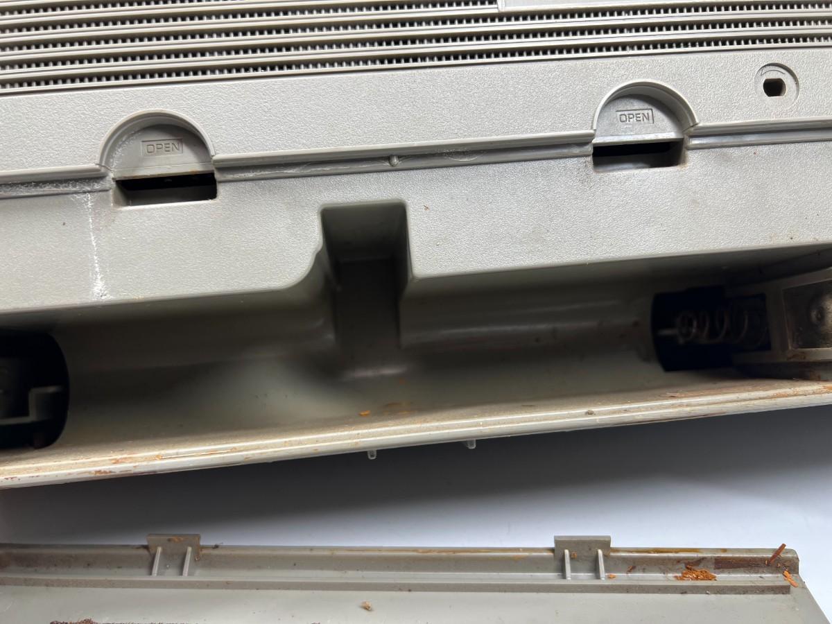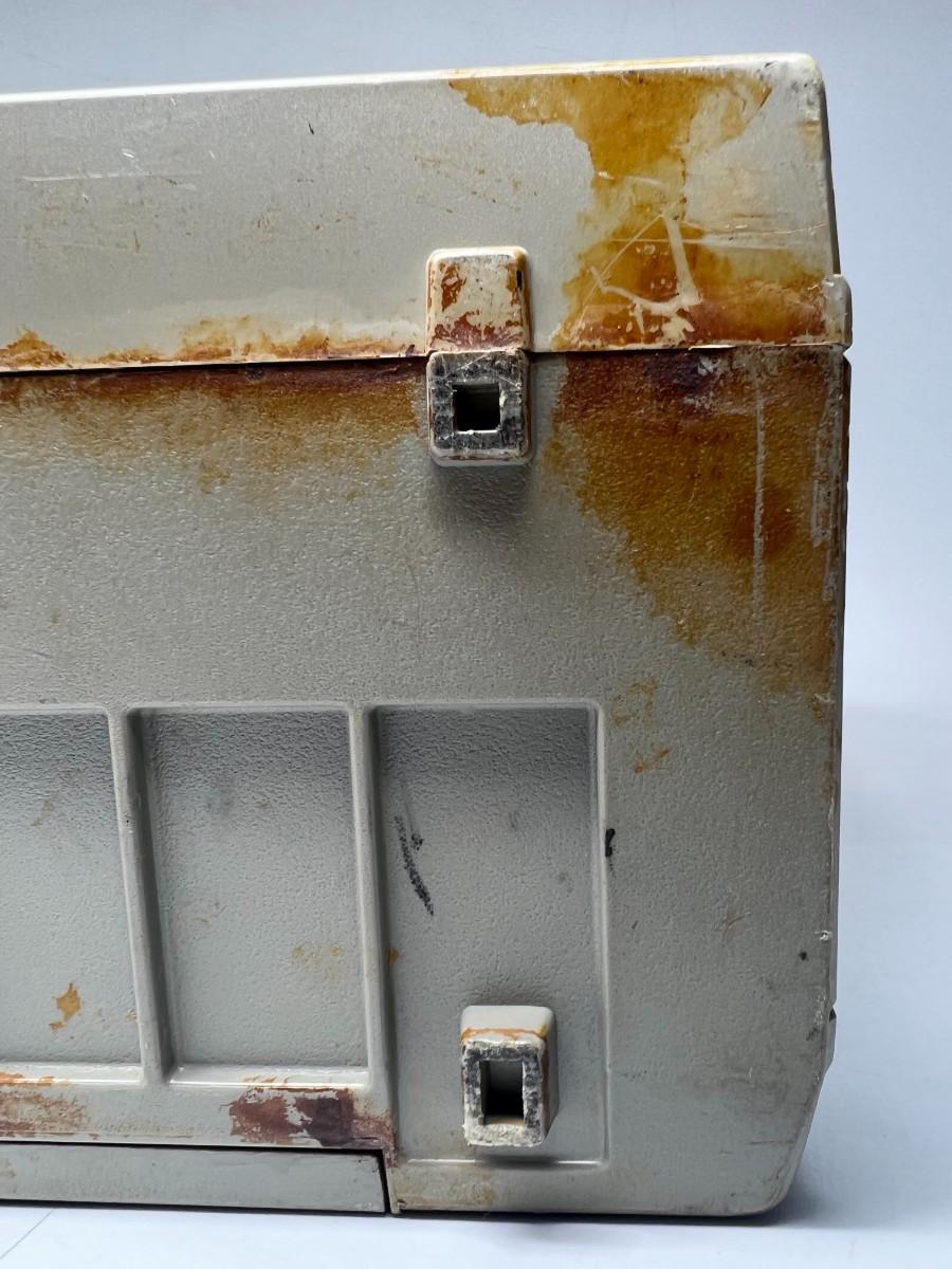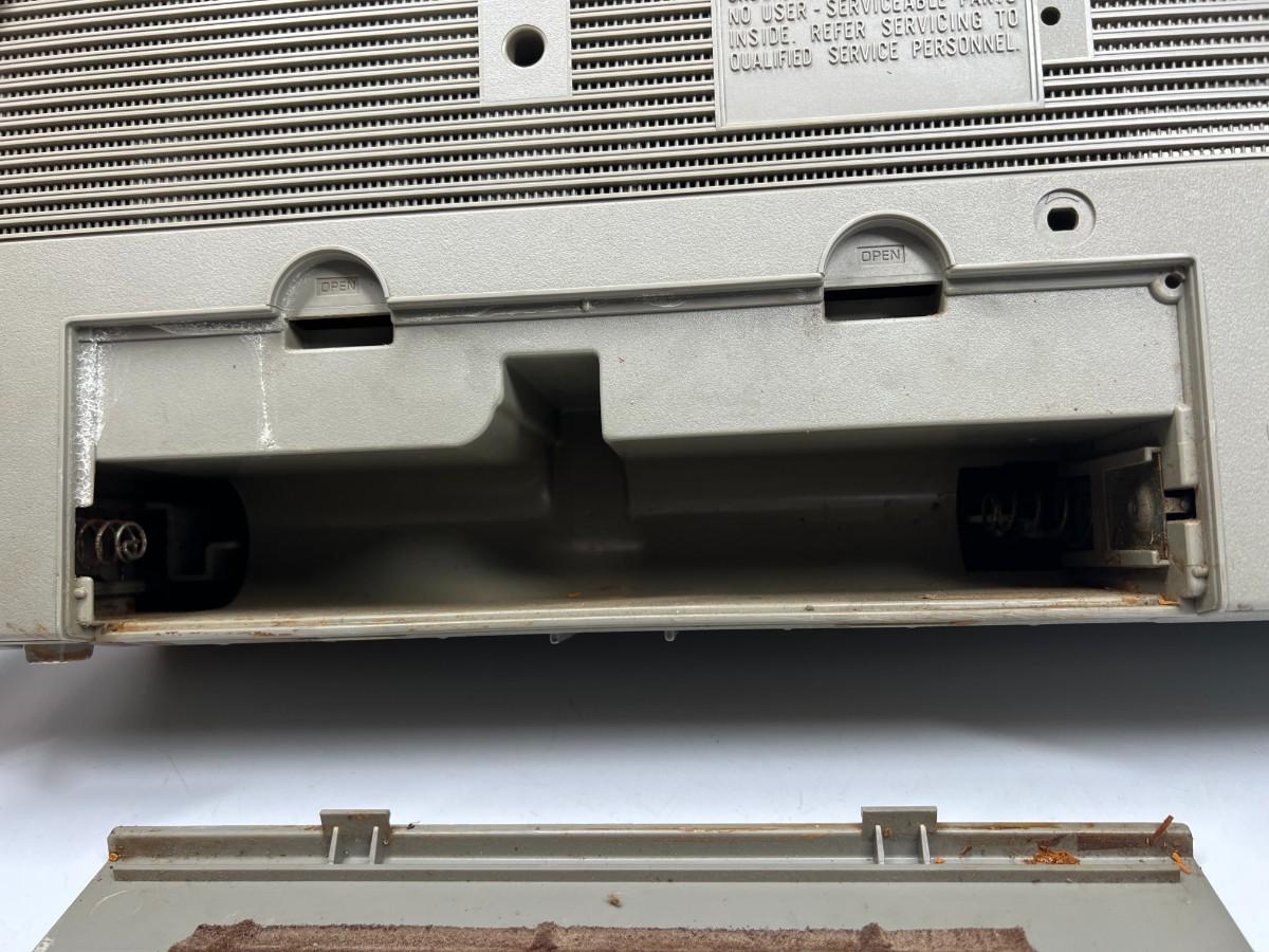 There is vintage wear to the boombox, but there is no significant damage and is in good useable or collectible condition. There is no corrosion where the batteries are placed, has not been tested with batteries. Has been plugged in and tested, and works perfectly. Very loud, each individual speaker works perfectly.