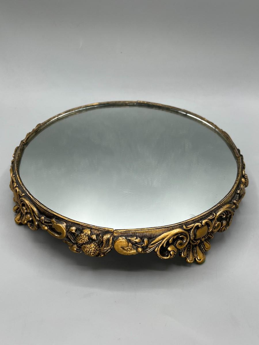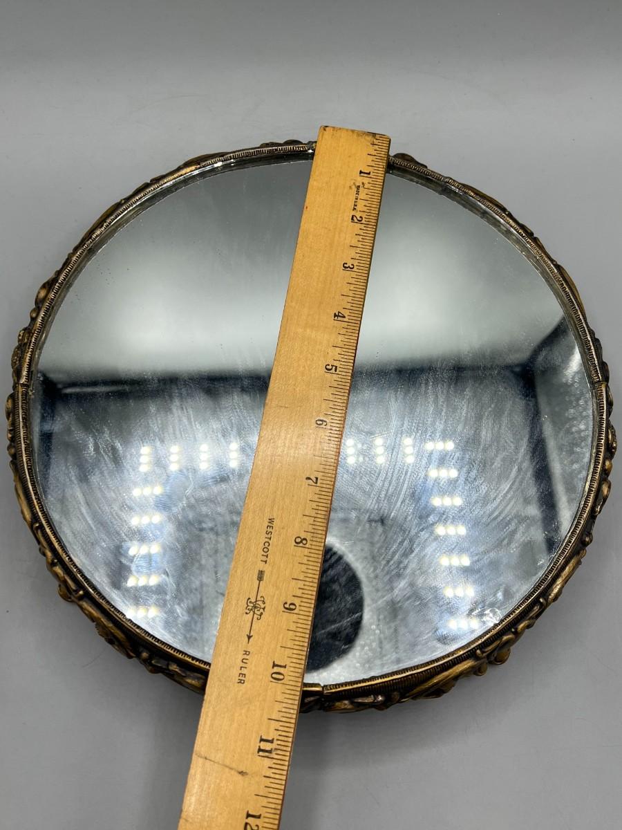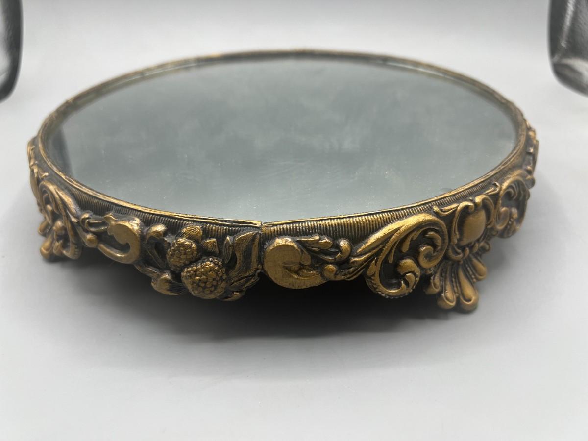 Vintage Hollywood Regency Victorian Mirrored Footed Perfume Vanity Makeup Tray. In vintage condition, some light signs of use. Beautiful art nouveau details to the base. About 10" diameter.