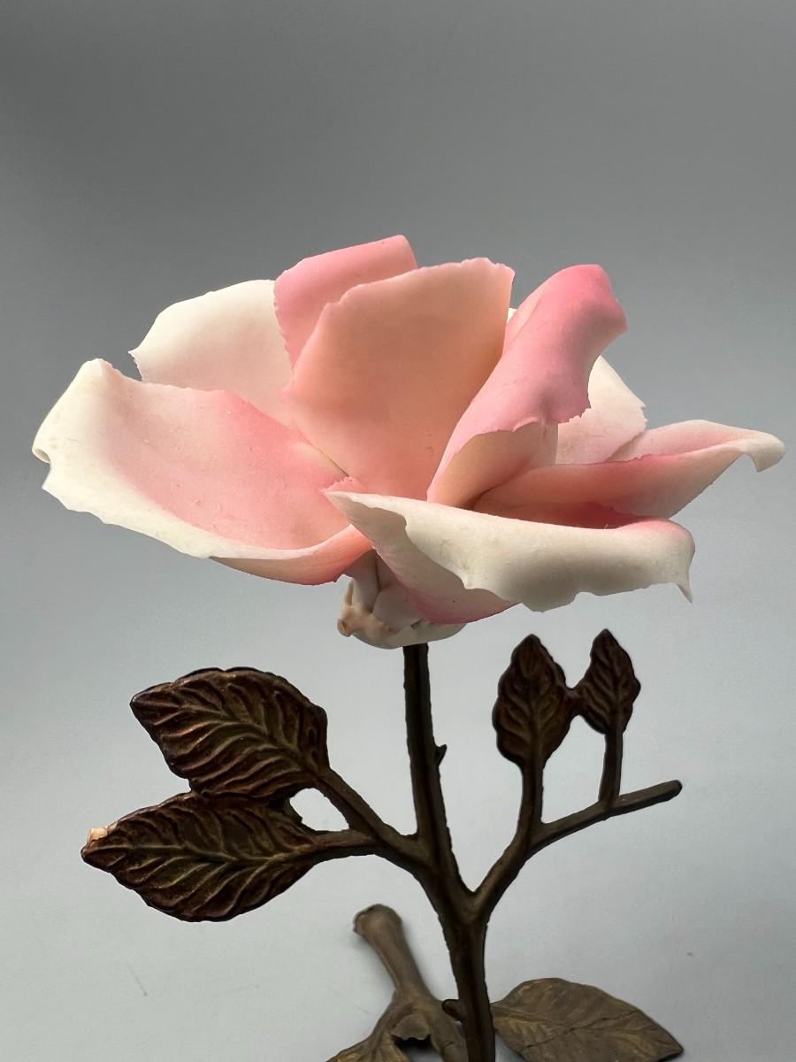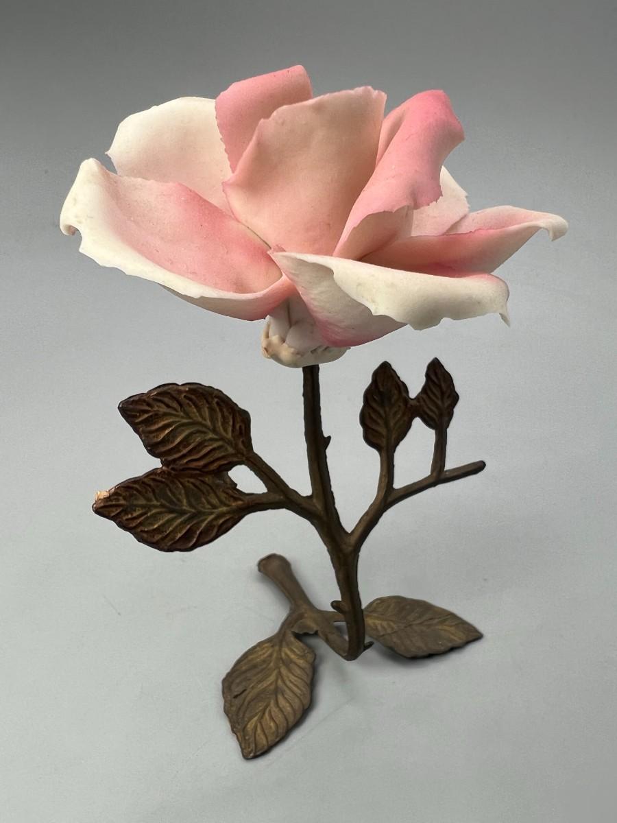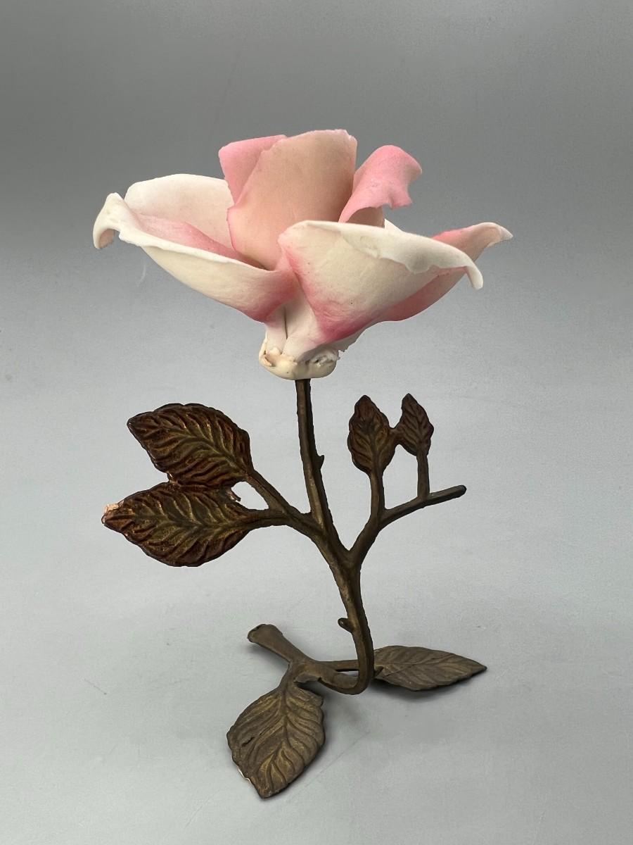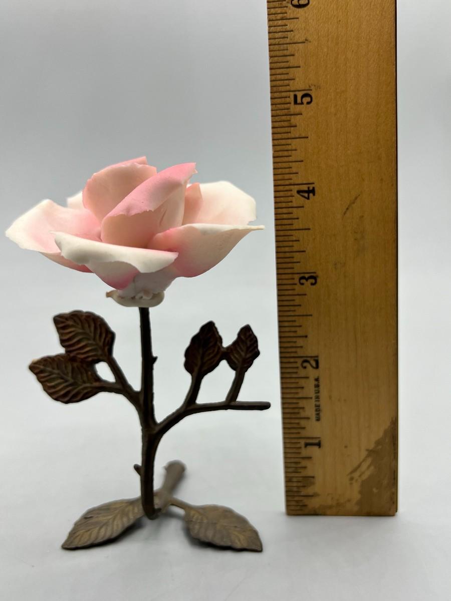 Vintage Brass and Porcelain Capodimonte Pink Rose Figurine. Original sticker attached. There is some chipping along petal edge. Under 5" size.