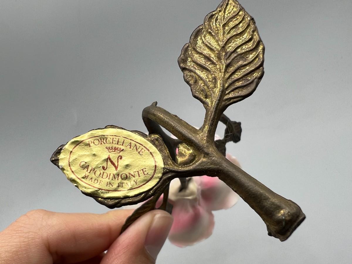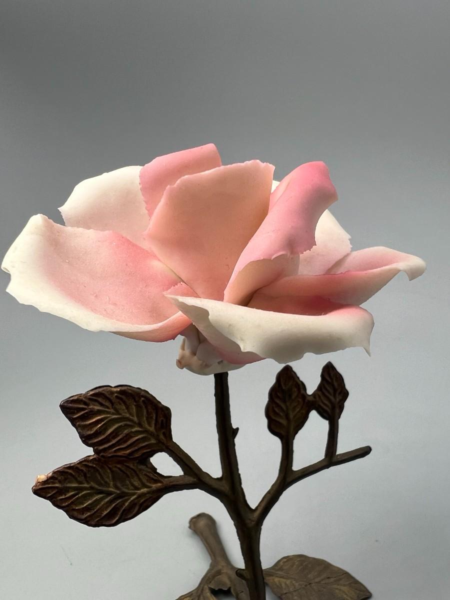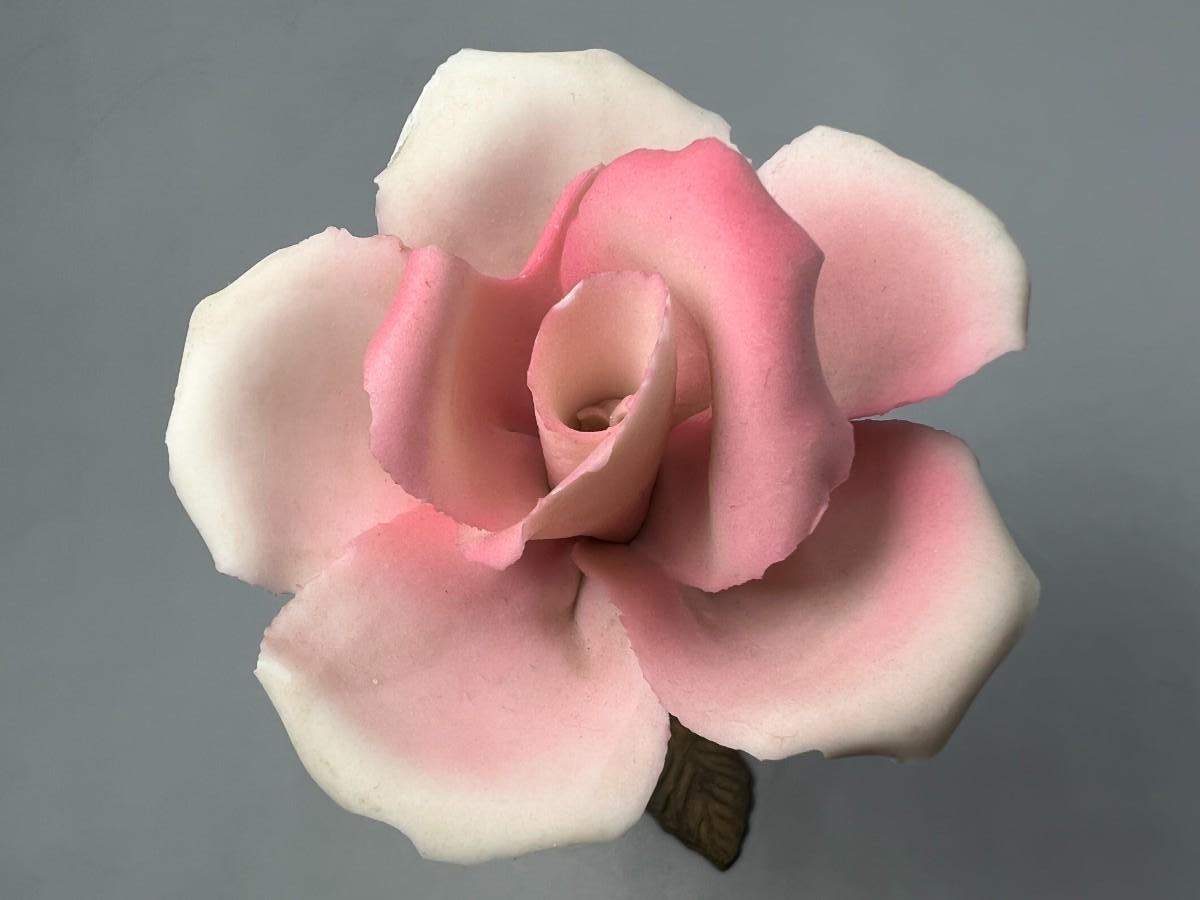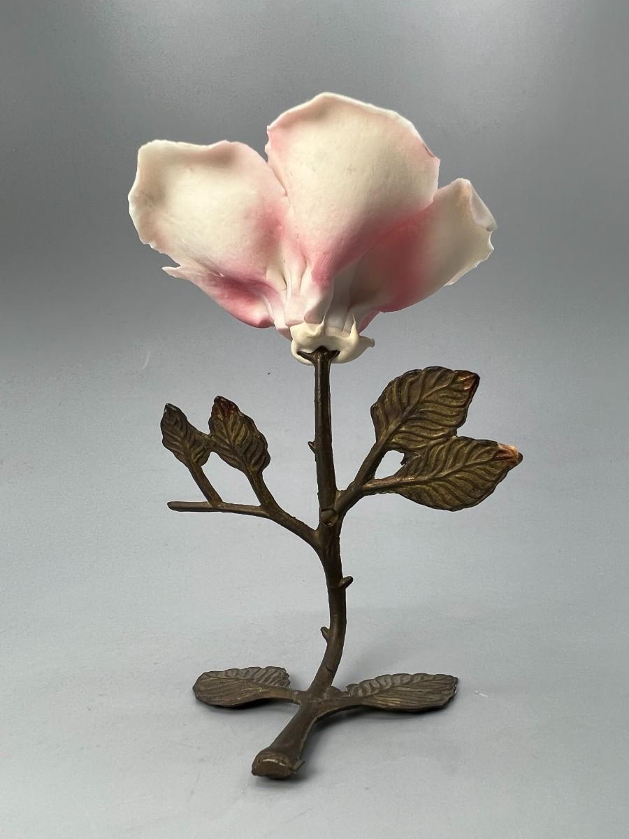 Vintage Brass and Porcelain Capodimonte Pink Rose Figurine. Original sticker attached. There is some chipping along petal edge. Under 5" size.
