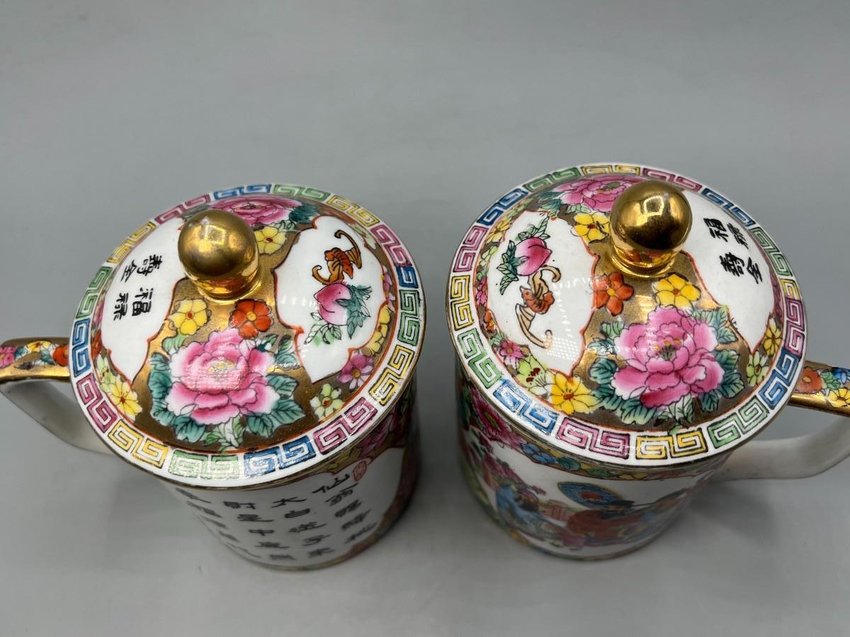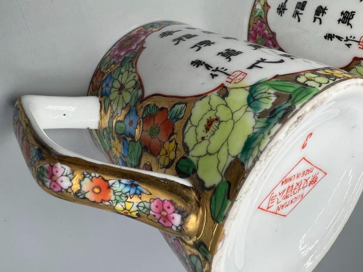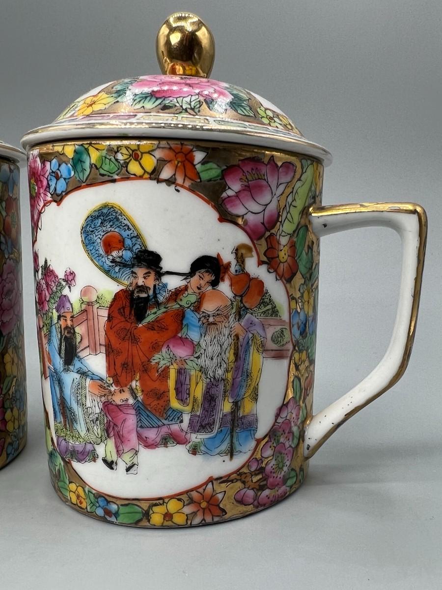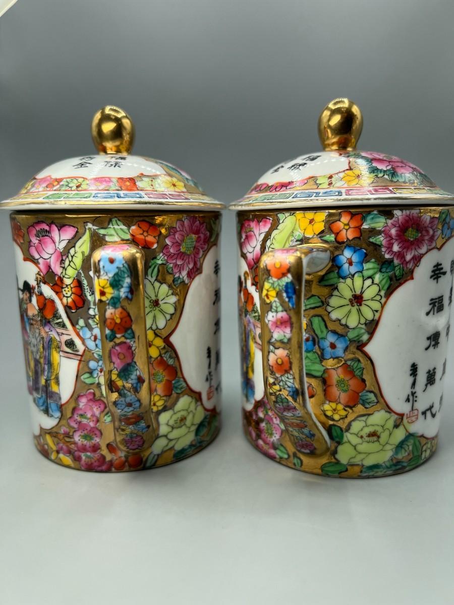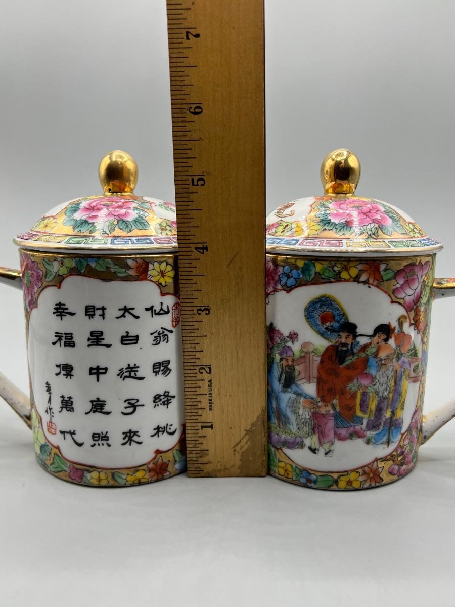 Vintage Hand Painted Colorful Kockman Made in China Lidded Teacups. In good condition. Display great. Colorfully painted with gold accent. About 5.5" with lid.