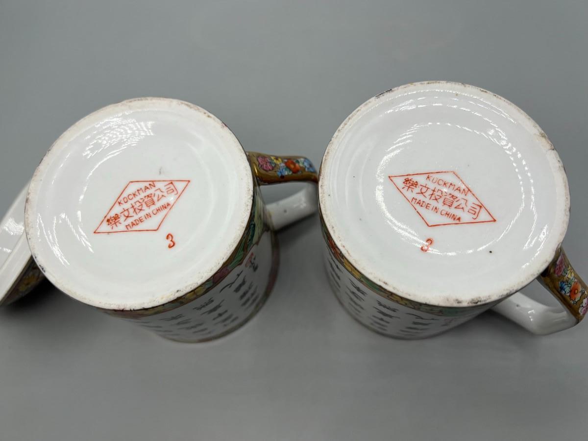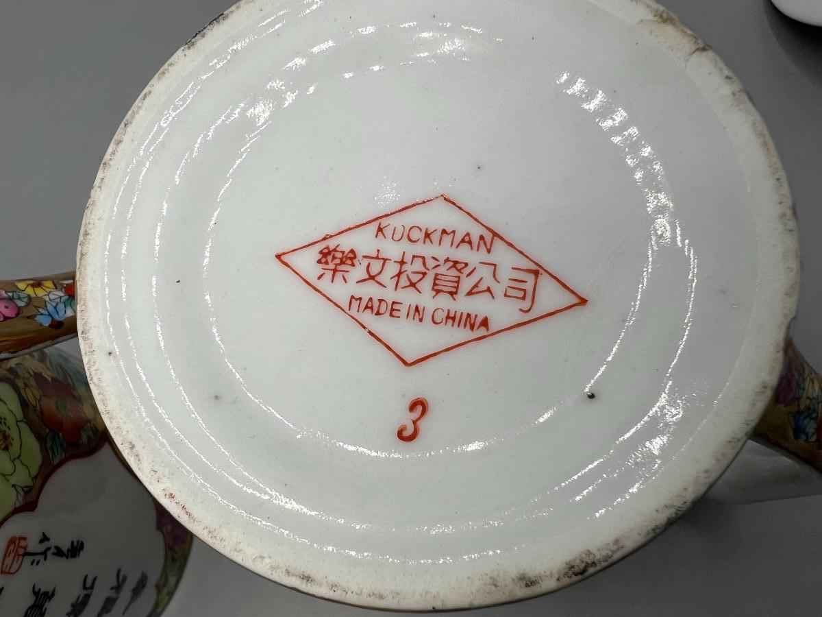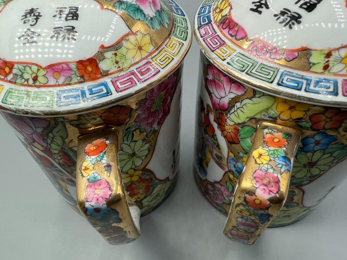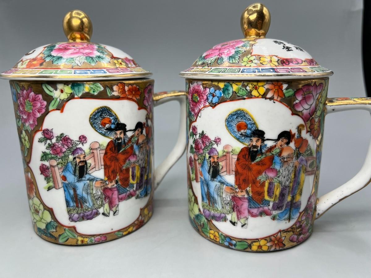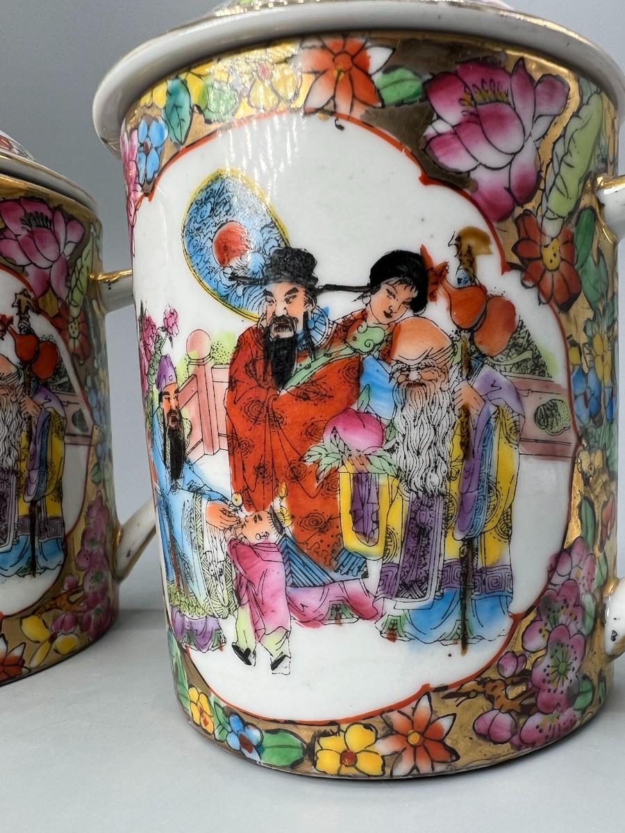 Vintage Hand Painted Colorful Kockman Made in China Lidded Teacups. In good condition. Display great. Colorfully painted with gold accent. About 5.5" with lid.