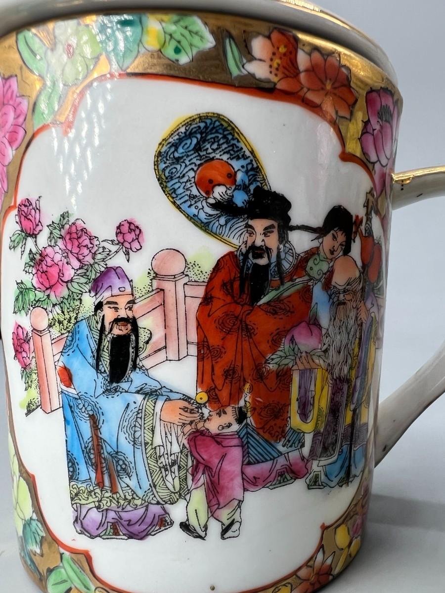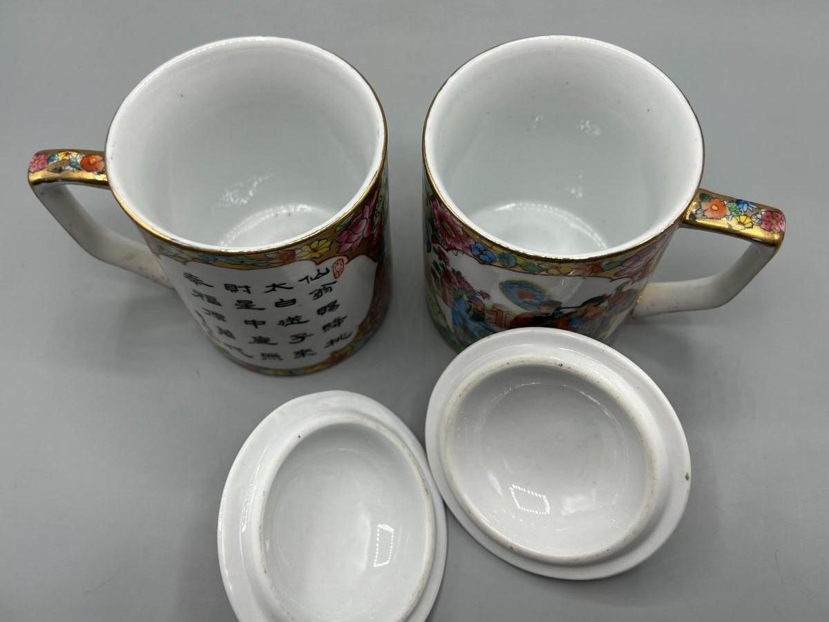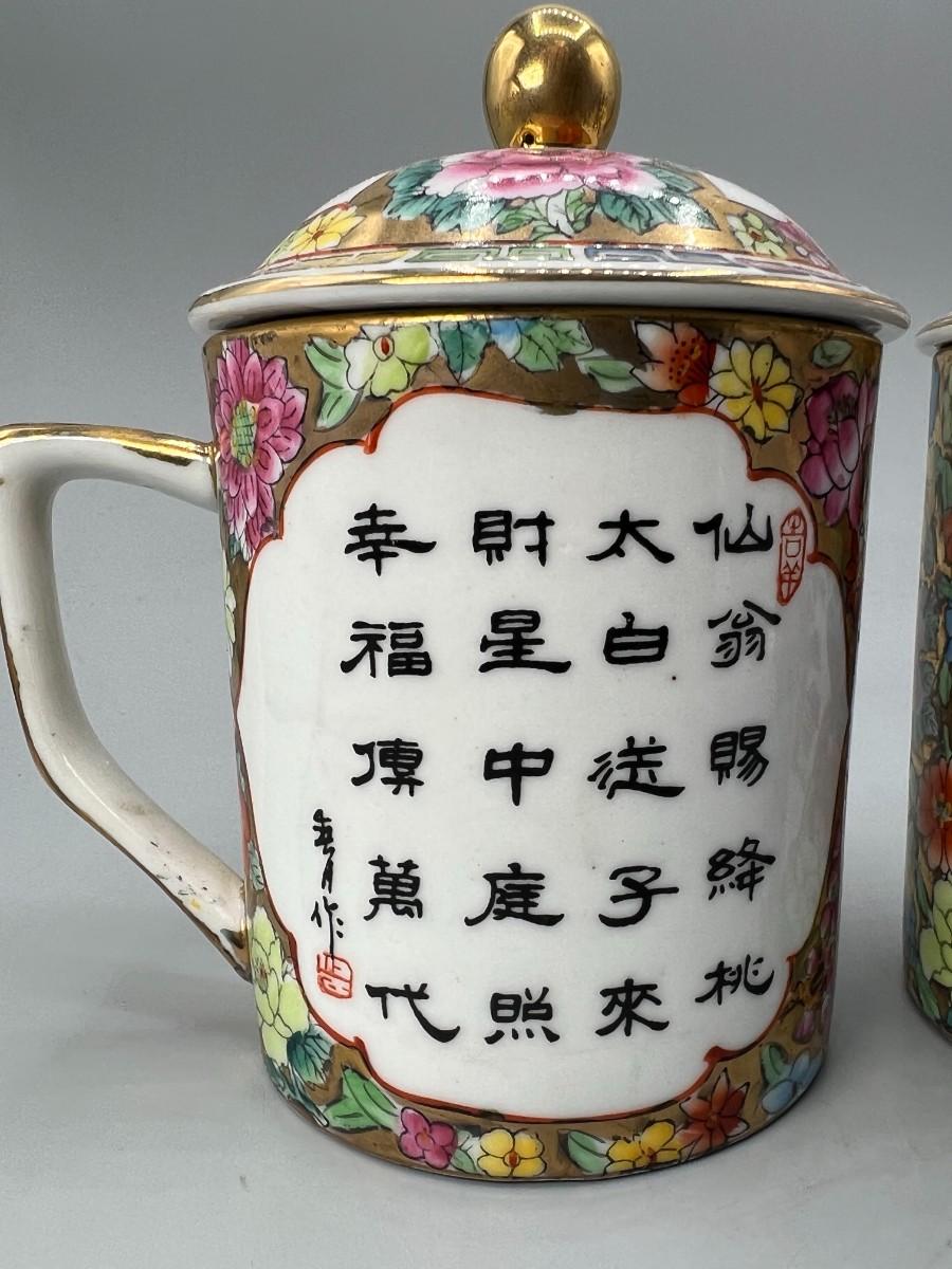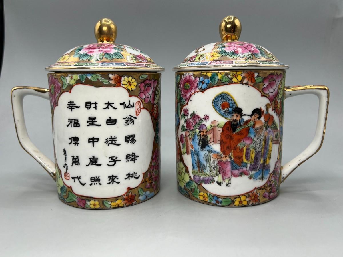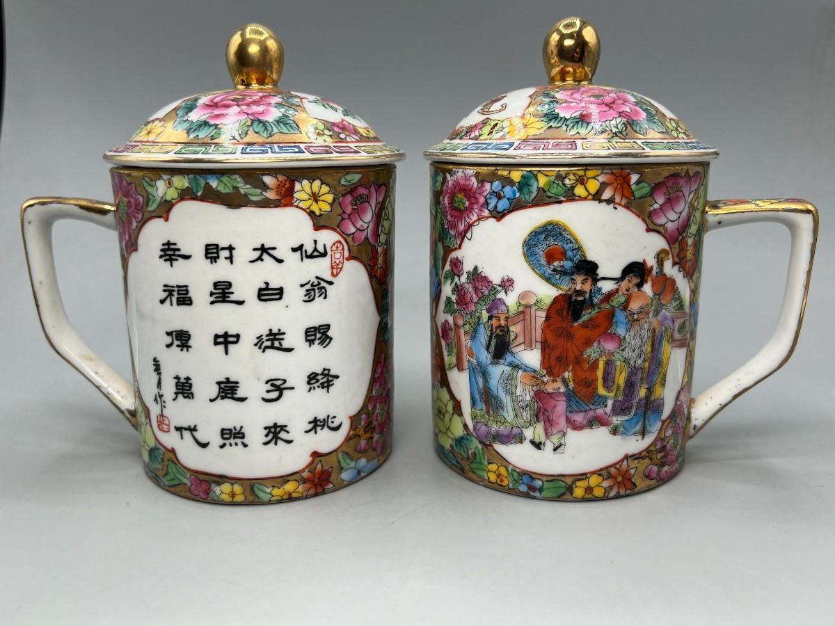 Vintage Hand Painted Colorful Kockman Made in China Lidded Teacups. In good condition. Display great. Colorfully painted with gold accent. About 5.5" with lid.