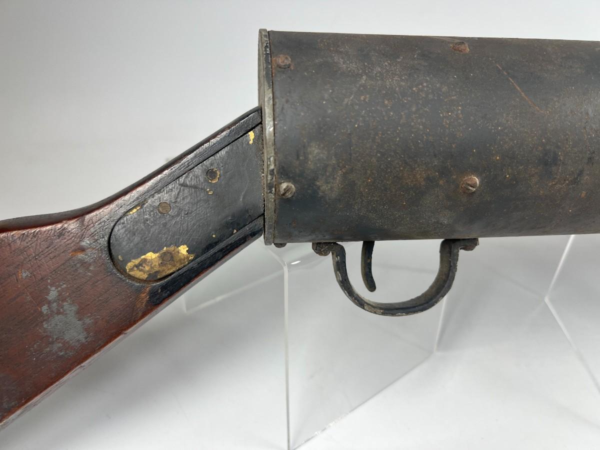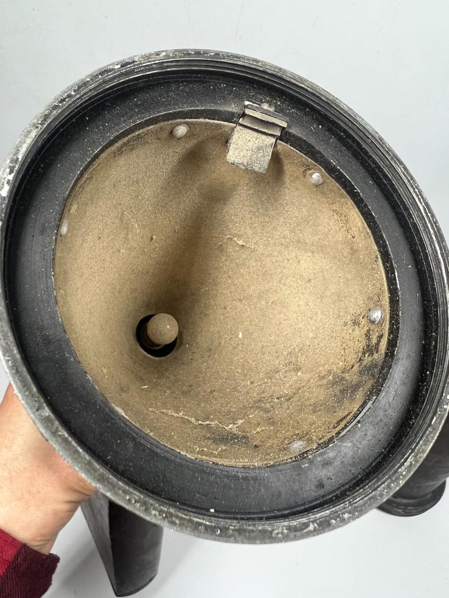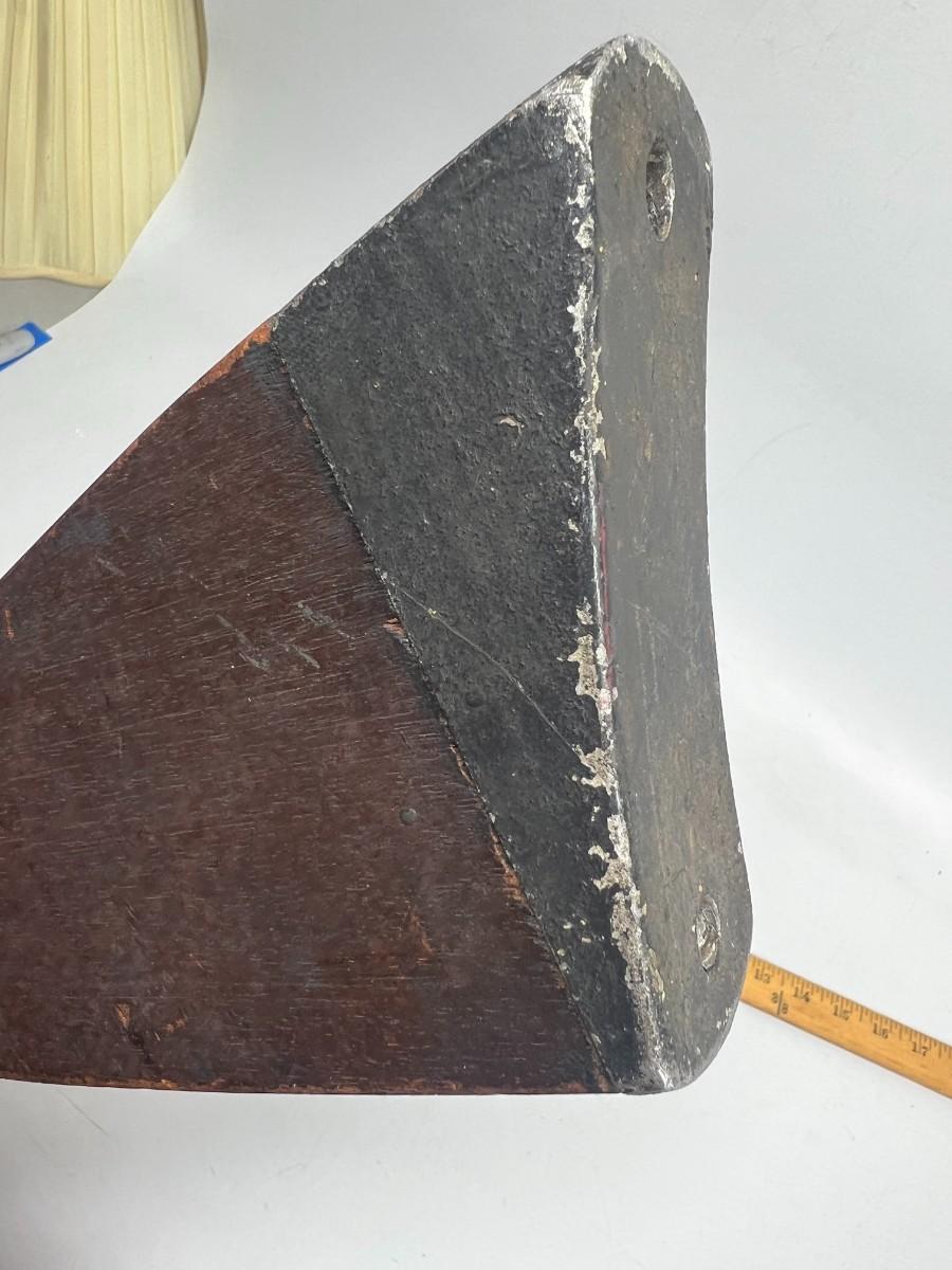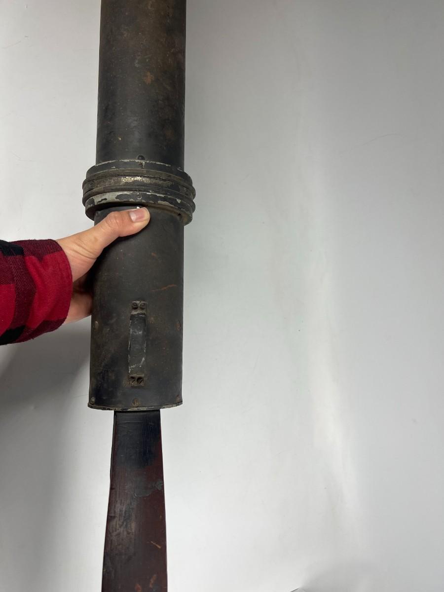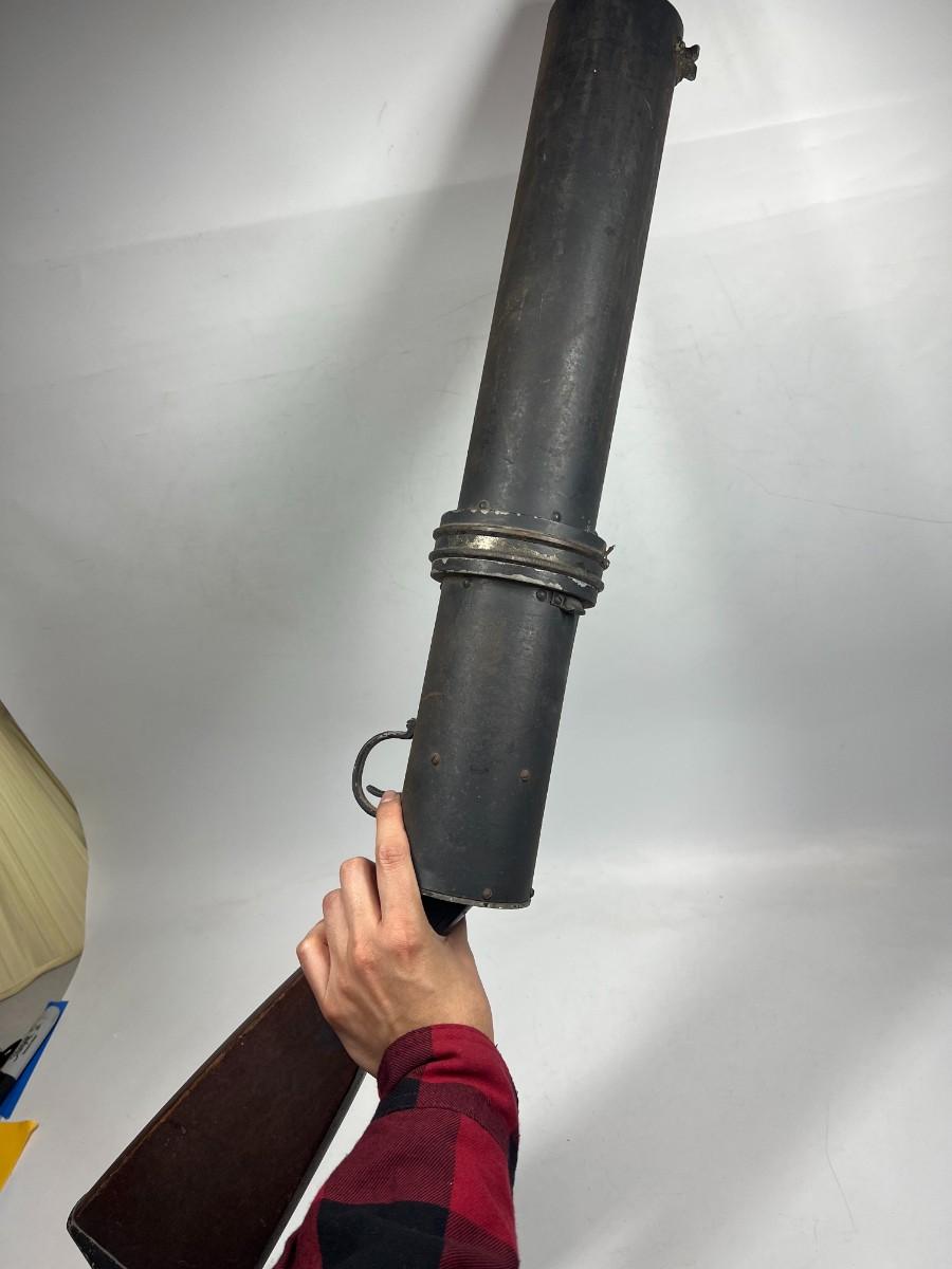 There is vintage wear to the metal & wood, but there is no significant damage and is in good displayable condition. The barrel can be unscrewed to get to the light bulb. The light bulb does not turn on, check pictures for more details and for sizing.