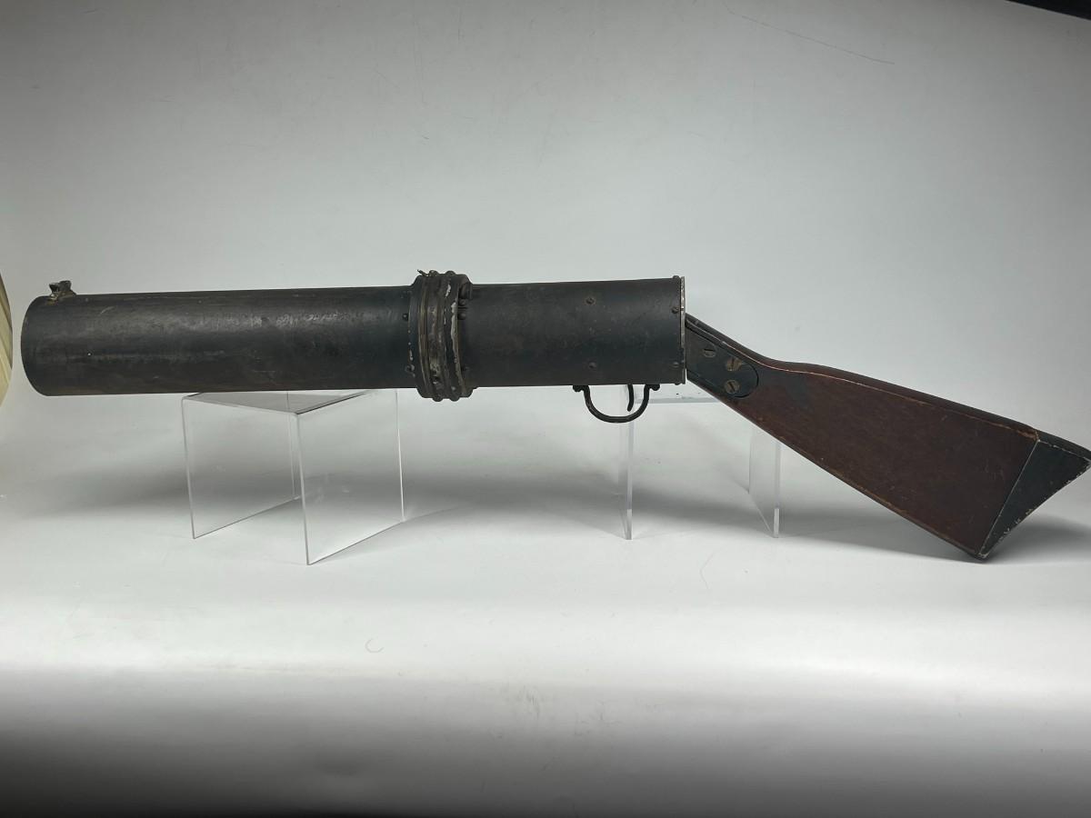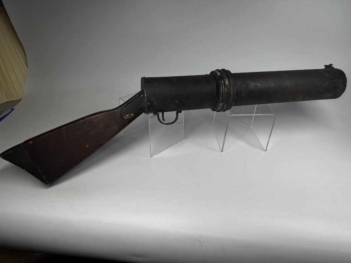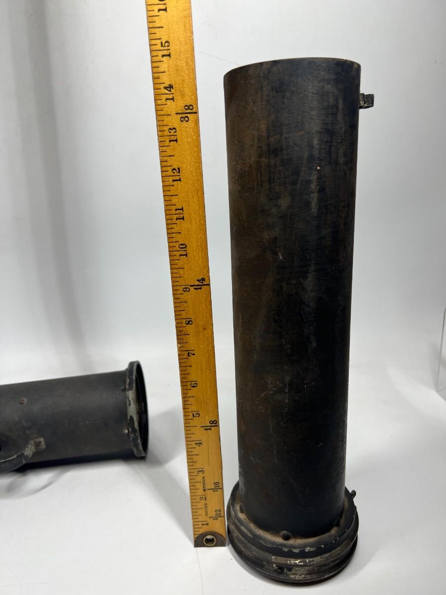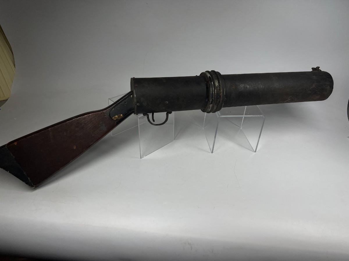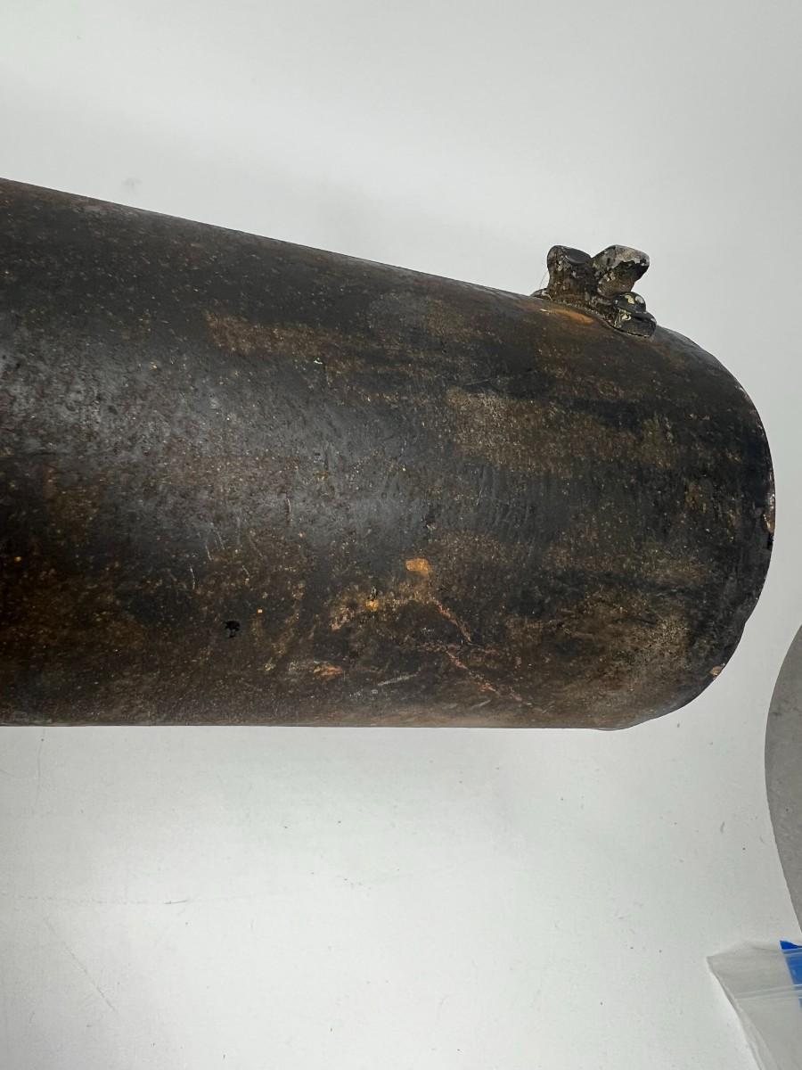 There is vintage wear to the metal & wood, but there is no significant damage and is in good displayable condition. The barrel can be unscrewed to get to the light bulb. The light bulb does not turn on, check pictures for more details and for sizing.