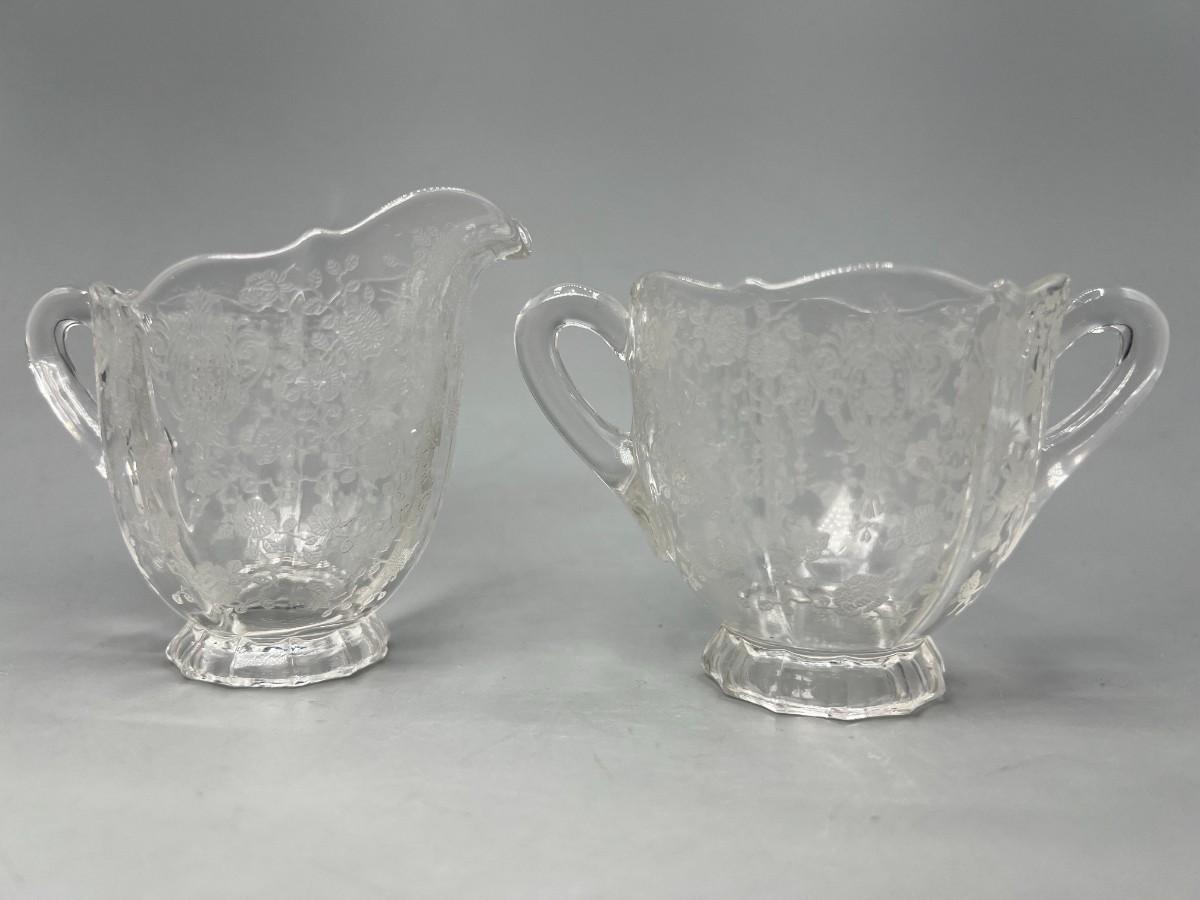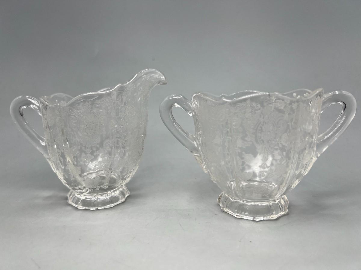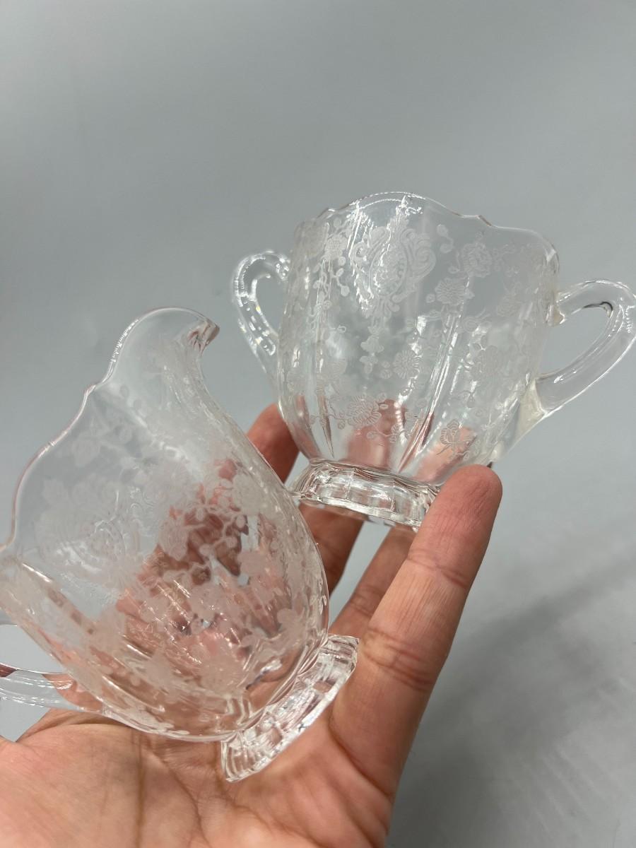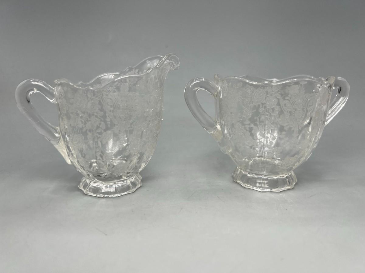 Pair of Retro Cambridge Portia Style Rose Pattern Print Clear Glass Creamer PItcher & Sugar Container Teaware
