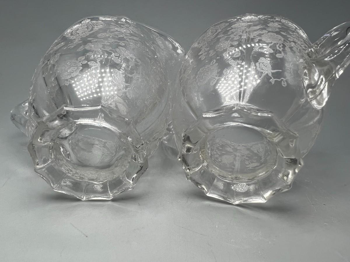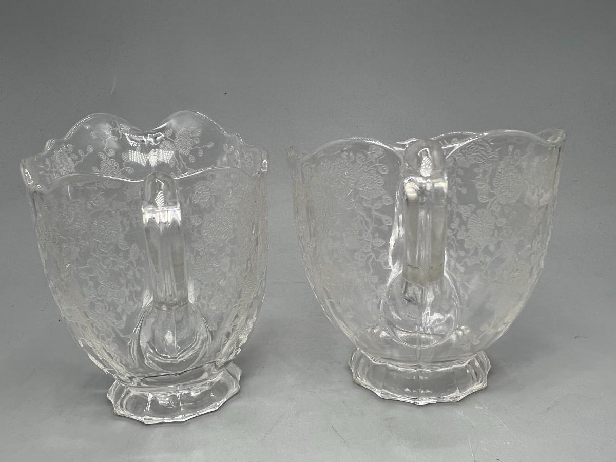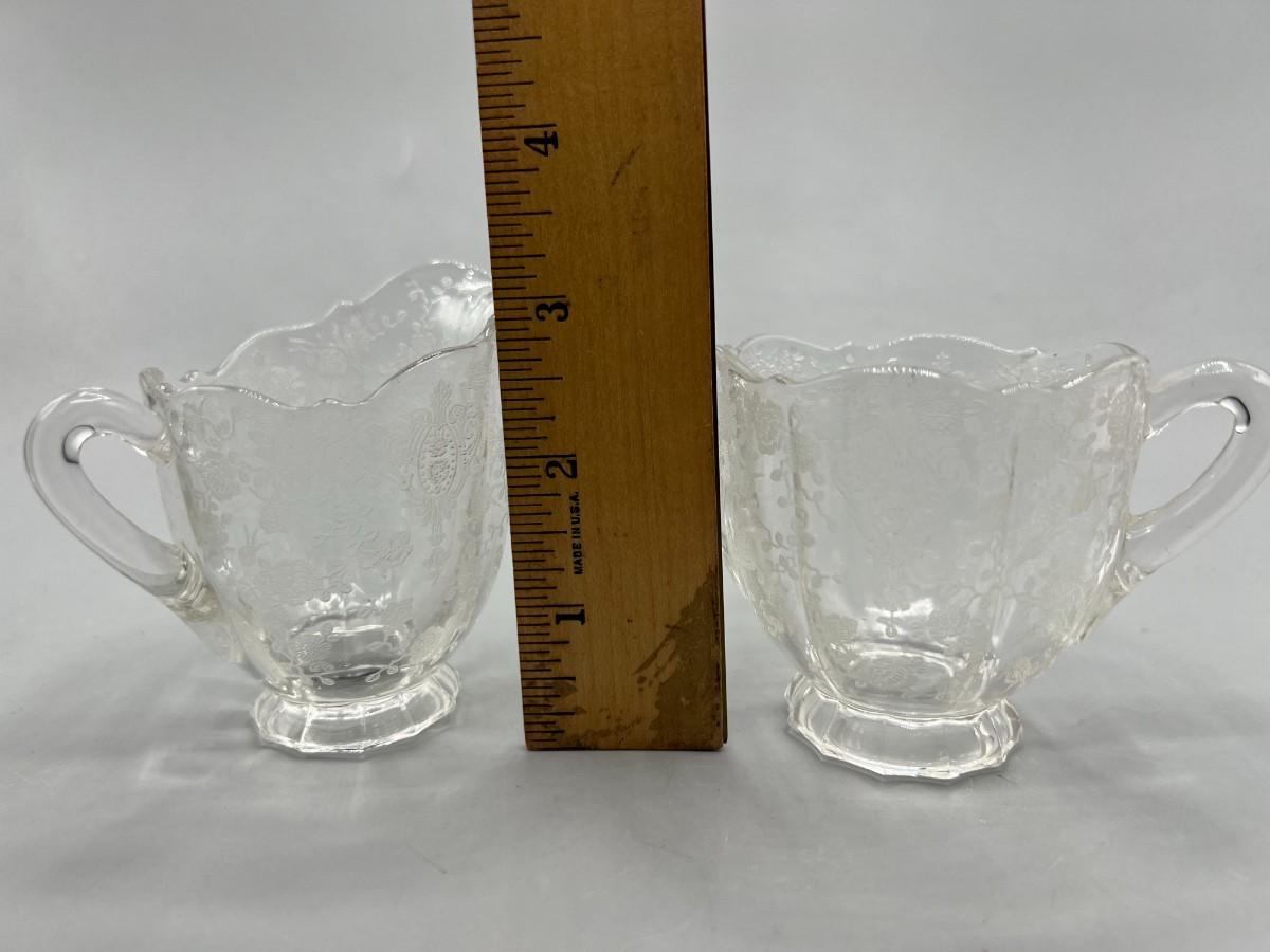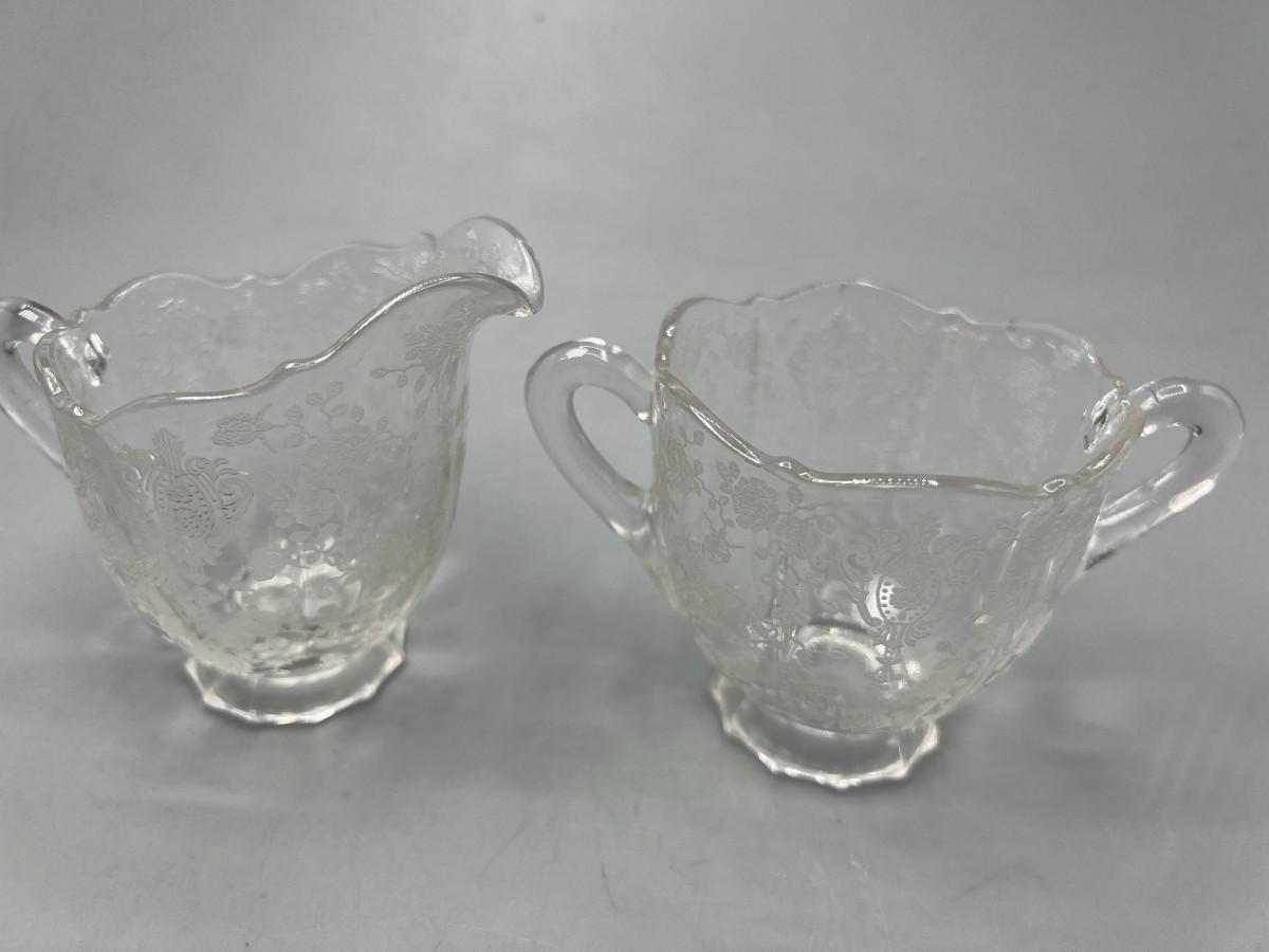 Pair of Retro Cambridge Portia Style Rose Pattern Print Clear Glass Creamer PItcher & Sugar Container Teaware