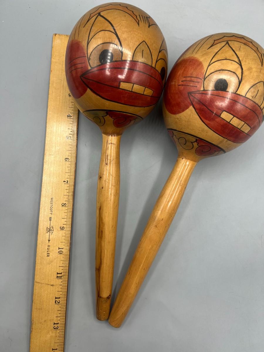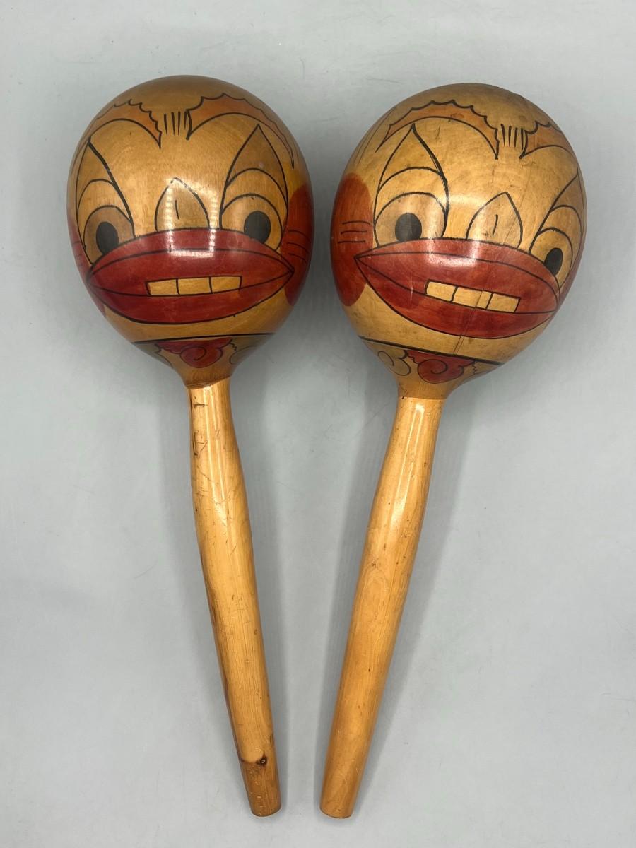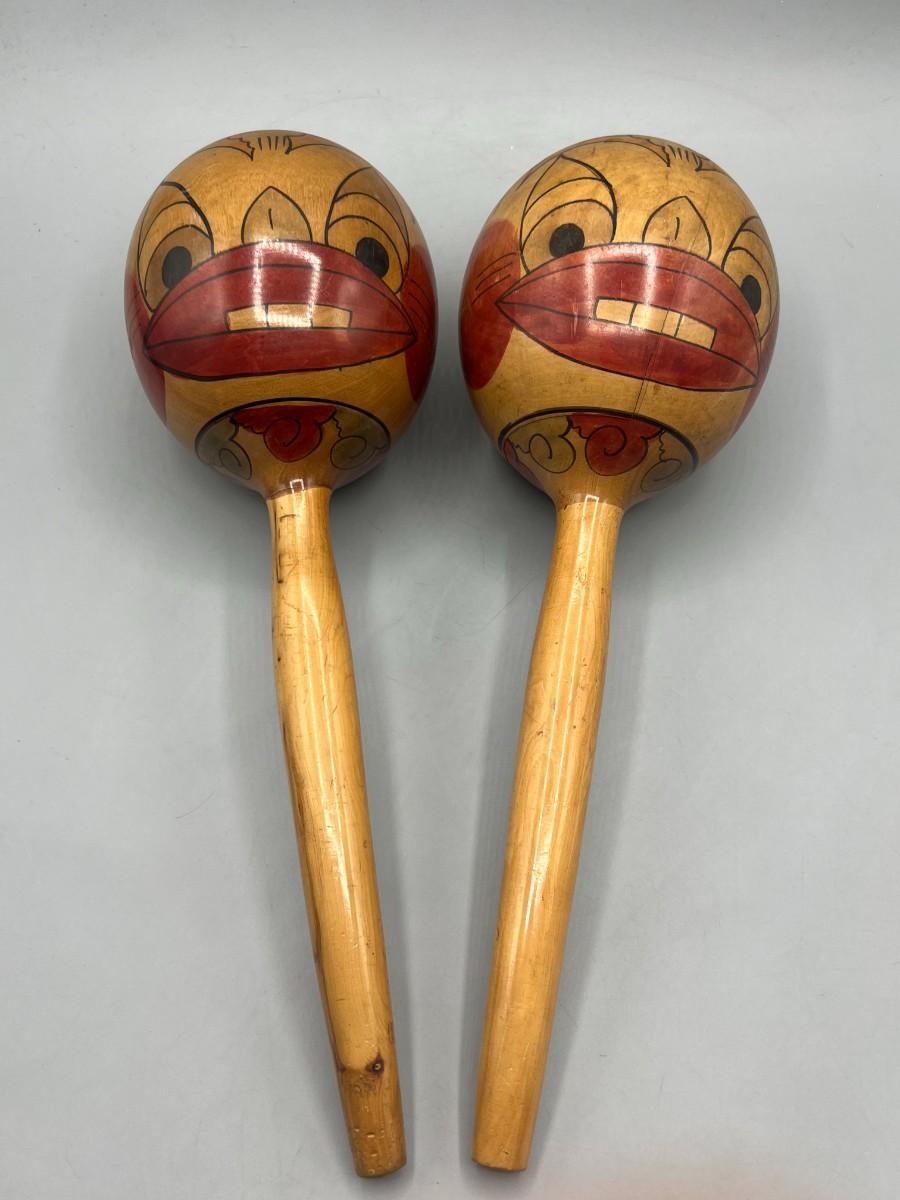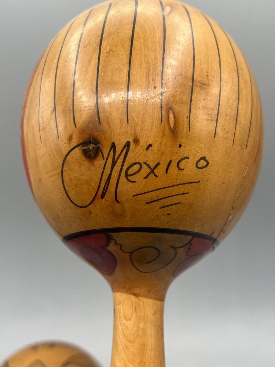 Pair of Retro Made in Mexico Ancient Face Motif Maraca Instrument Shakers